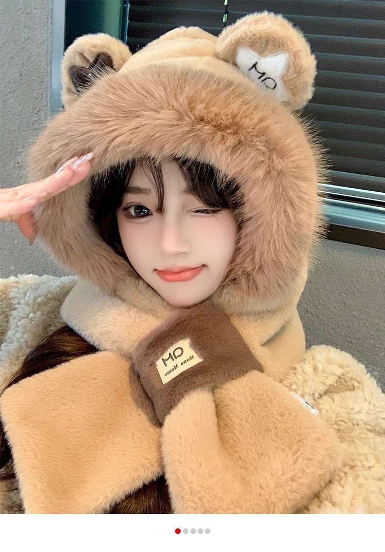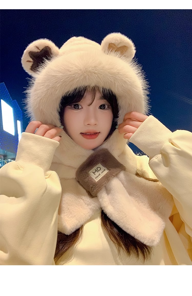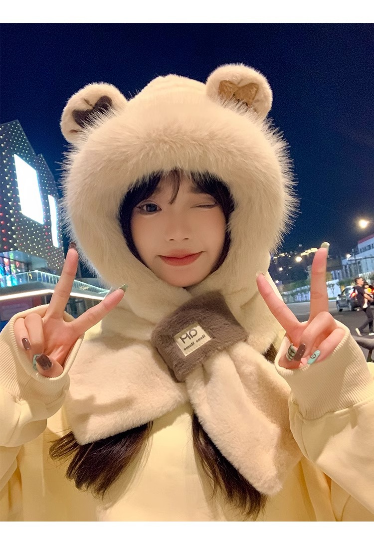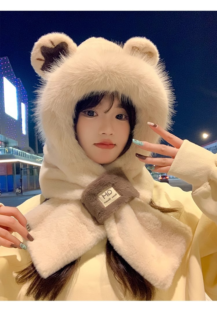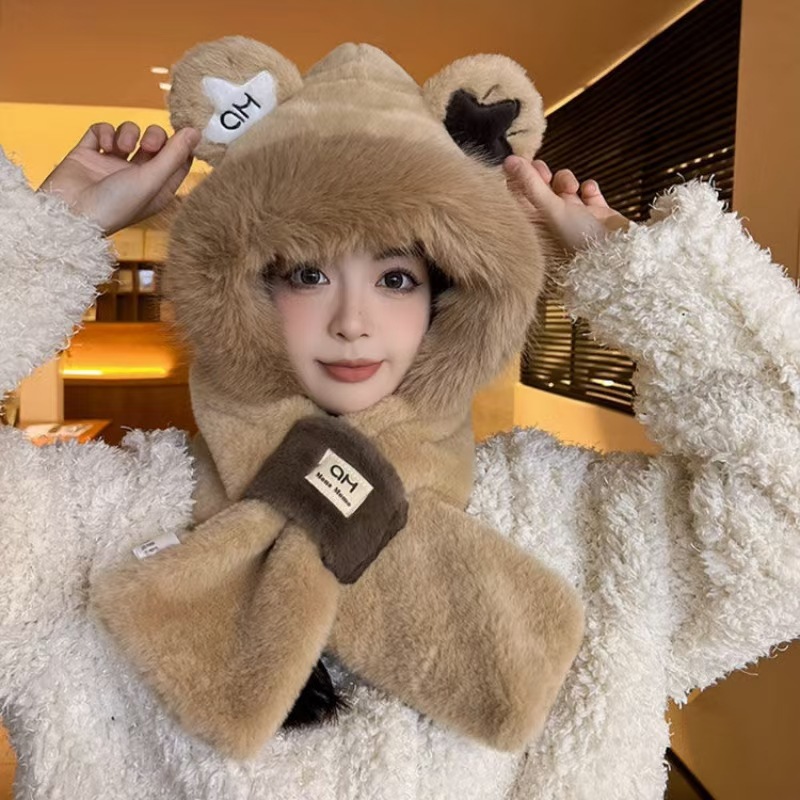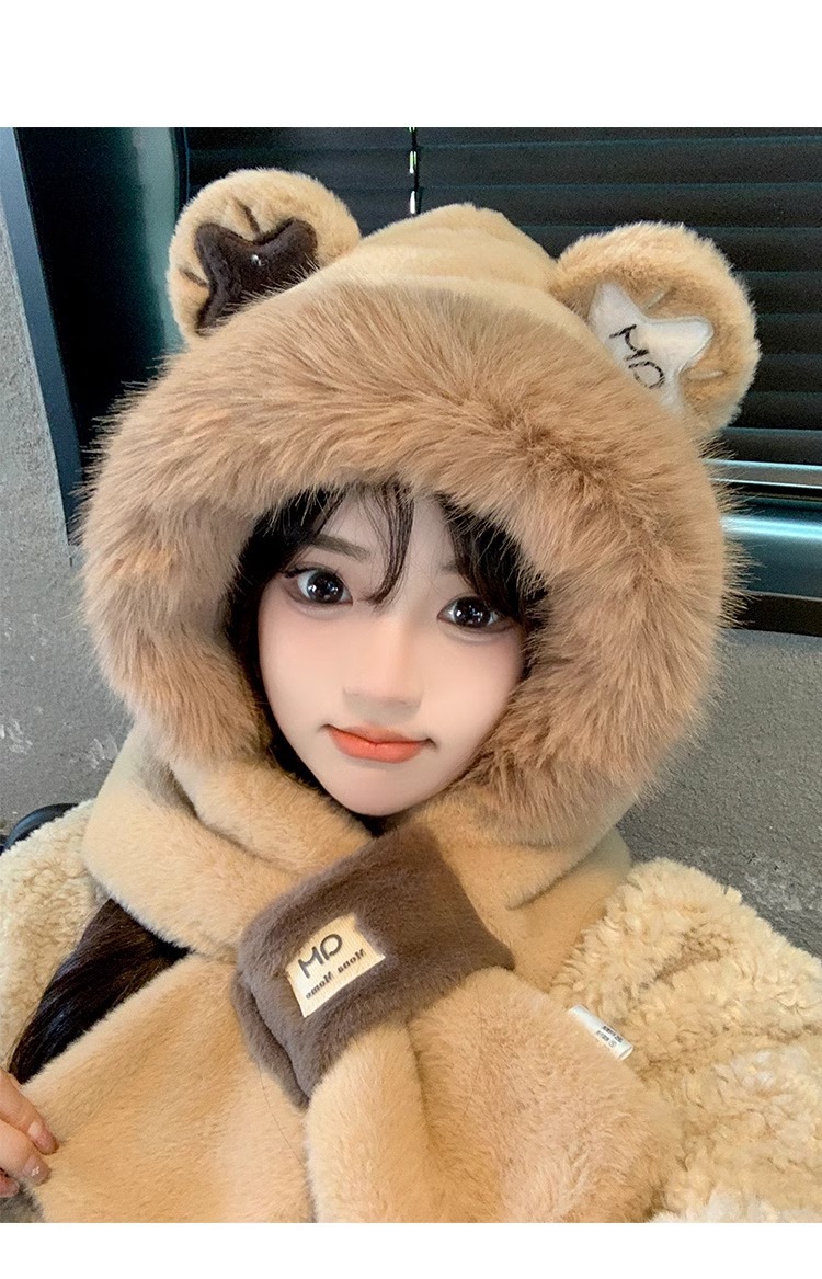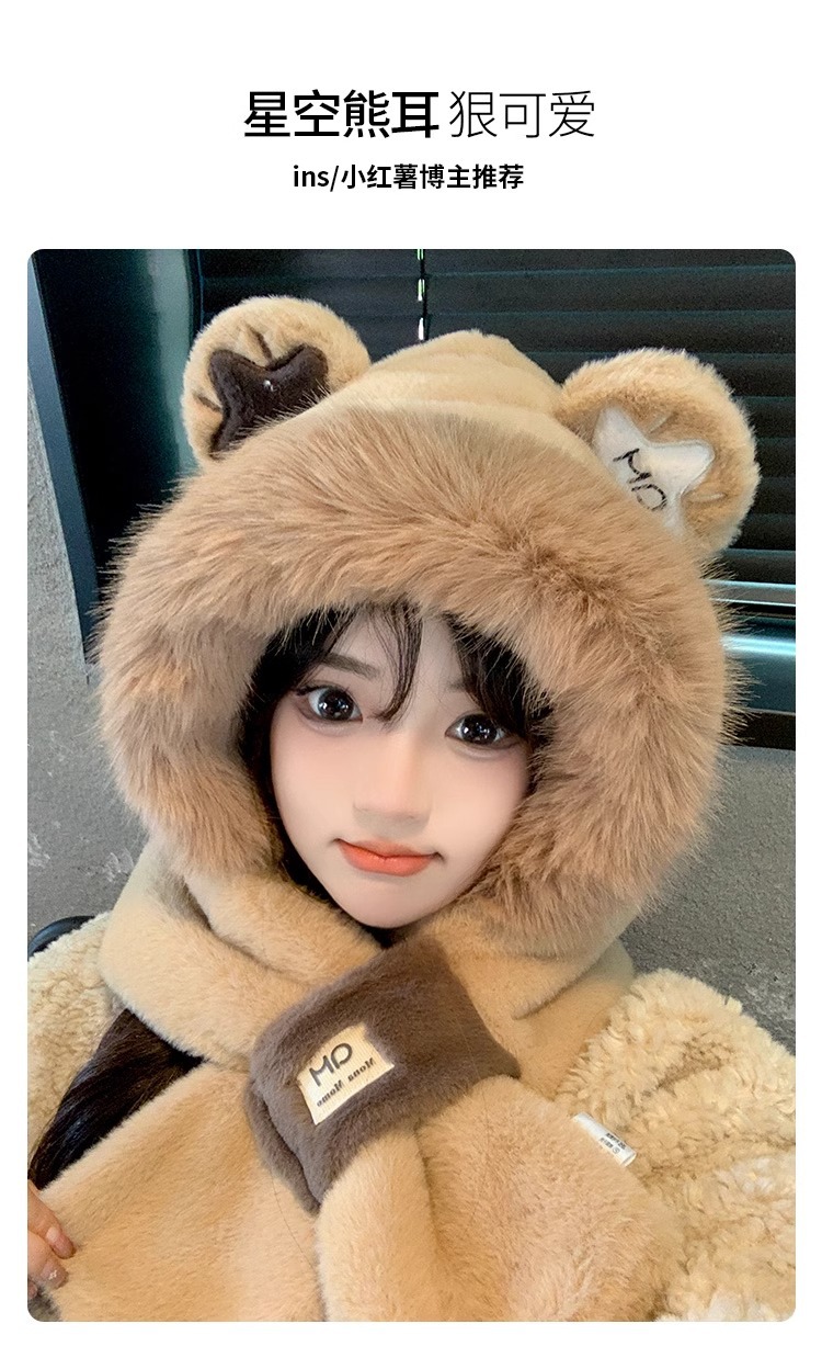 冬季女新款可爱小熊帽子围巾一体两件套加绒加厚保暖时尚兔毛绒帽