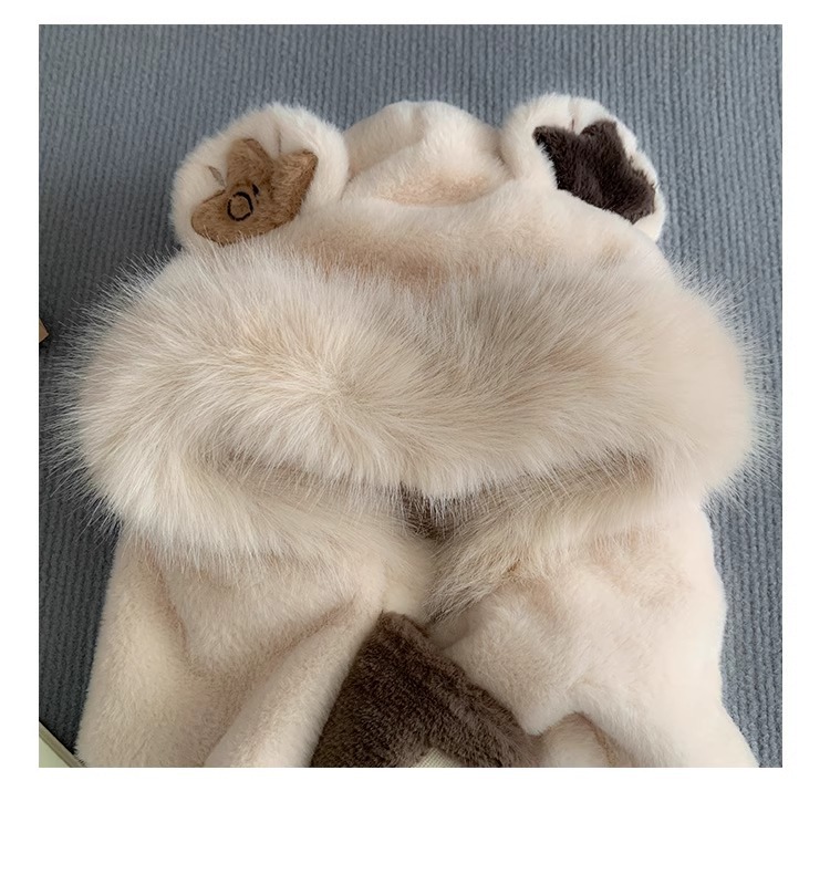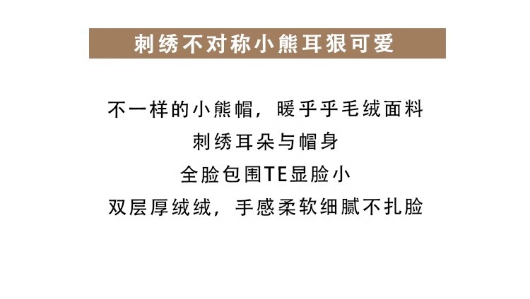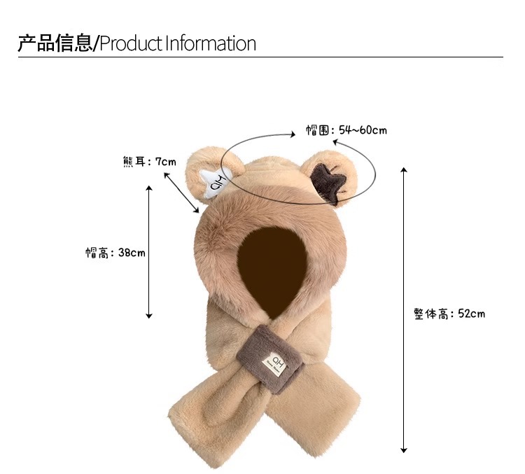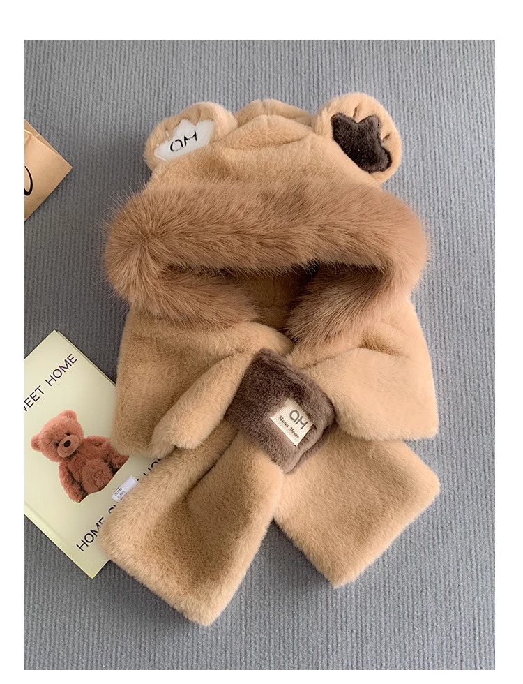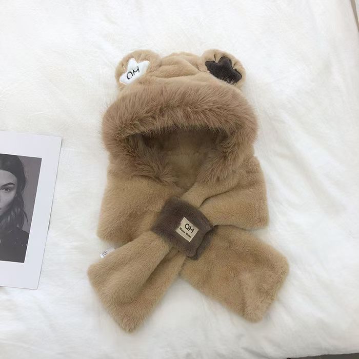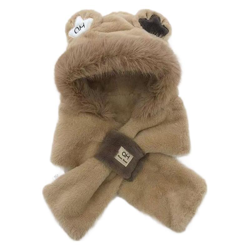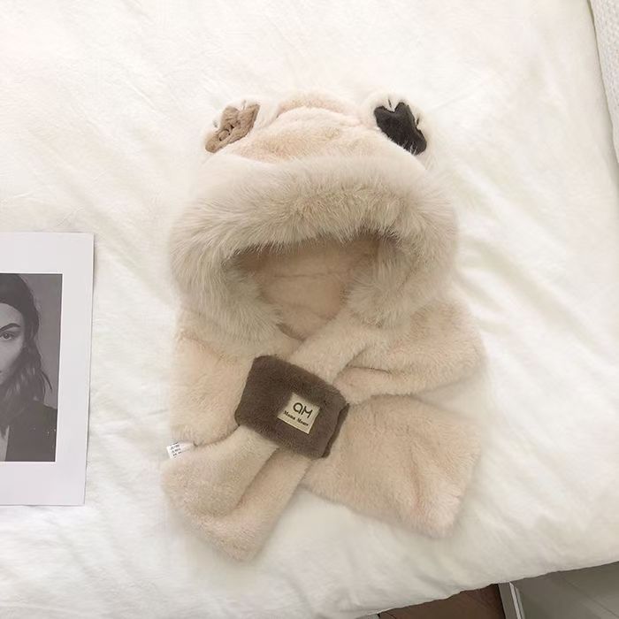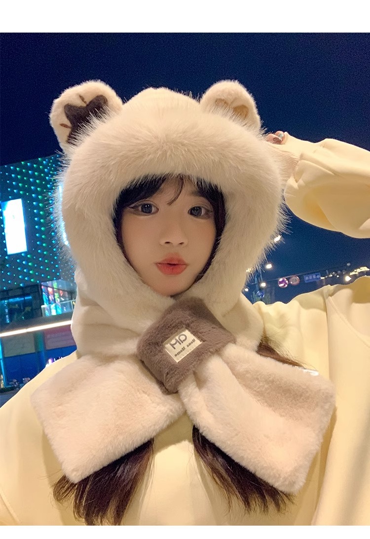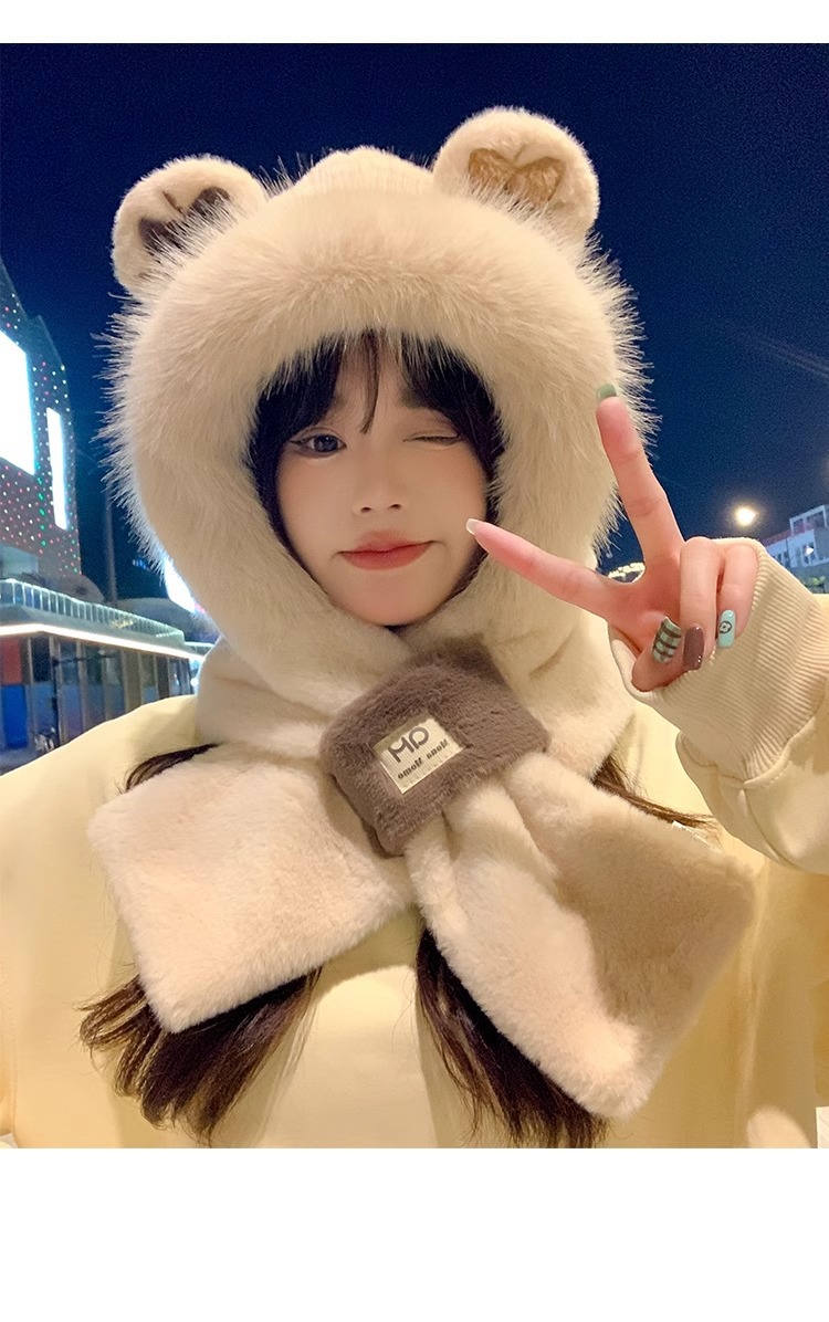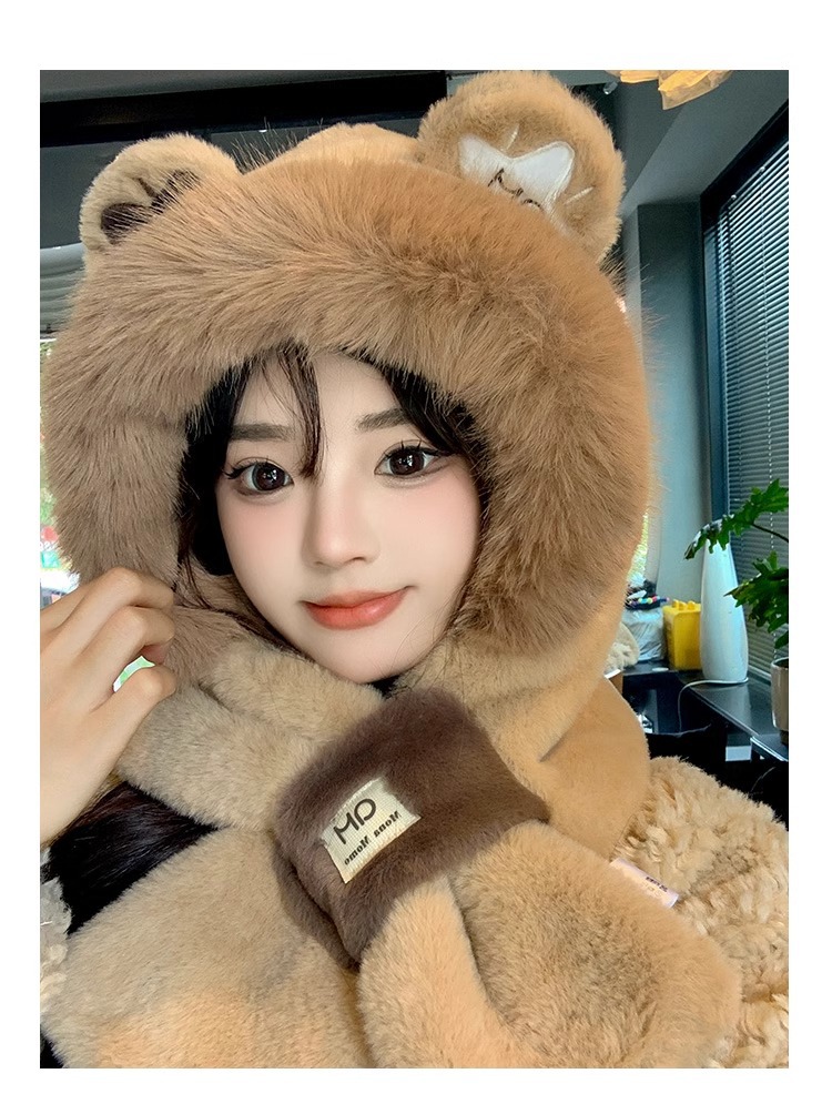 冬季女新款可爱小熊帽子围巾一体两件套加绒加厚保暖时尚兔毛绒帽