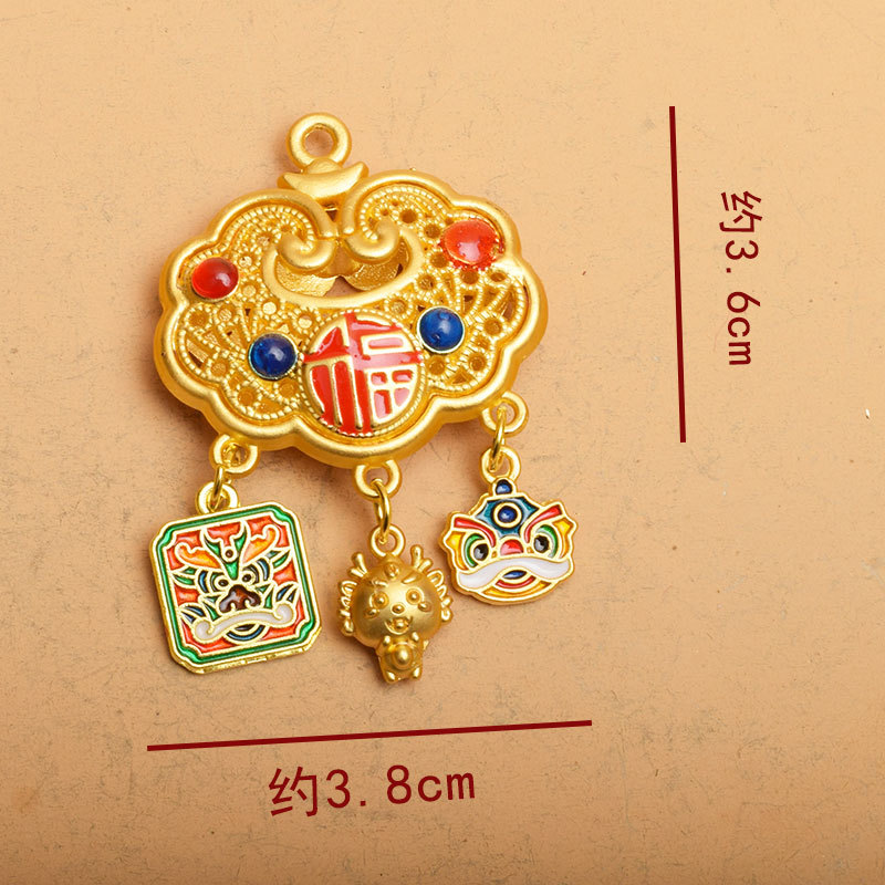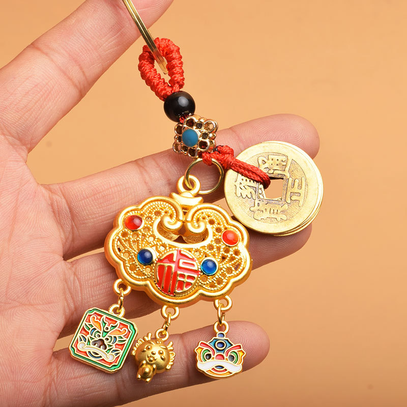 沙金长命富贵锁钥匙扣醒狮2024龙年吊坠项链饰品景区直播小商品