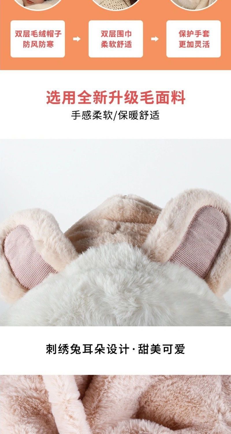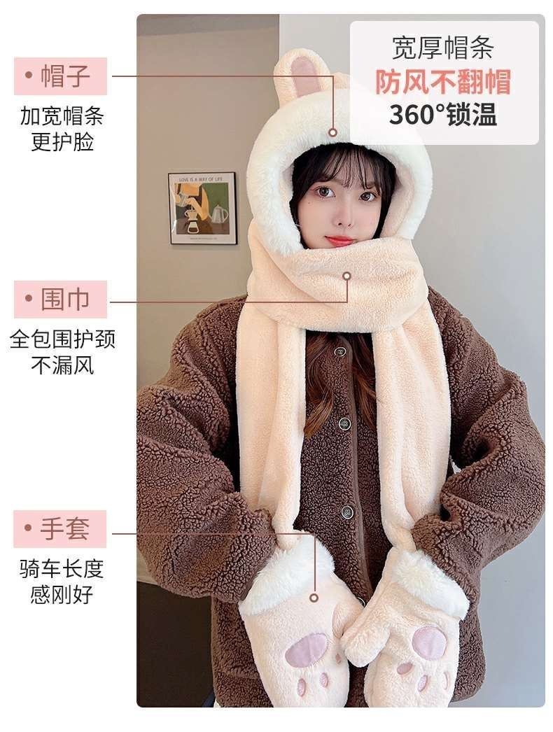 帽子围巾手套一体冬季可爱兔子耳朵保暖三件套加厚护耳百搭毛绒帽