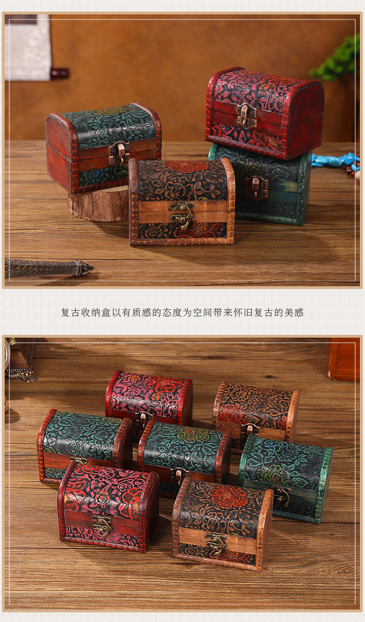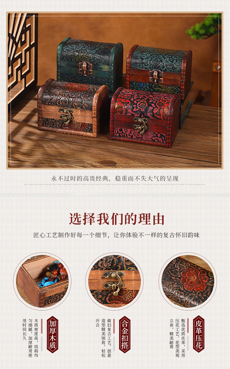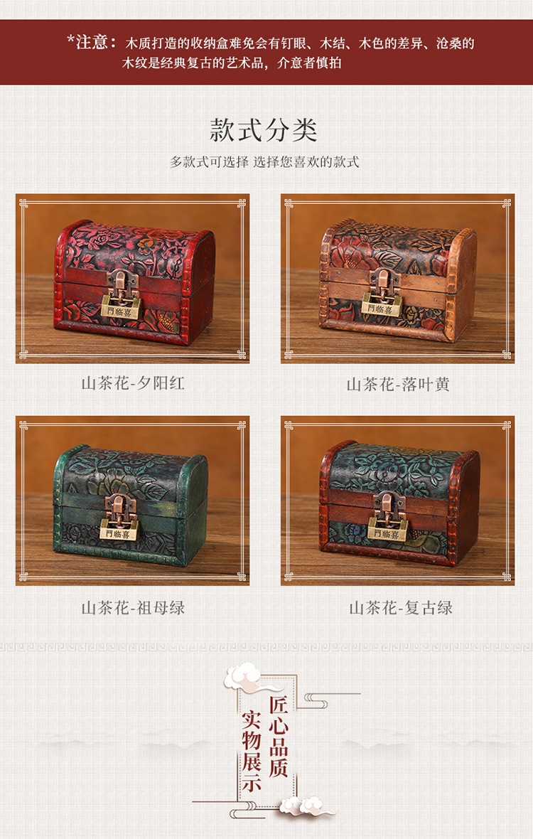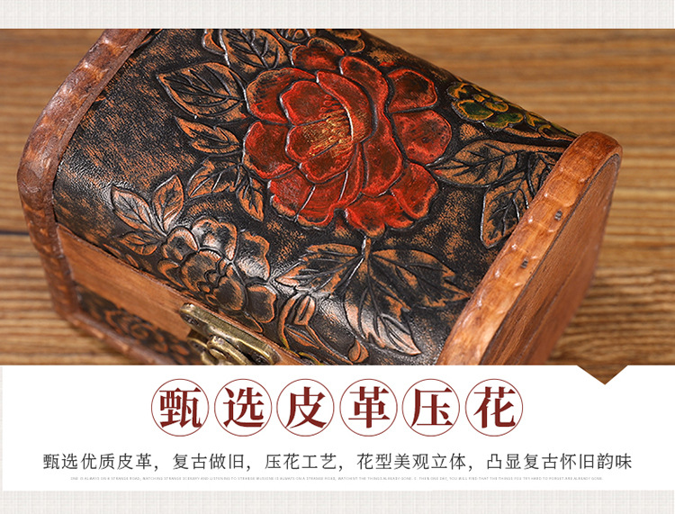中式复古山茶花纹皮革木盒影视拍摄道具饰品珠宝收纳盒带锁百宝箱