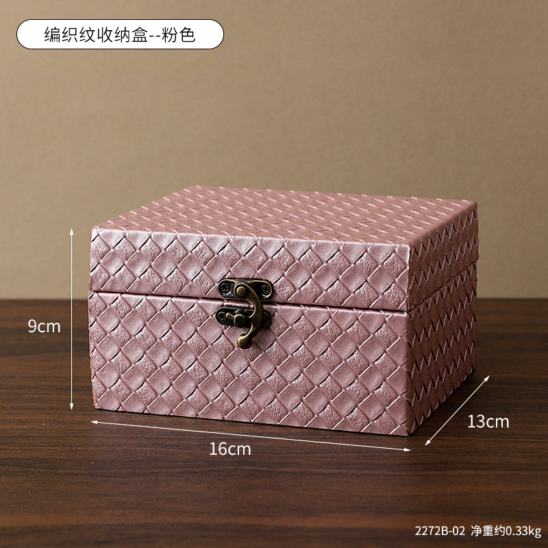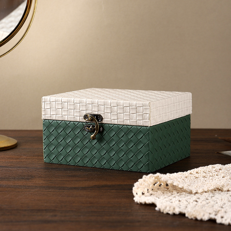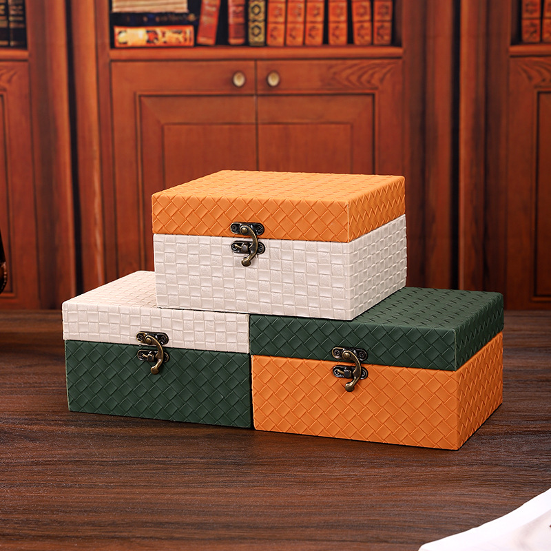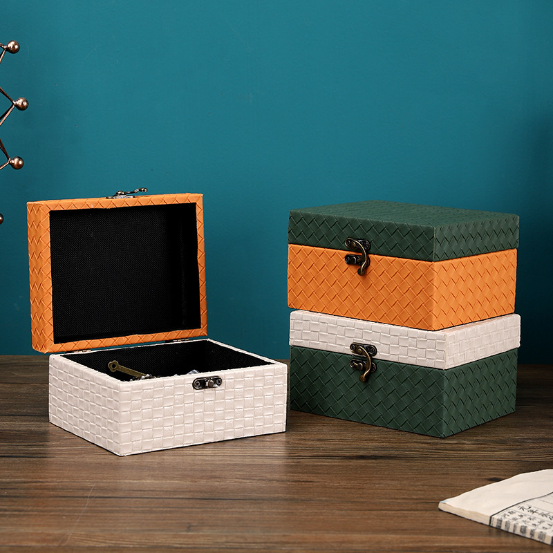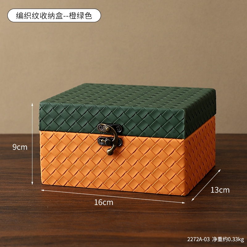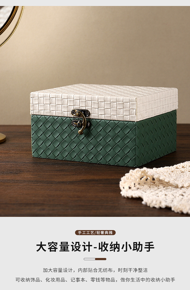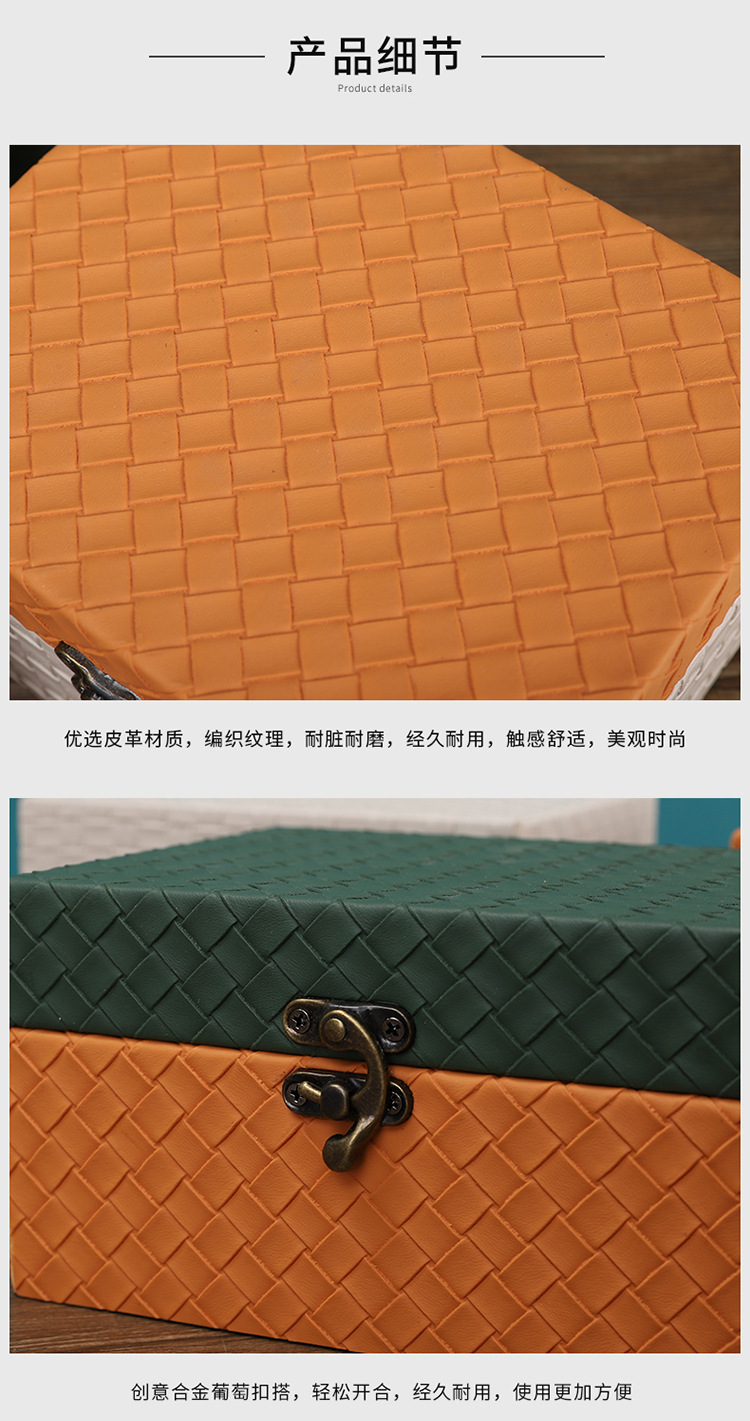 复古拼色皮革编织首饰盒装饰品桌面收纳盒小物件整理储物盒木盒子