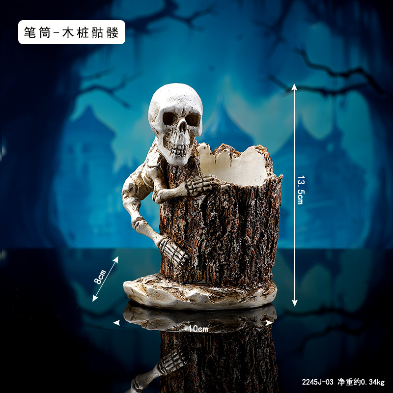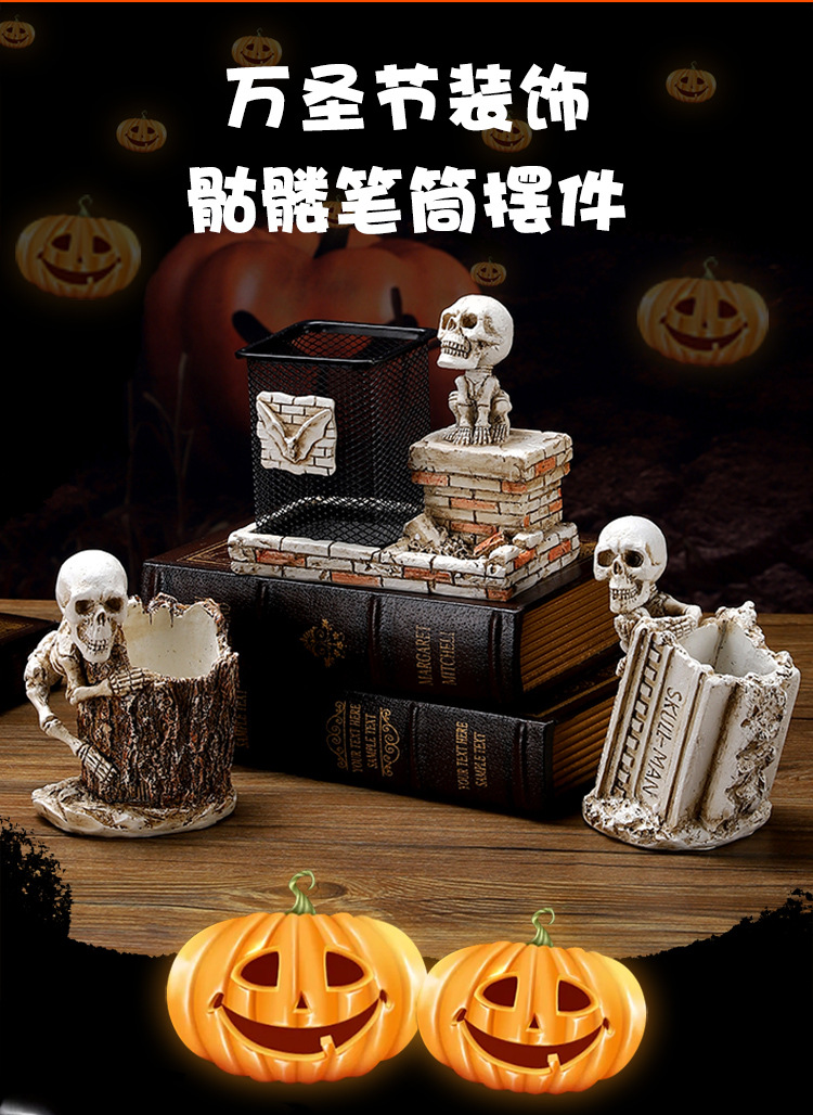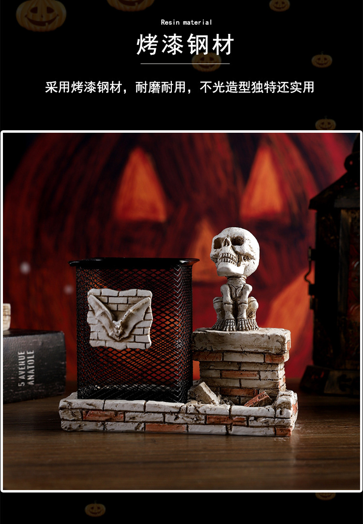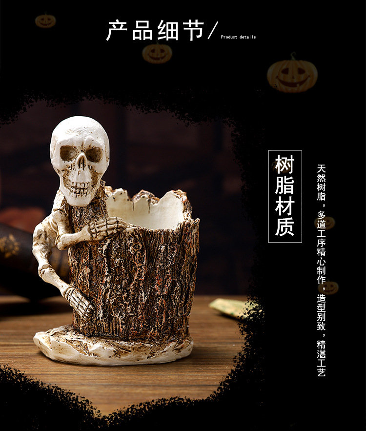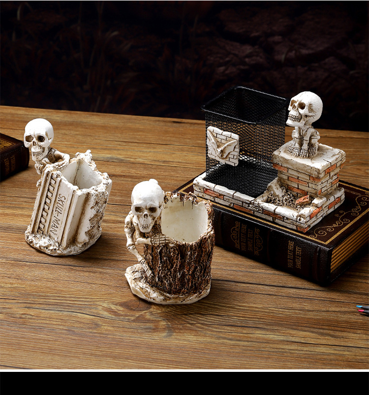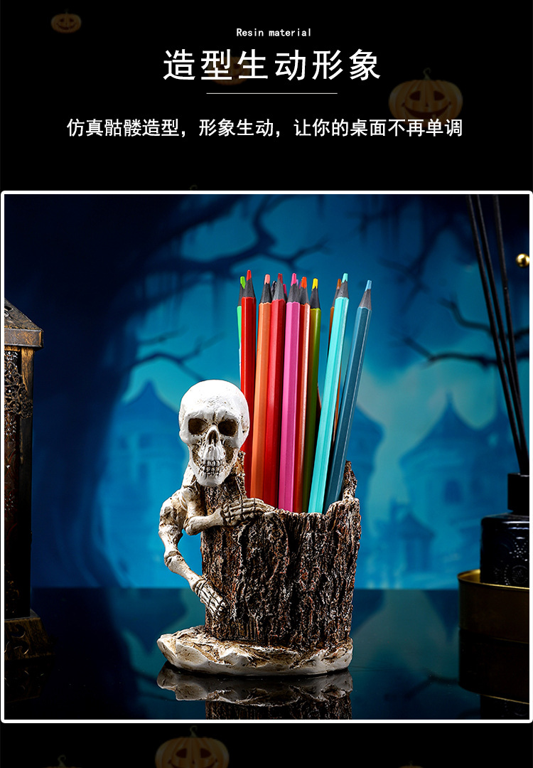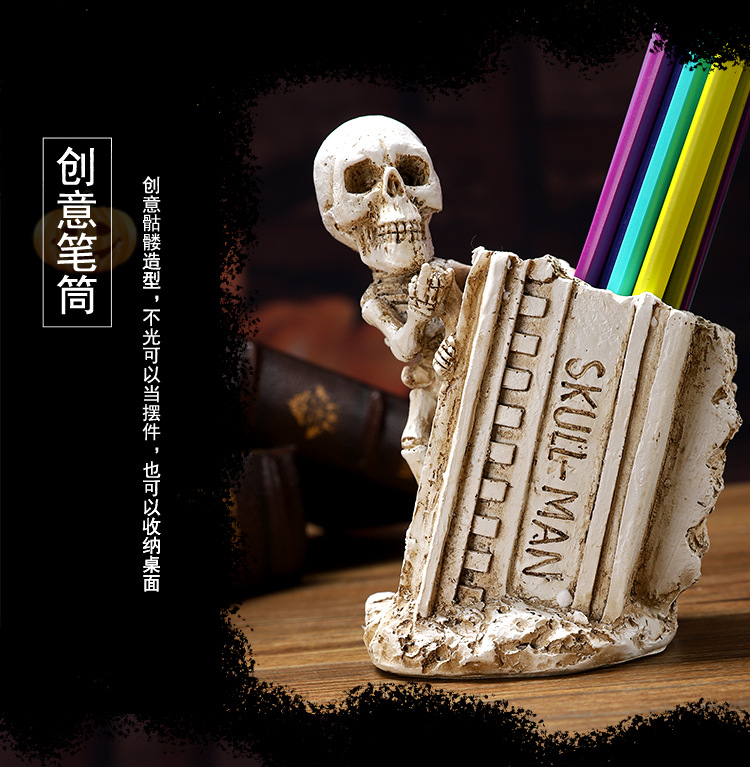 跨境暗黑系万圣节骷髅笔筒家居书房书桌面杂物收纳筒树脂工艺品