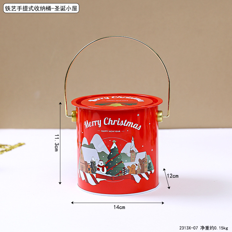 圣诞手提圆桶铁艺收纳盒儿童带盖曲奇饼干包装盒伴手礼红色空盒子