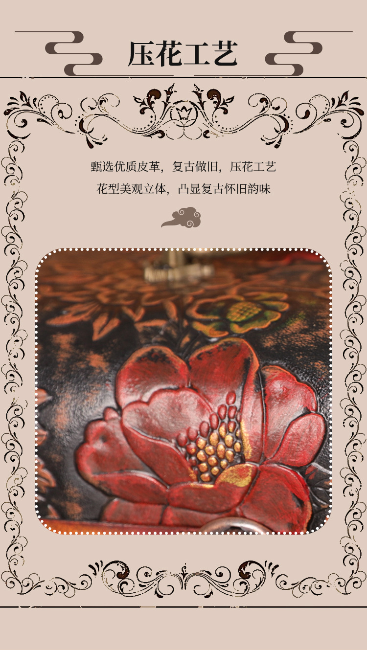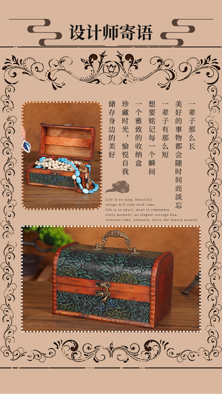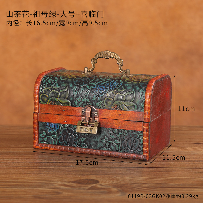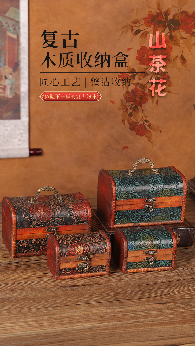 复古山茶花纹木盒桌面百宝箱杂物收纳盒密码锁PU皮革首饰储物盒