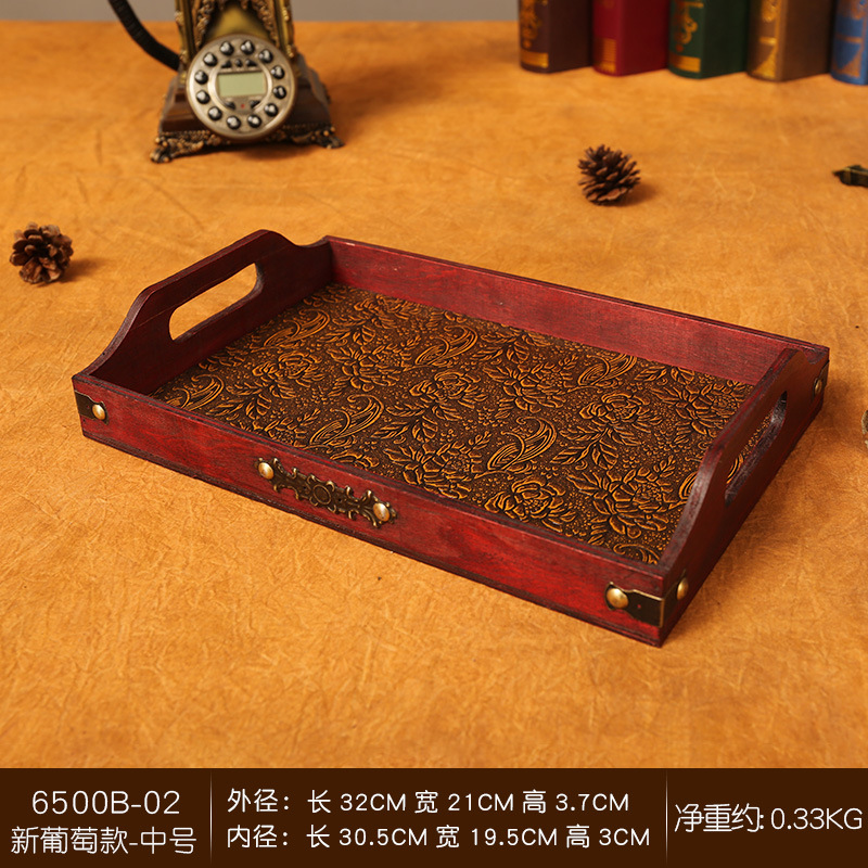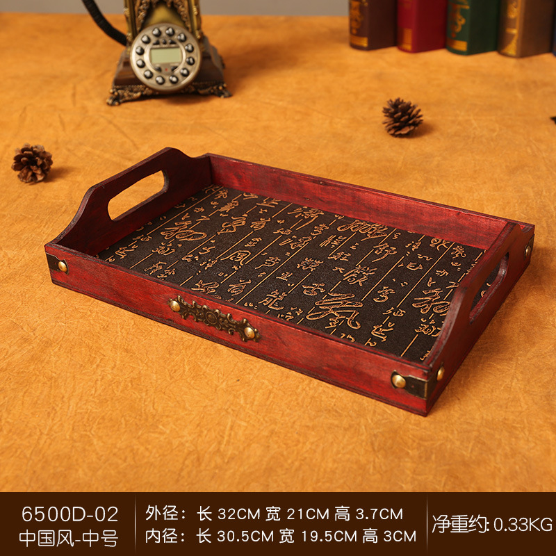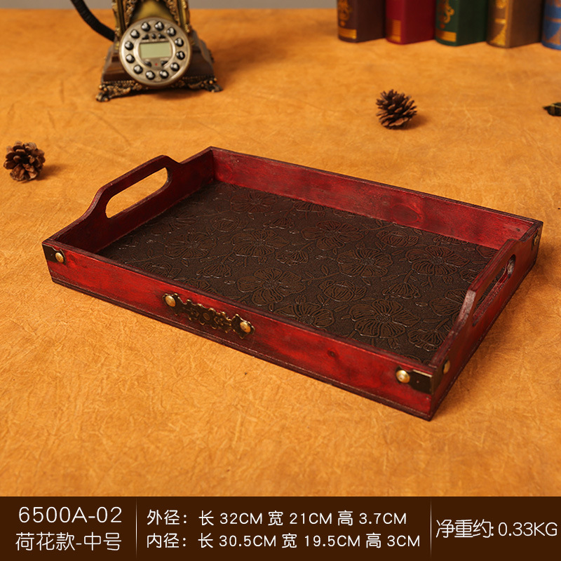 中式木质托盘荷花书法纹皮革方形果盘复古茶盘商用茶楼饭店招待用