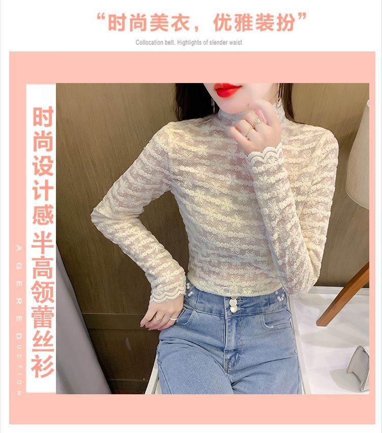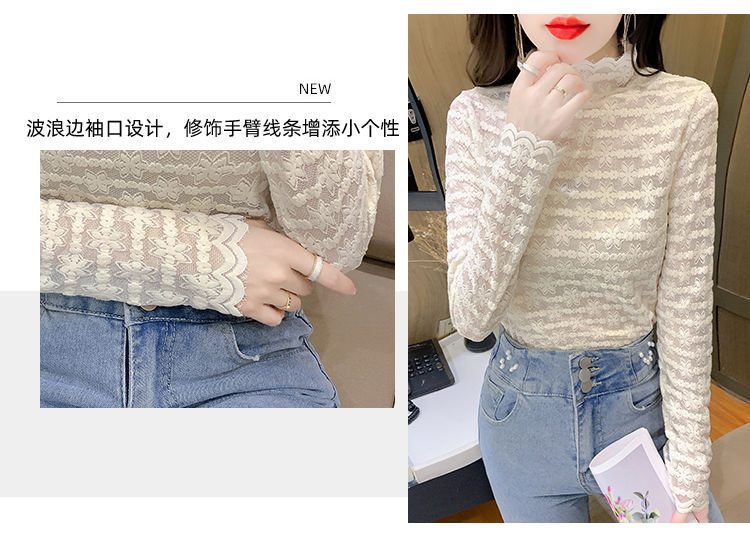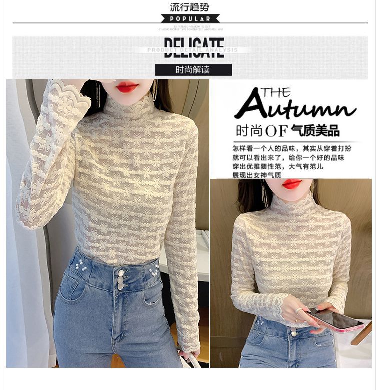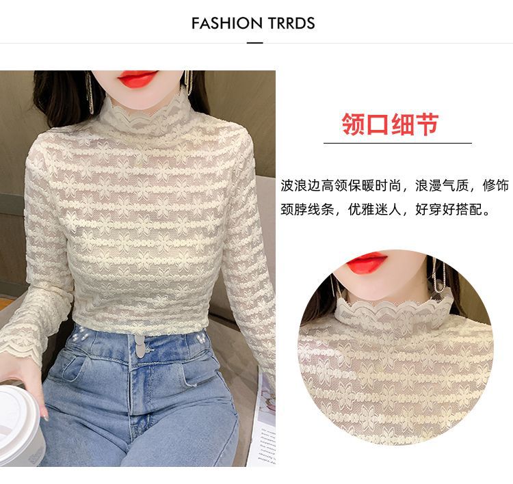 2234加绒秋冬新款高领薄款蕾丝打底衫女士洋气小衫长袖网纱上衣潮