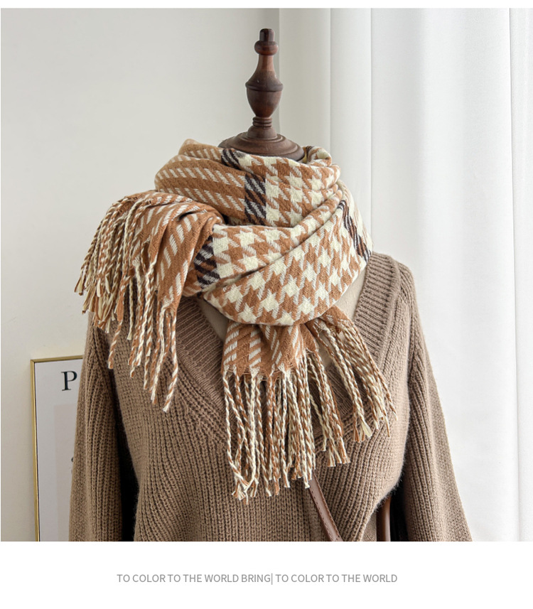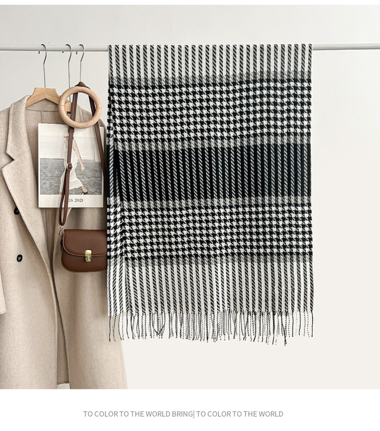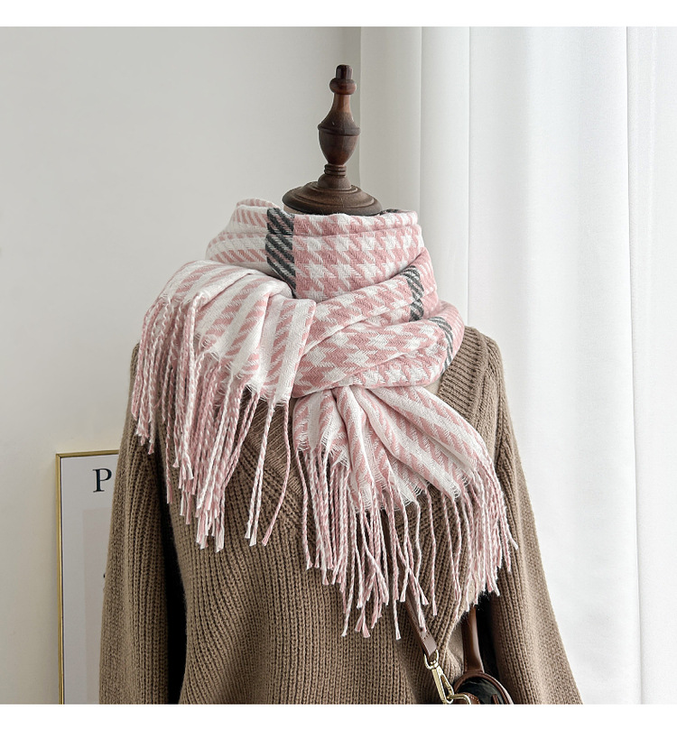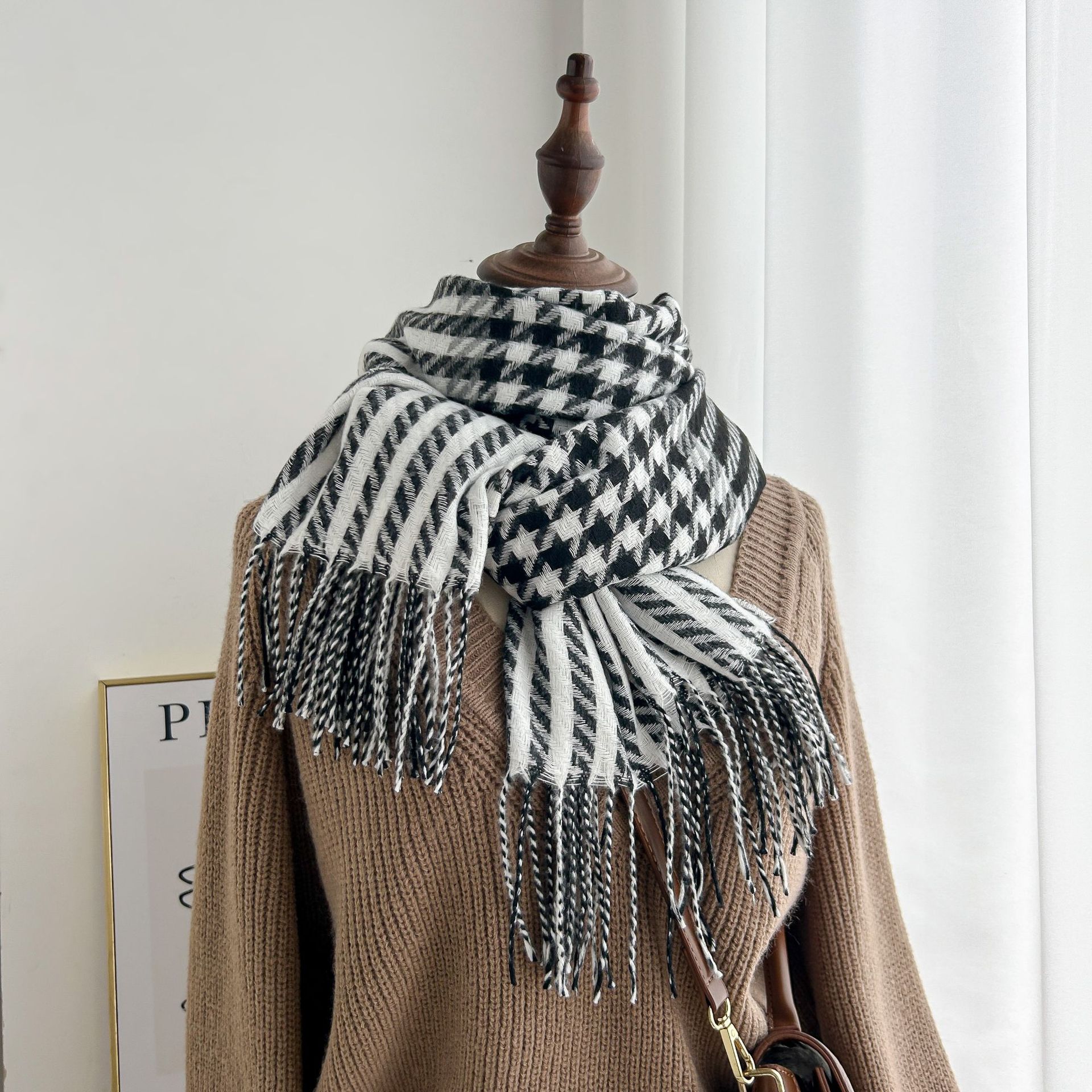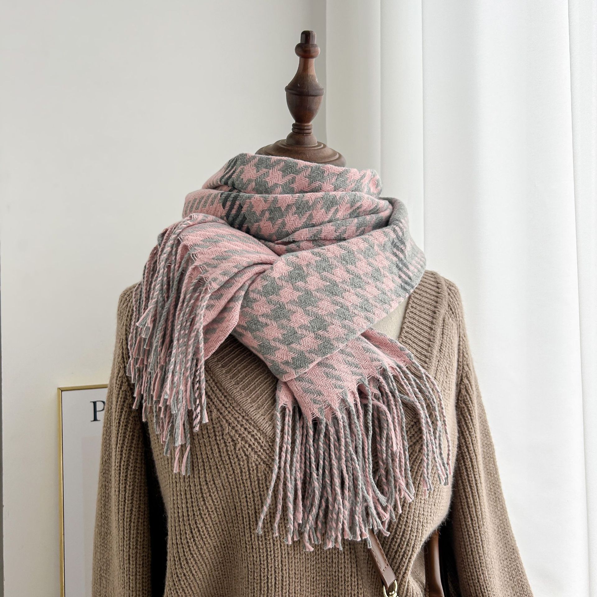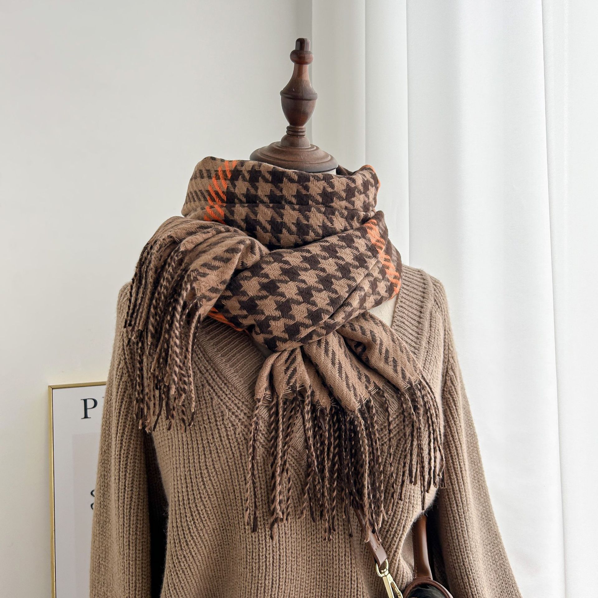 新款千鸟格仿羊绒围巾欧美街头流苏格子围巾女秋冬保暖时尚百搭