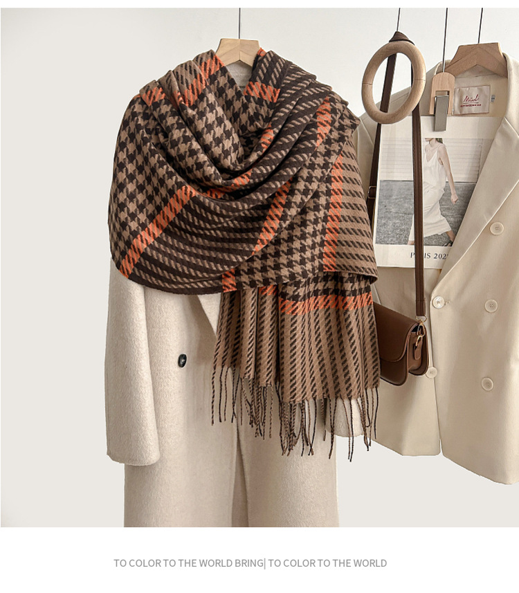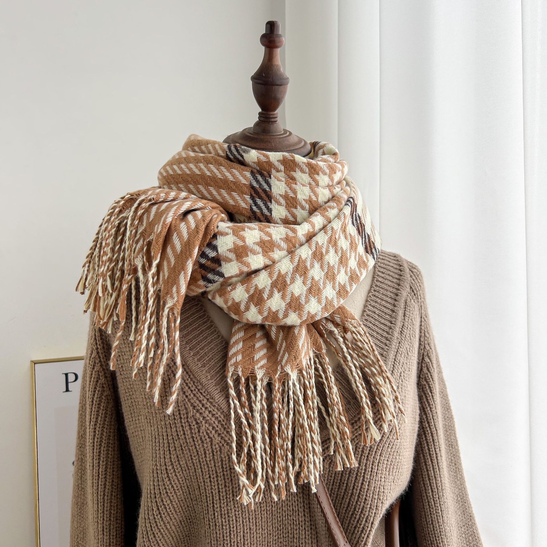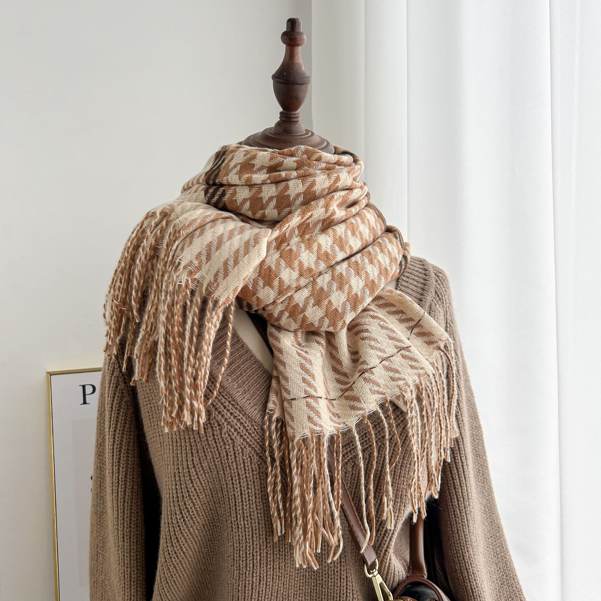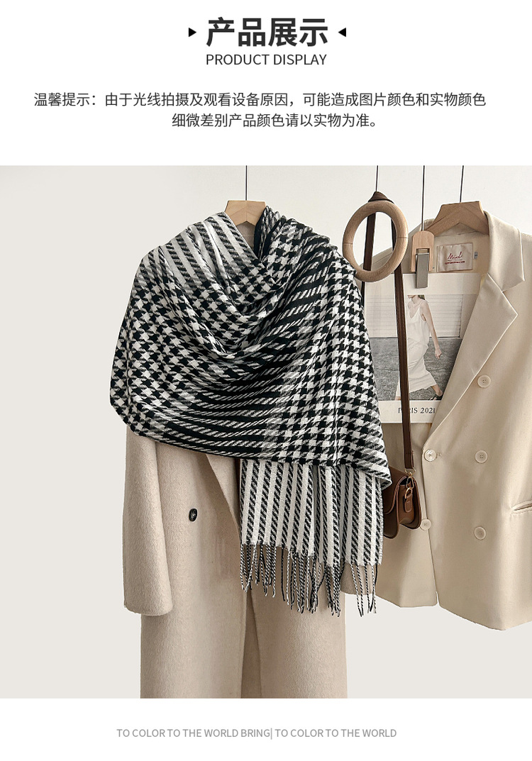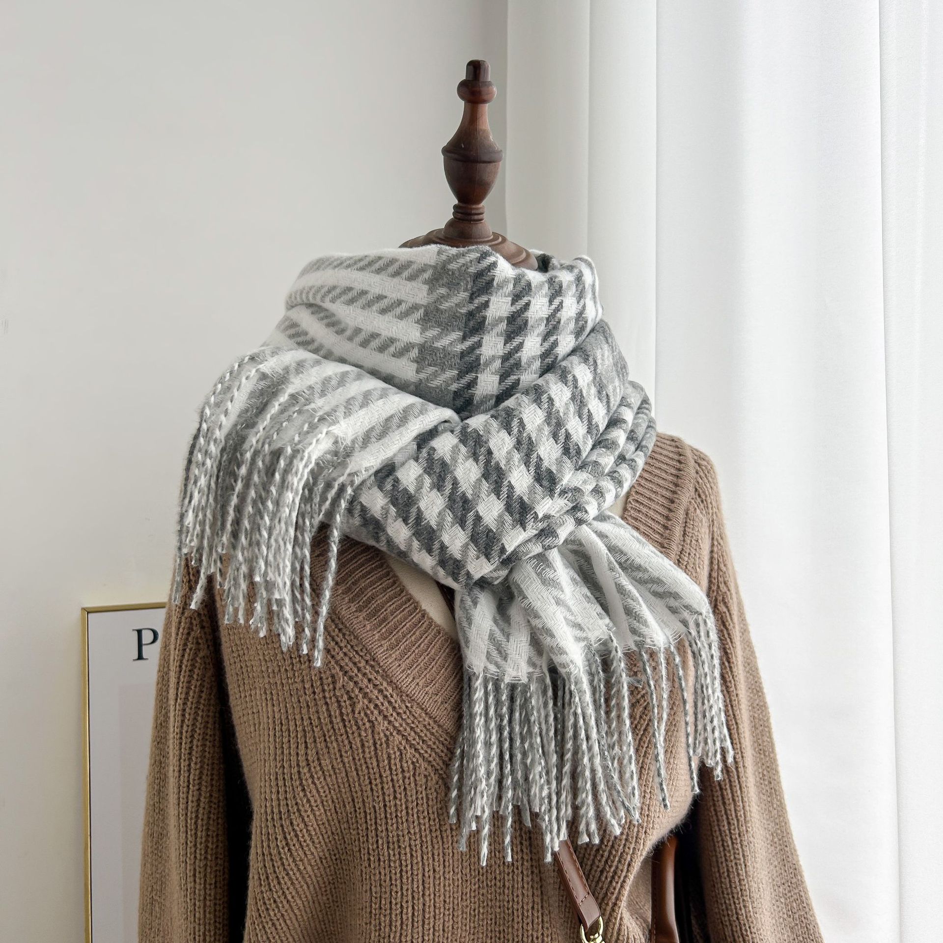 新款千鸟格仿羊绒围巾欧美街头流苏格子围巾女秋冬保暖时尚百搭