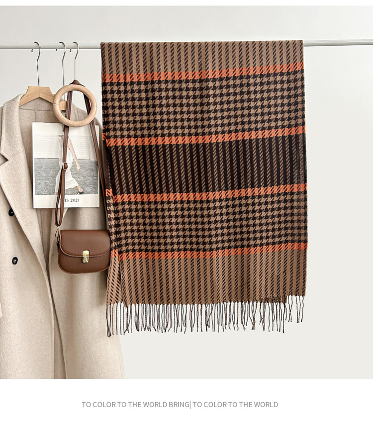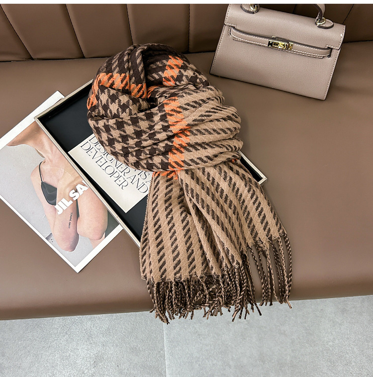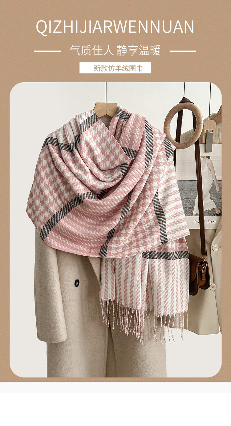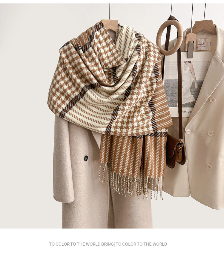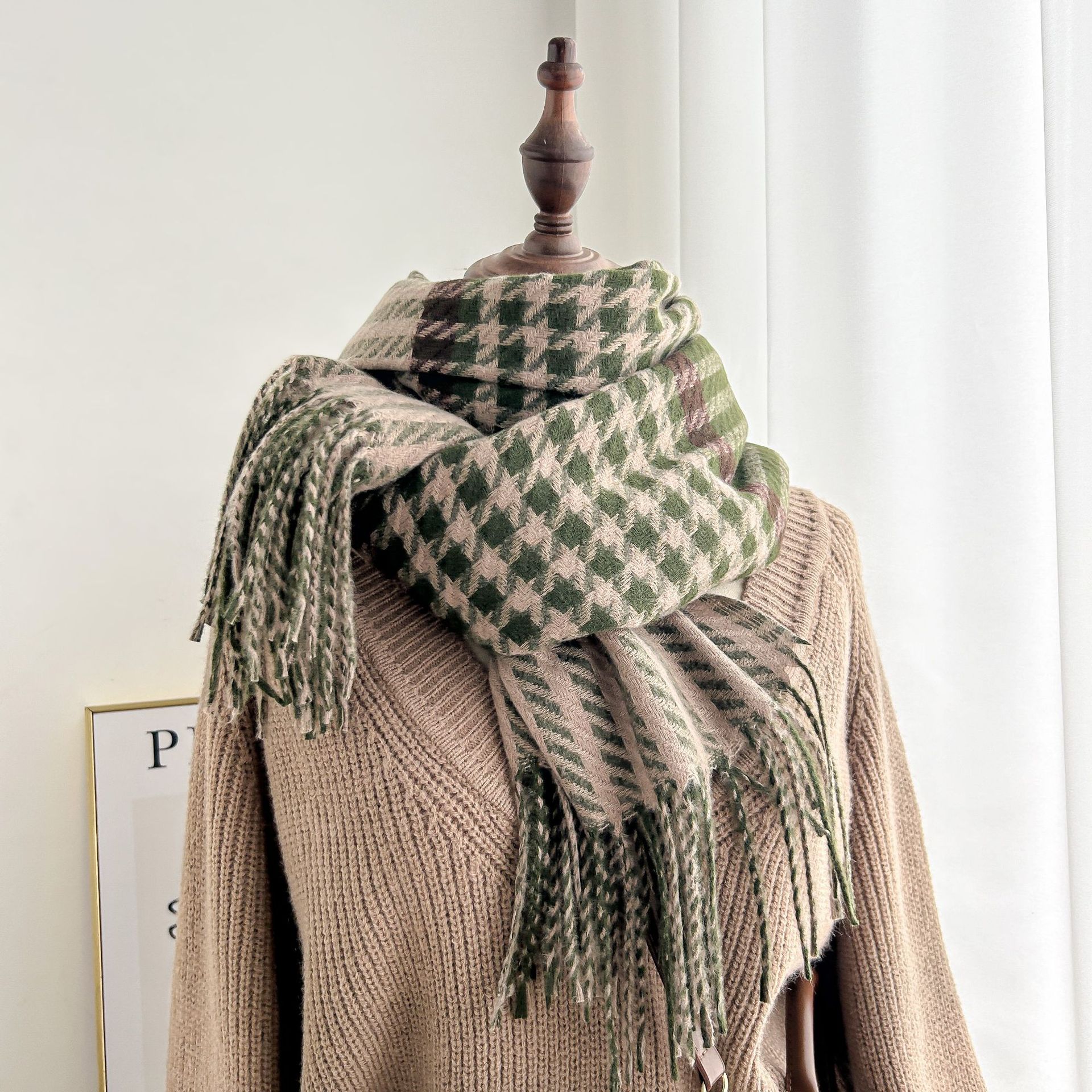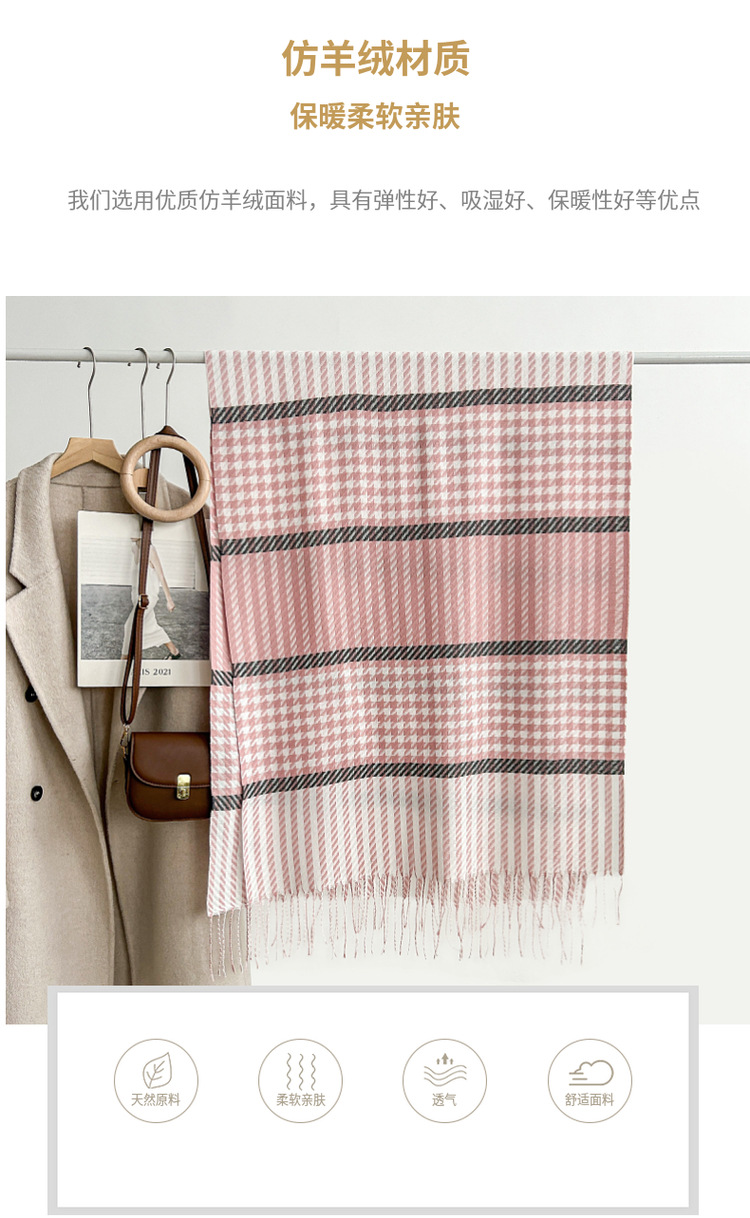 新款千鸟格仿羊绒围巾欧美街头流苏格子围巾女秋冬保暖时尚百搭