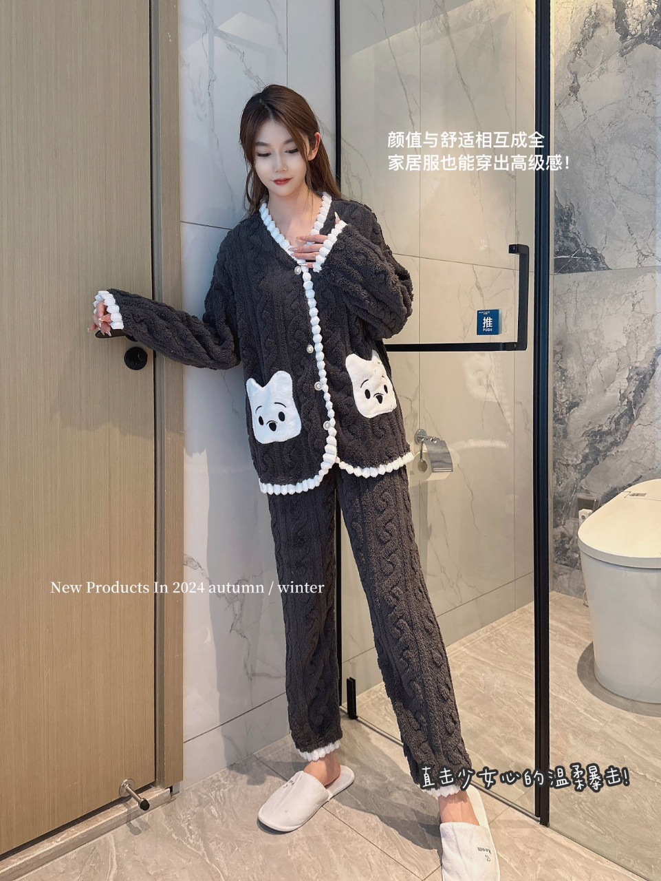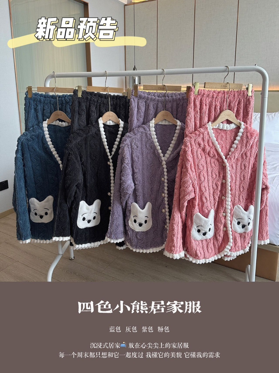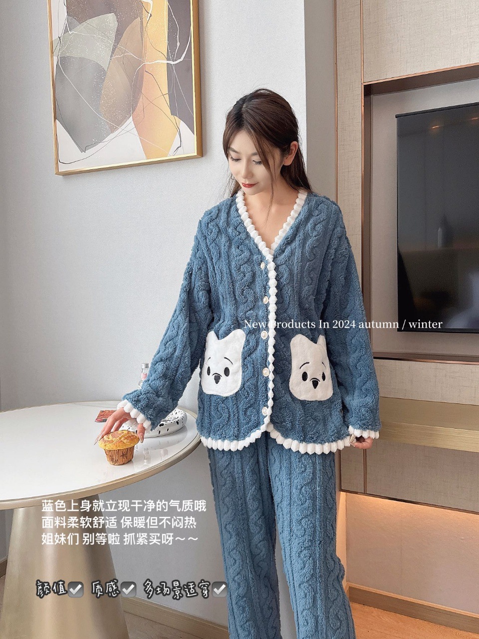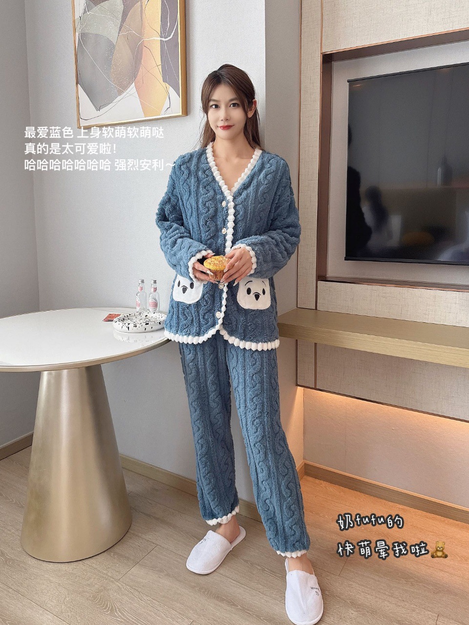 冬季新款睡衣女小熊开衫甜美长毛绒家居服套装麻花绒加厚可外穿
