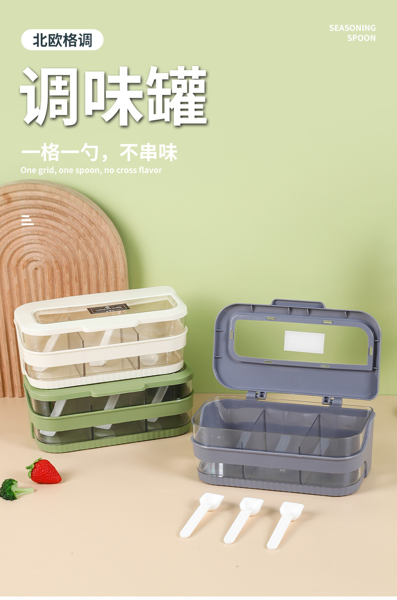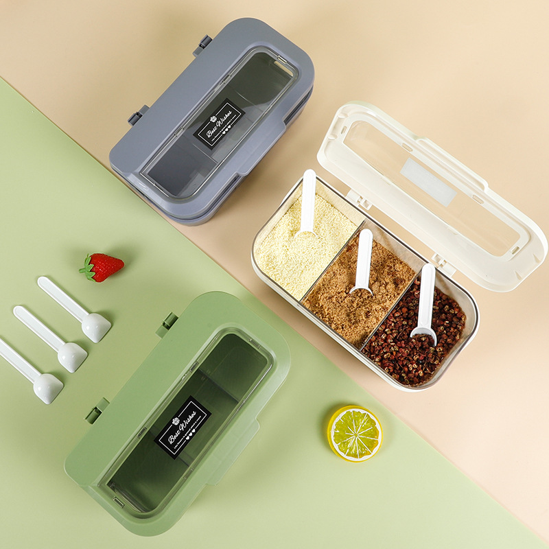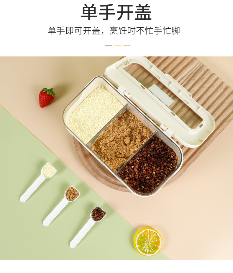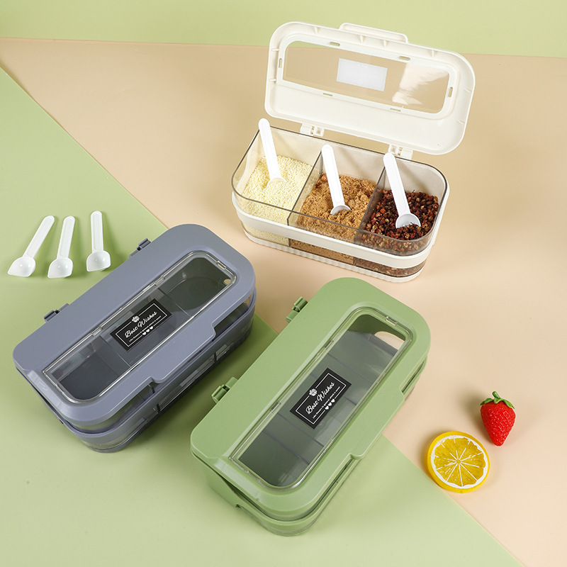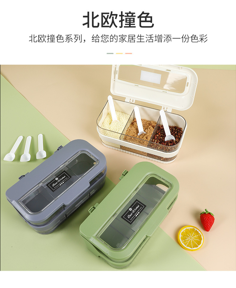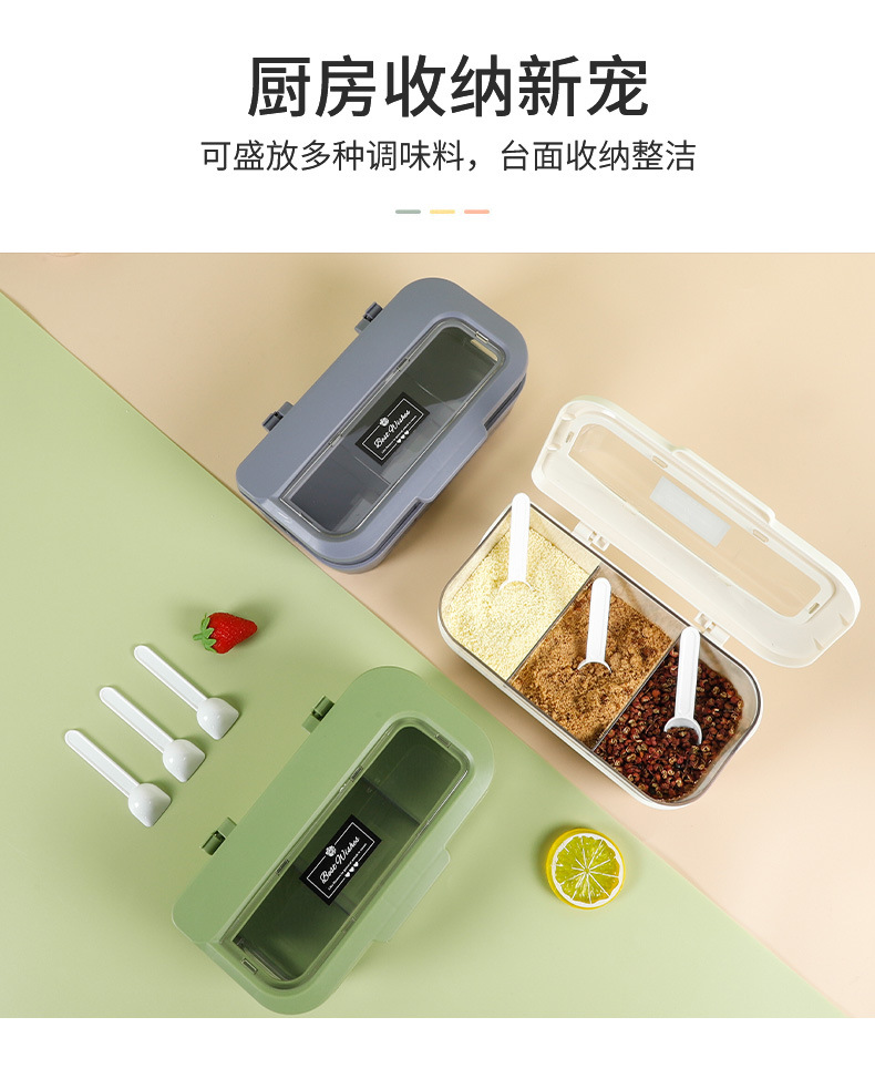 新款分格厨房调味盒收纳盐味精防潮调料盒家用三格调料罐批发