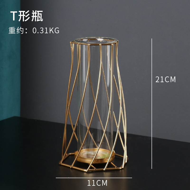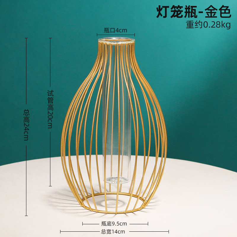 北欧铁艺金色玻璃灯笼花瓶透明水培插花器摆件客厅餐厅家居装饰品