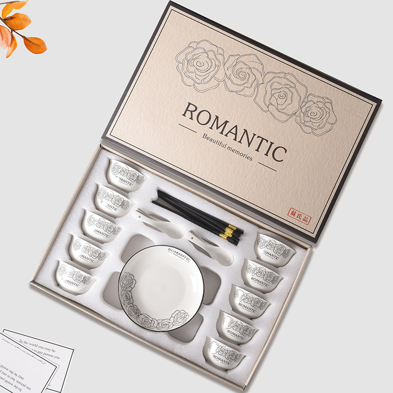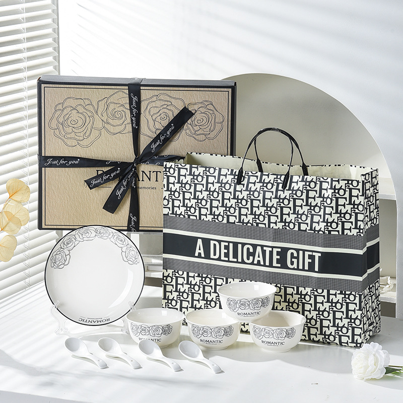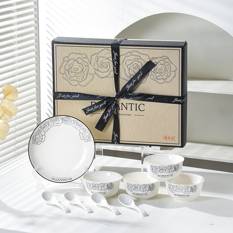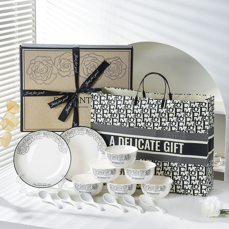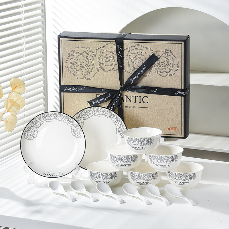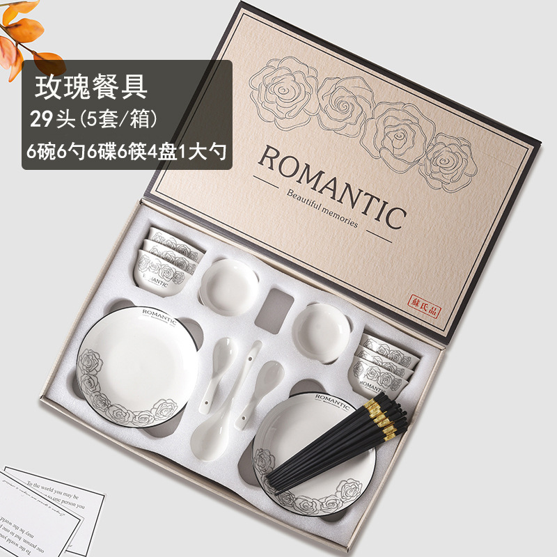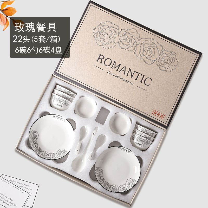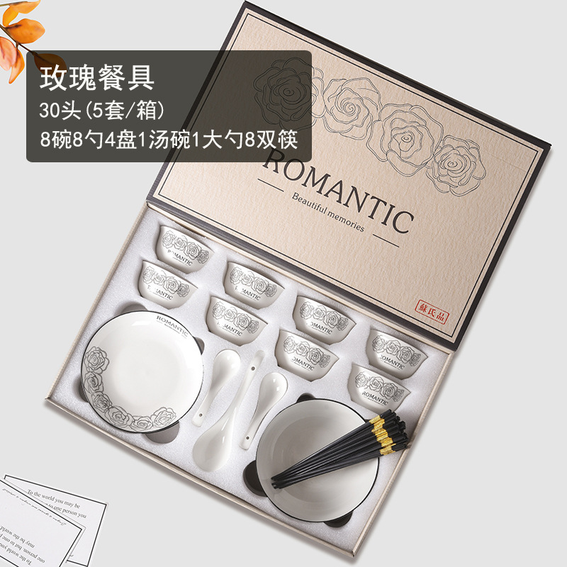 赫本风玫瑰陶瓷餐具碗筷套装伴手礼开业简约礼品家用批发套碗礼盒