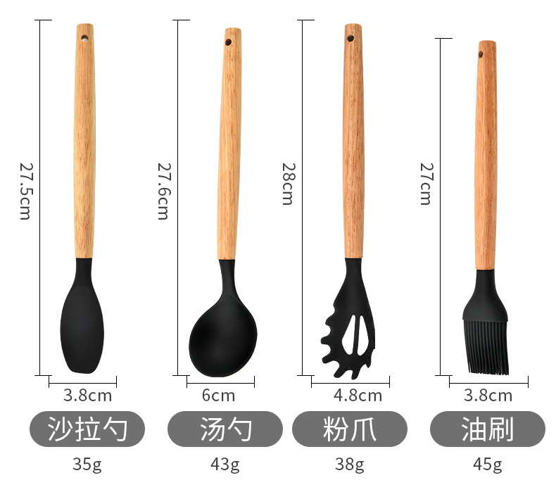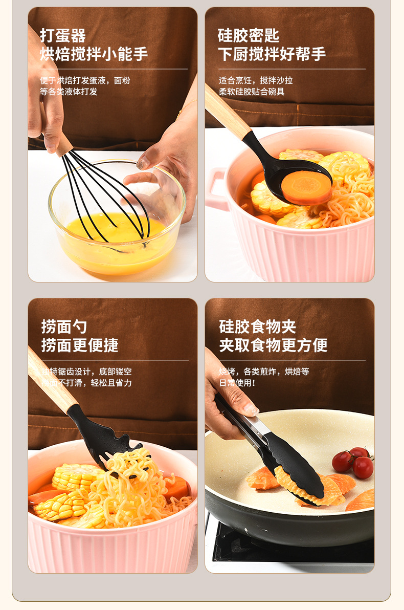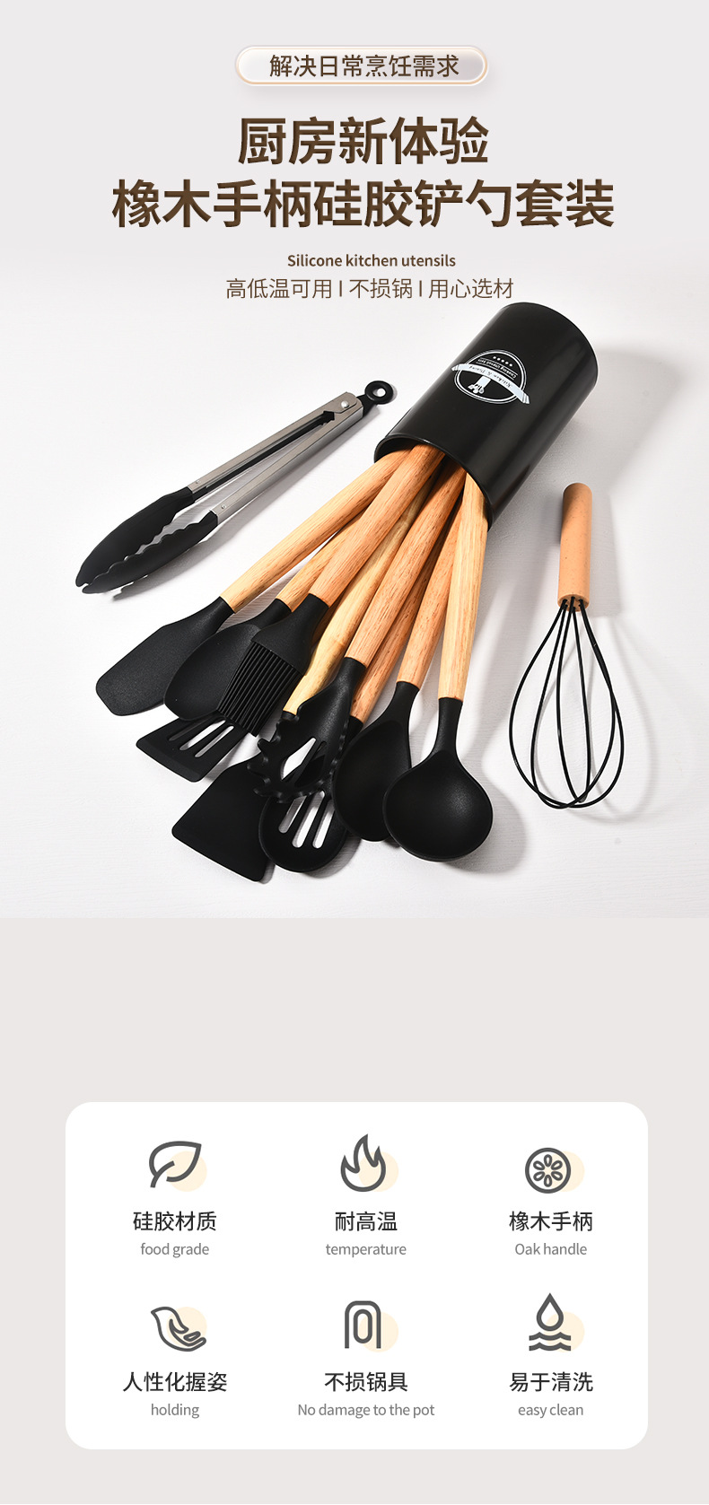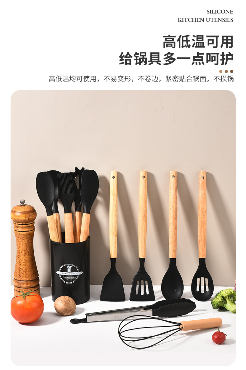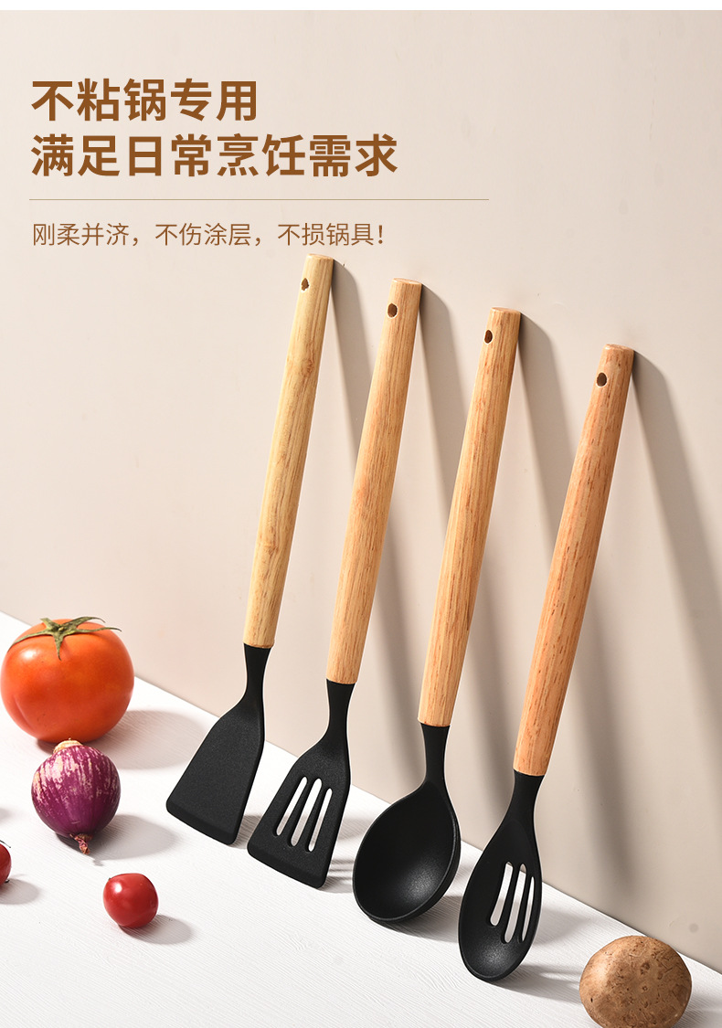 木柄硅胶厨具12件套 不粘锅烹饪铲勺 耐高温硅胶厨具十二件套装