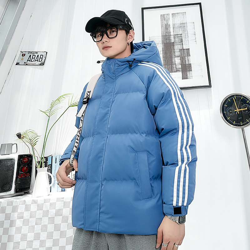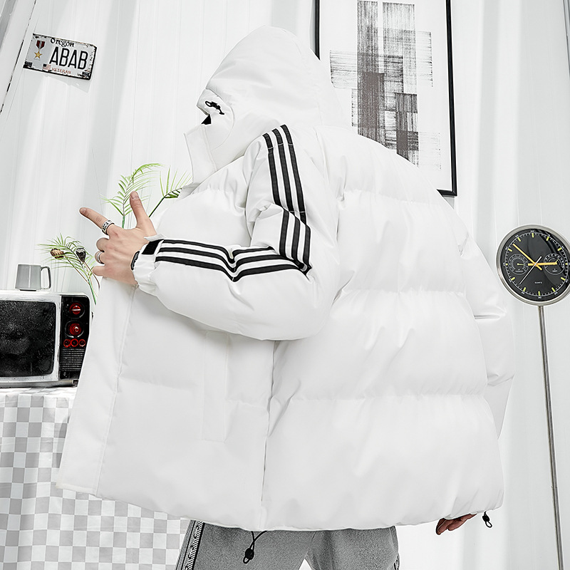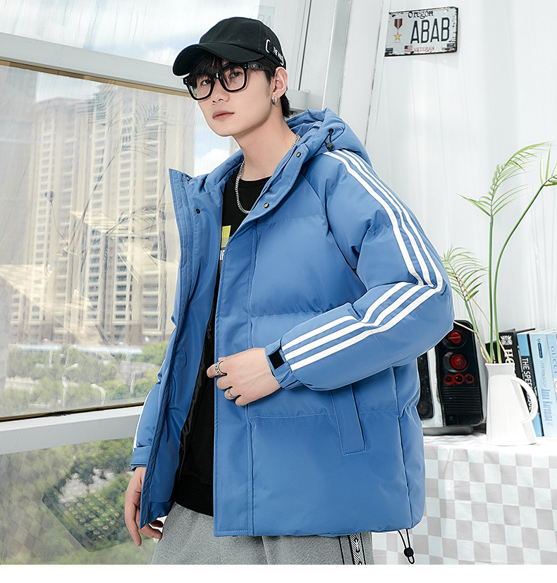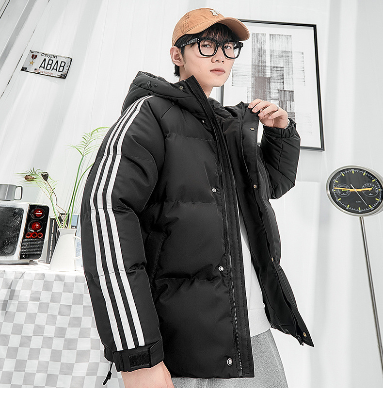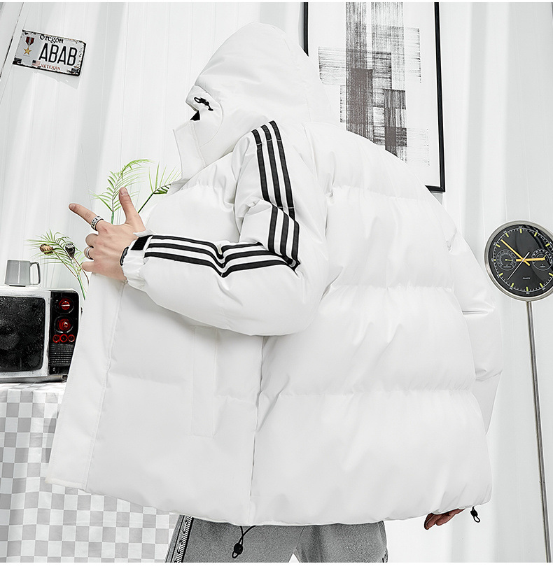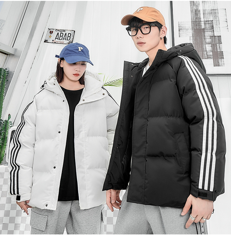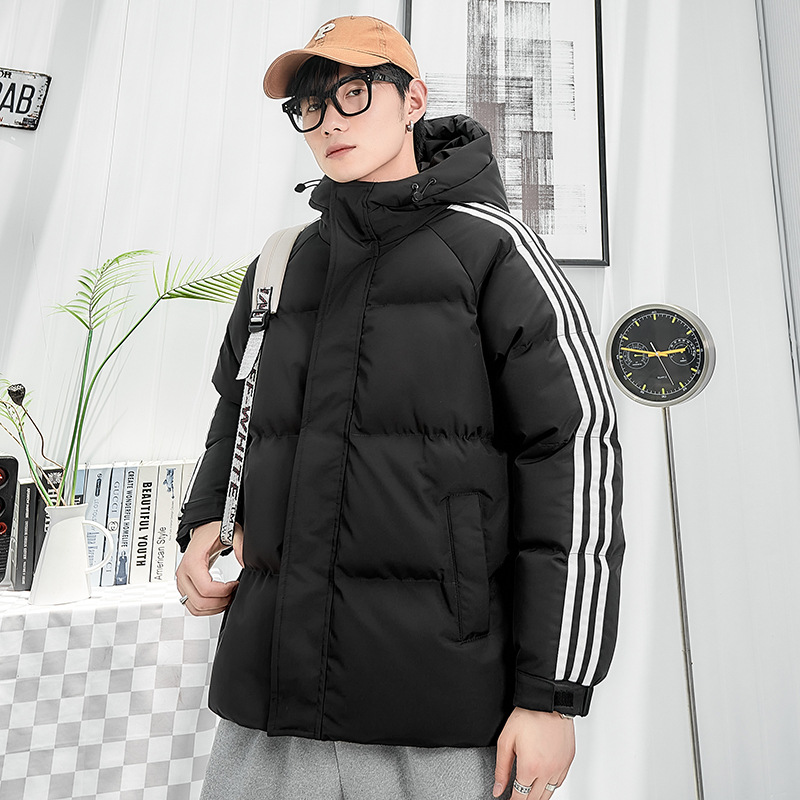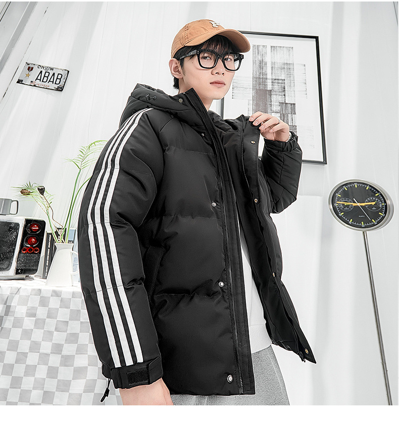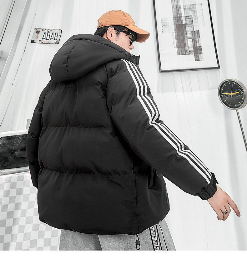 冬季潮牌连帽羽绒棉服男士短款纯色三条杠棉衣加厚保暖外套男棉袄