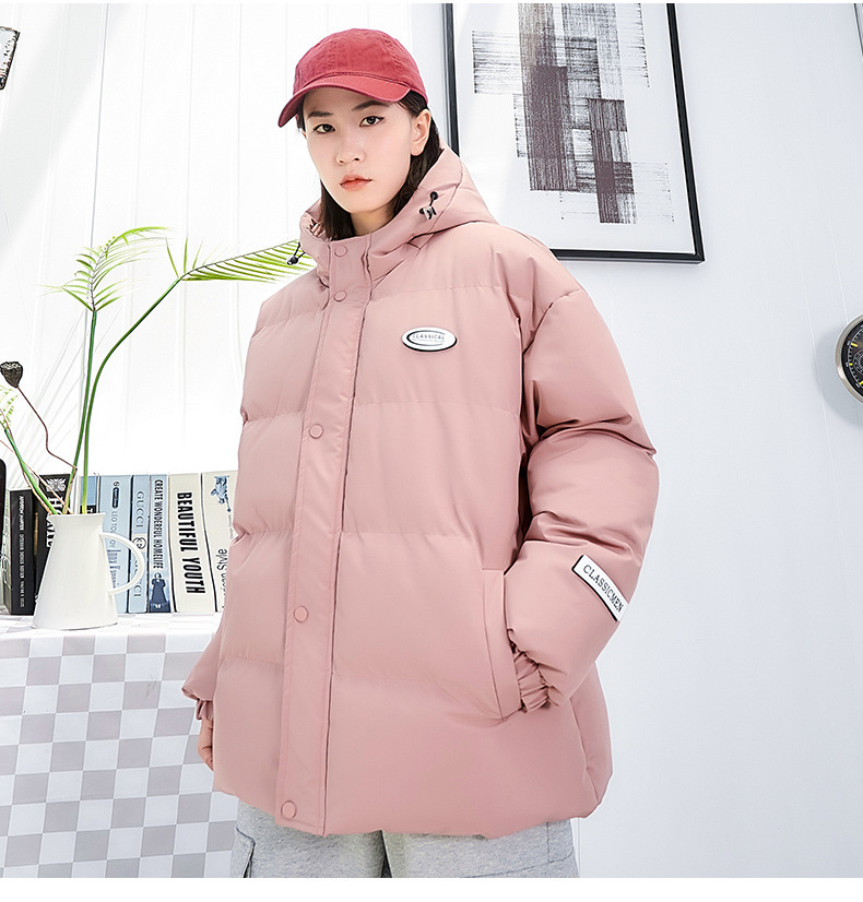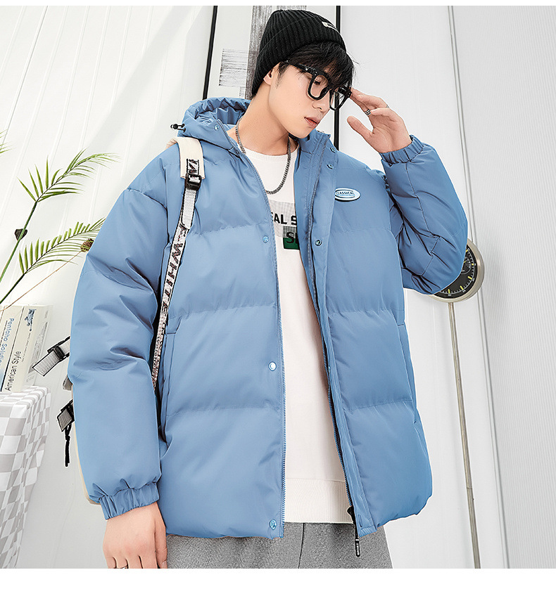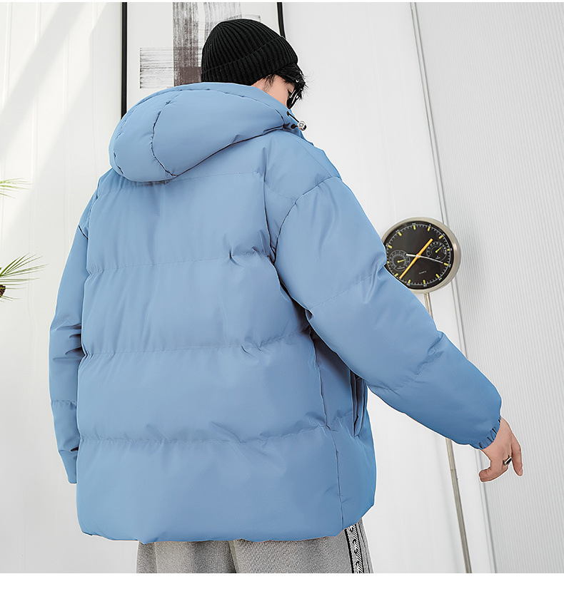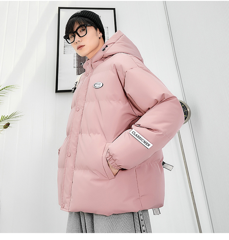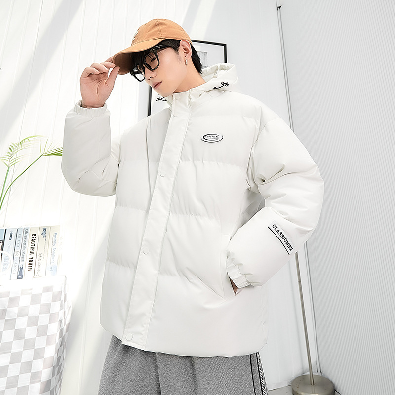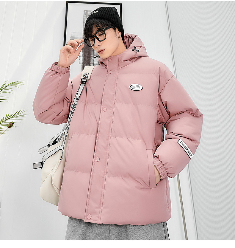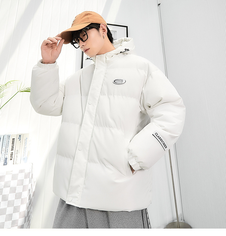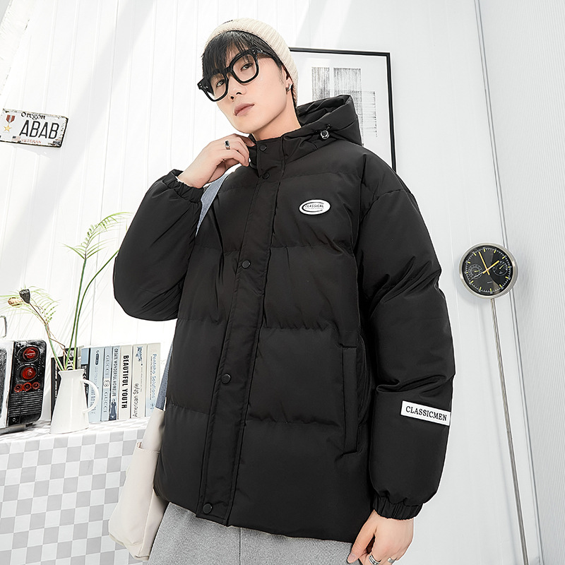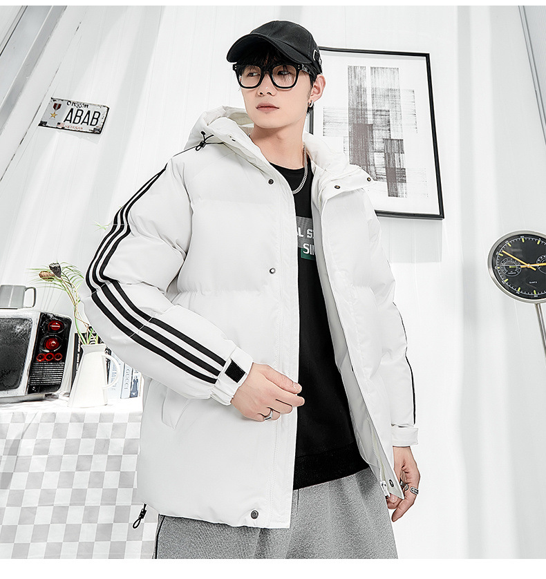 冬季潮牌连帽羽绒棉服男士短款纯色三条杠棉衣加厚保暖外套男棉袄