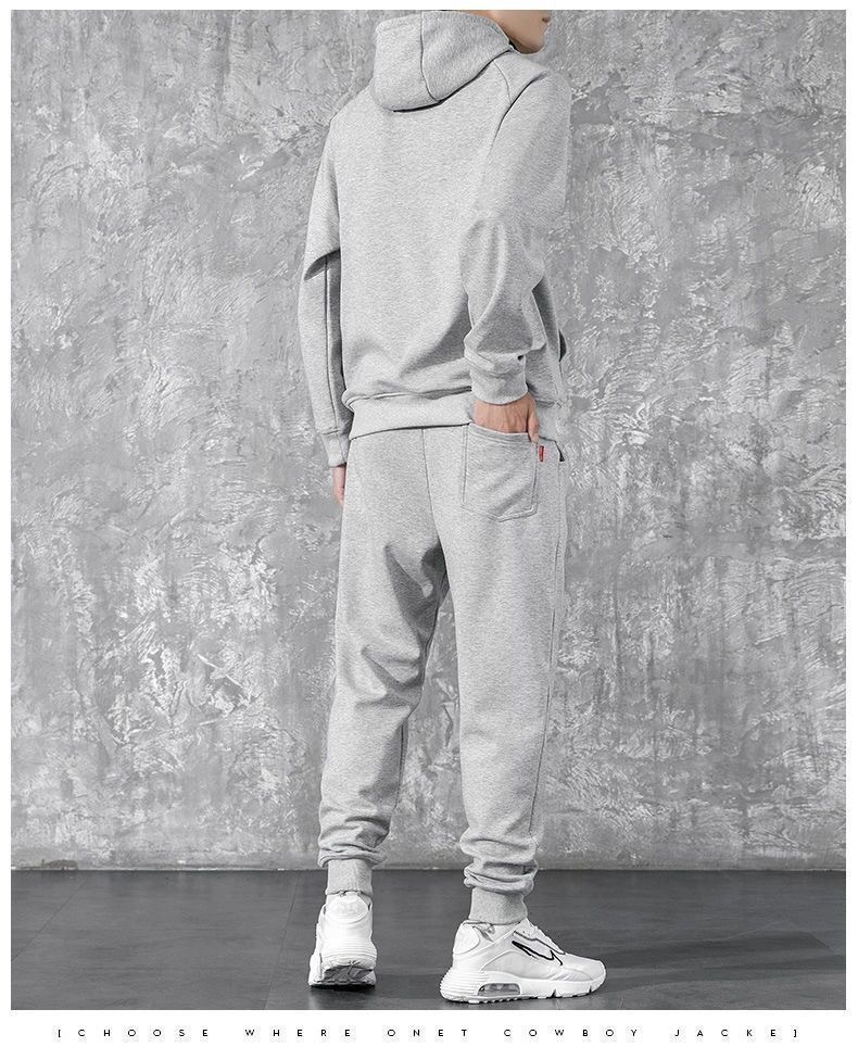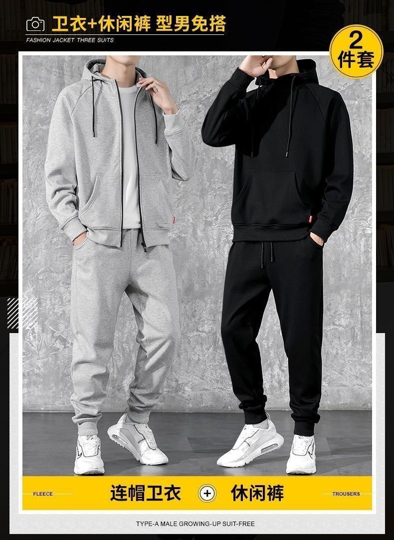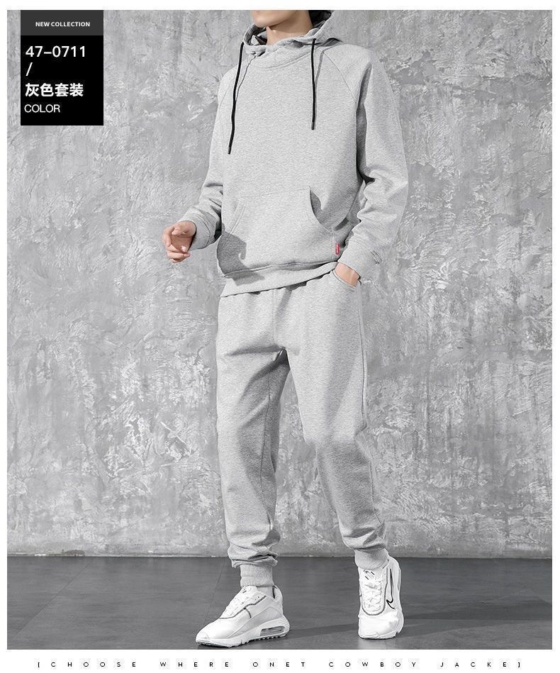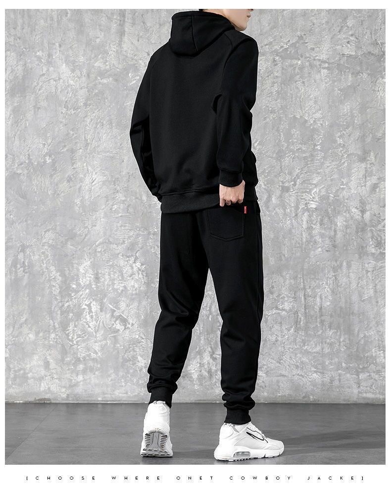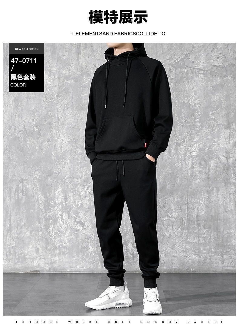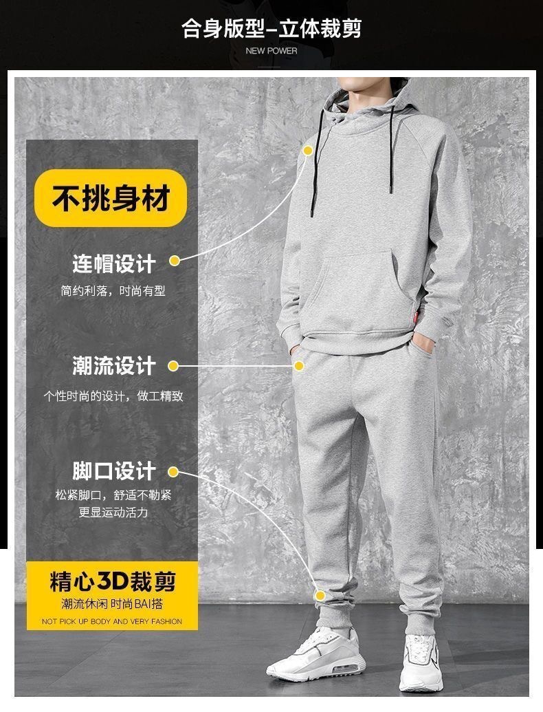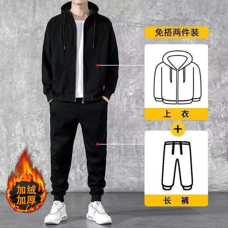冬季加绒连帽套头男士卫衣套装青少年休闲运动服外穿户外九分卫裤