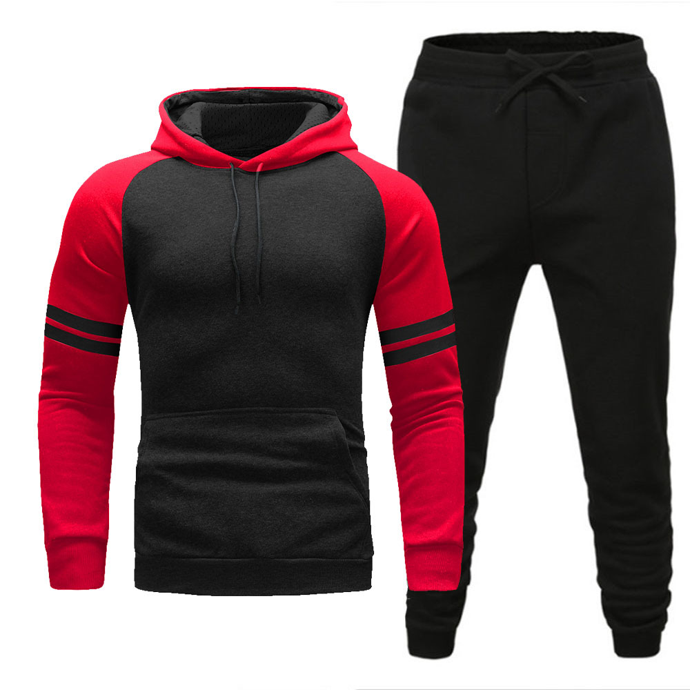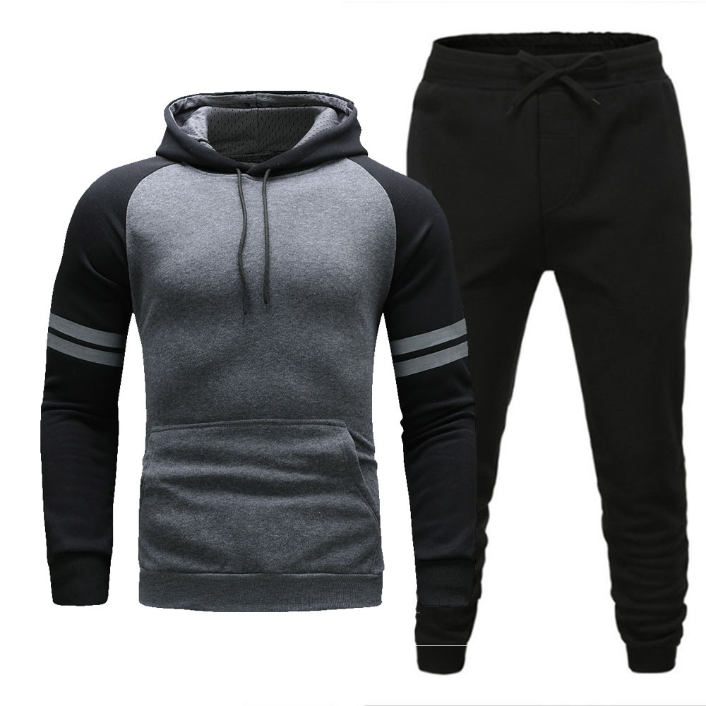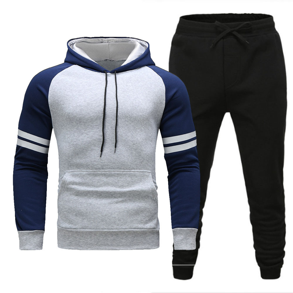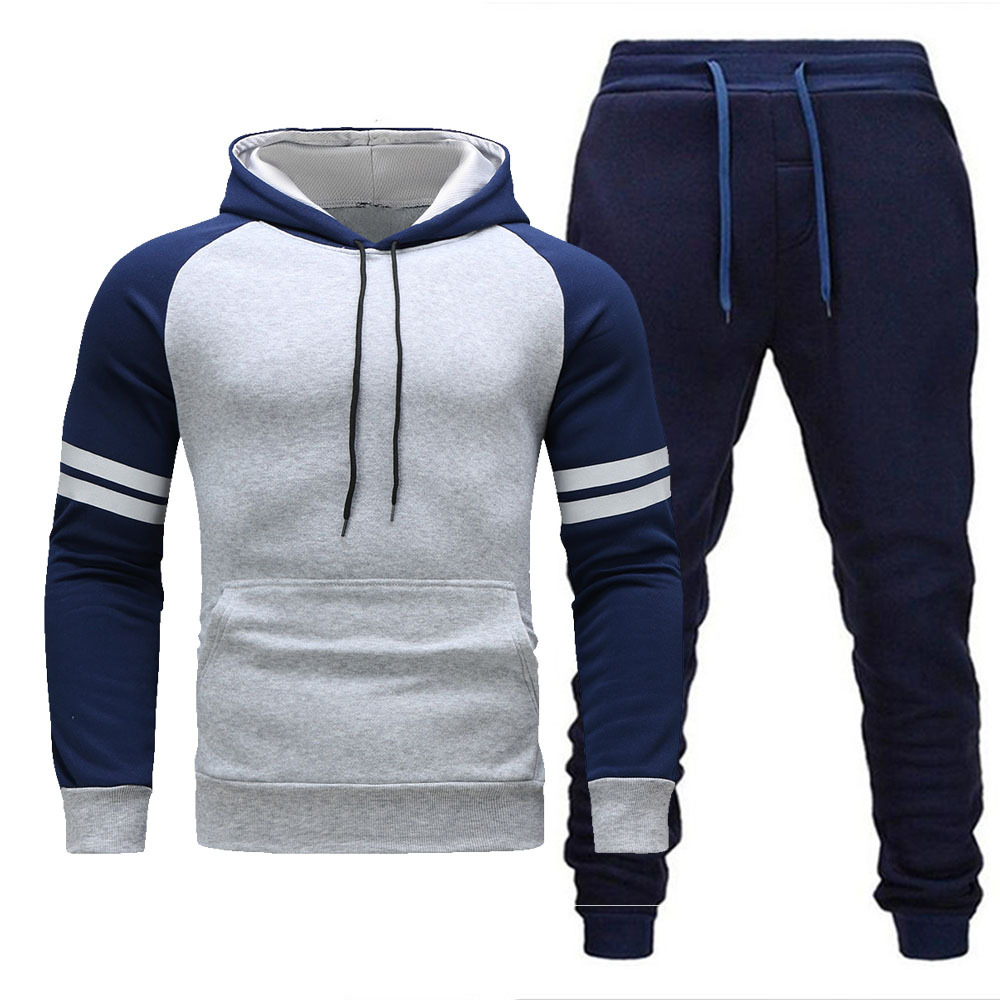 跨境男士连帽衫长裤套装冬季加绒保暖时尚配色休闲运动套装现货