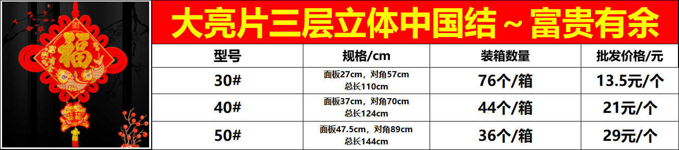 大亮片三层立体中国结~富贵有余款,金福双鱼双线,30# 40# 50# 三个尺寸,30# 13.5元一个,40# 21元一个,50# 29元一个,三层3D立体大亮片撒粉高端大气上档次,标准大双鱼双粗线,双鱼寓意是年年有余款式新颖独特高端大气上档次!