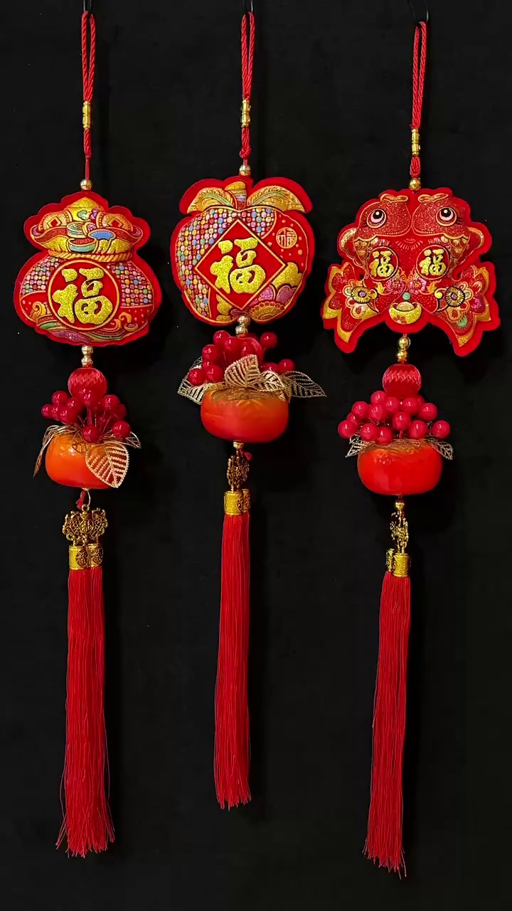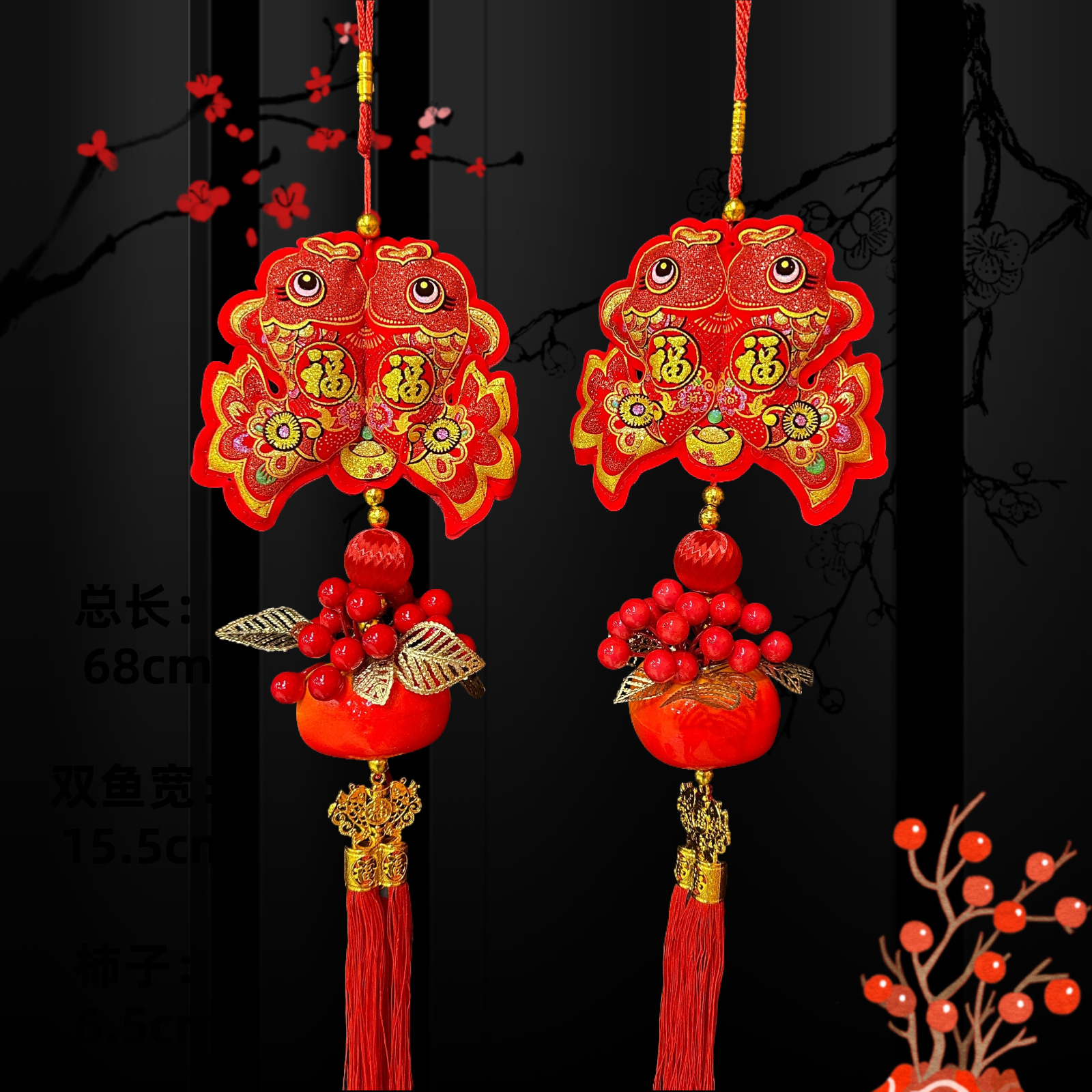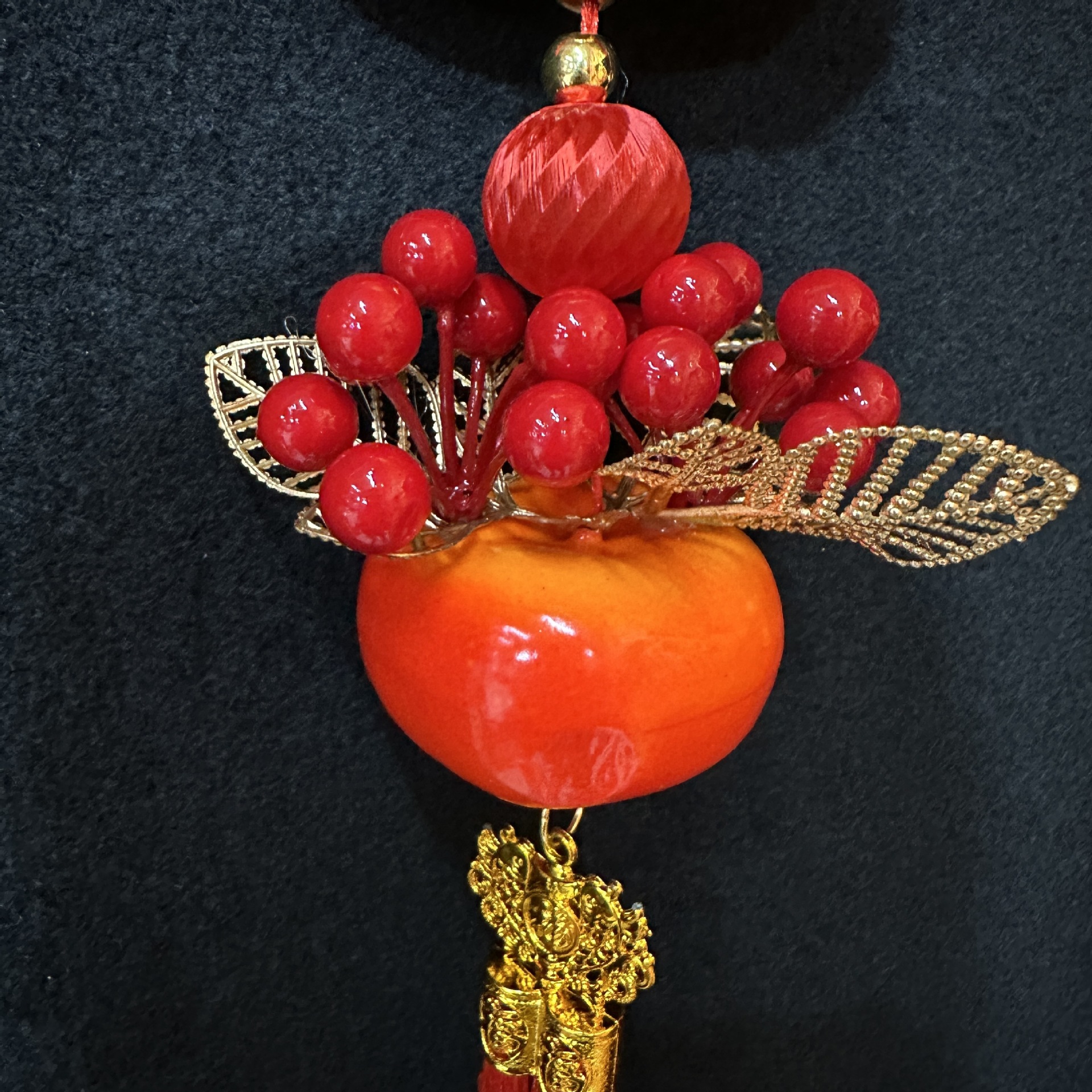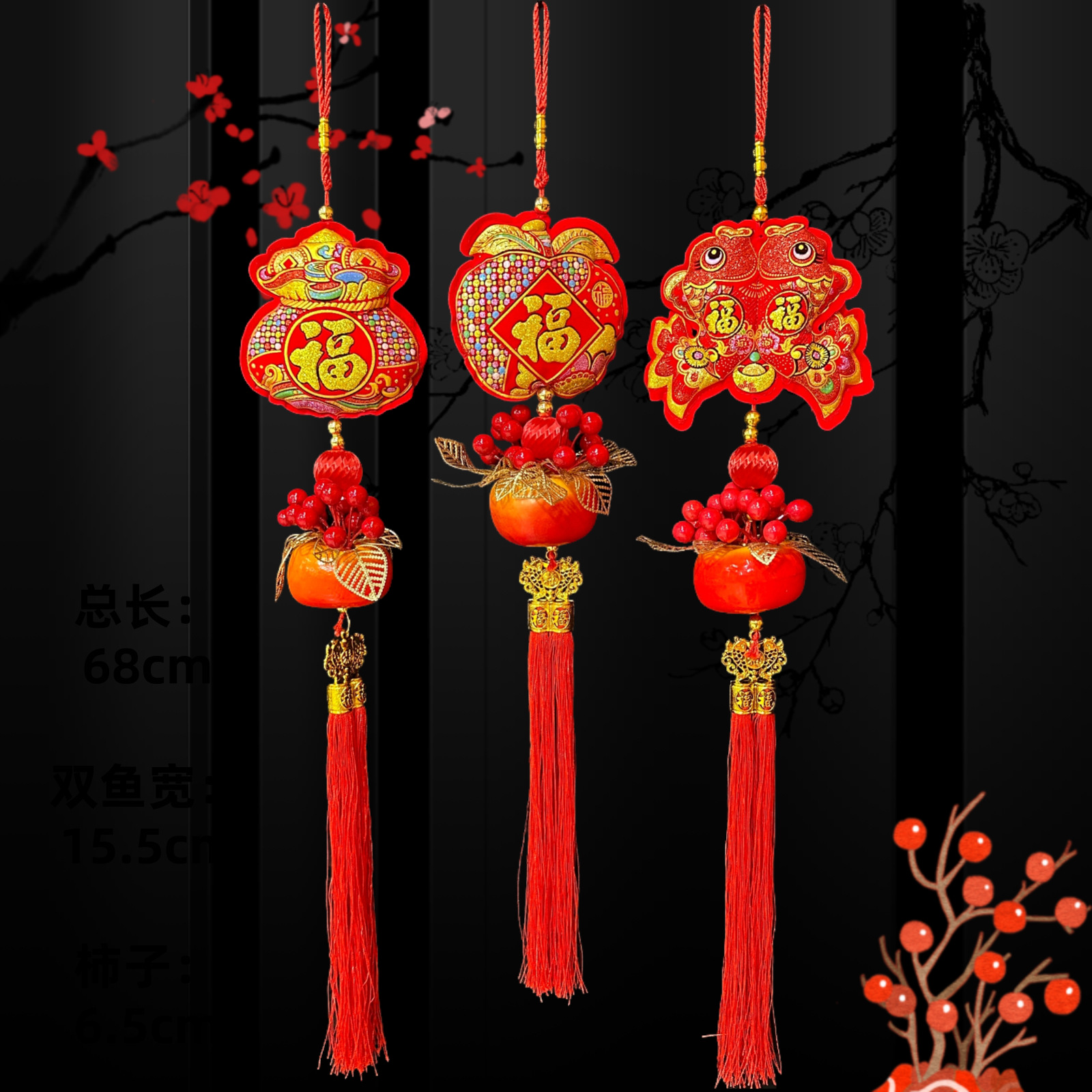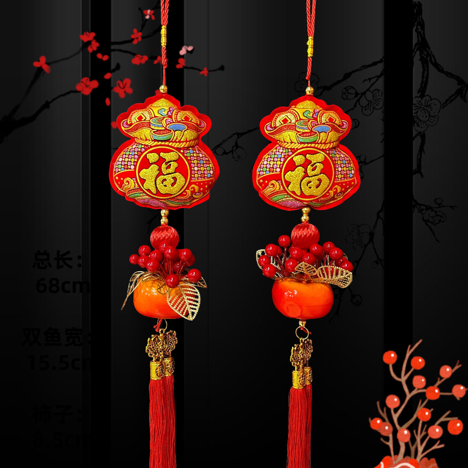 柿子红果两件套,苹果,钱袋,双鱼三个款式可混搭发货4.8元一串,一件200串,柿子寓意事事如意,大号柿子18头红果镀金叶发泡布充棉配件高档镀金双流苏完美搭配高端大气上档次,实物比图片更有质感,尺寸:柿子6.5cm,总长:苹果64厘米,福袋和双鱼68厘米