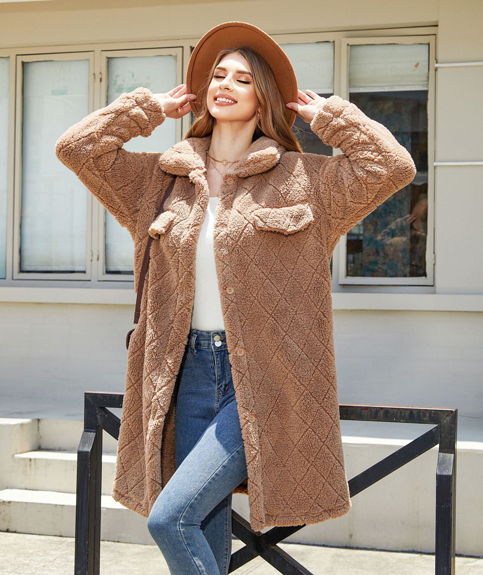 闪绒2023秋冬新款欧美女装亚马逊跨境毛绒宽松单排扣菱形外套大衣