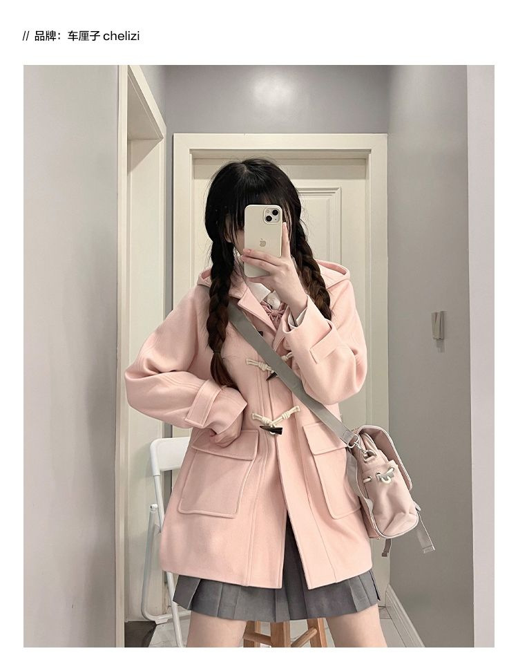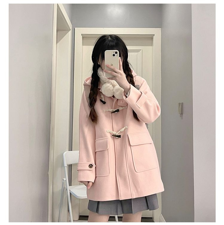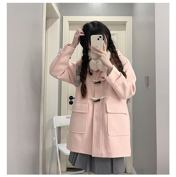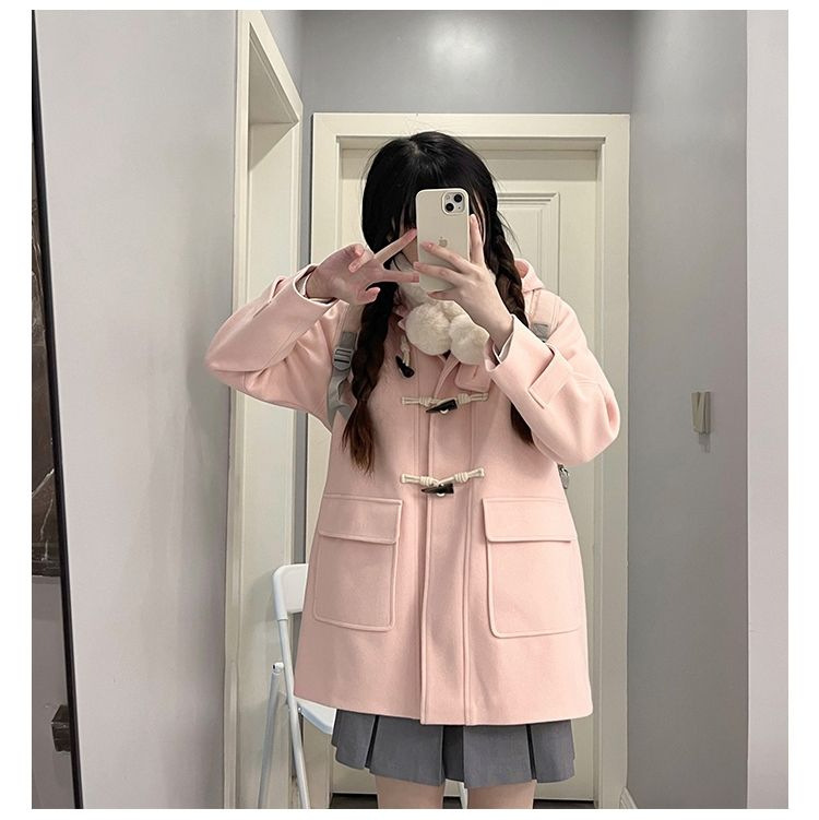 连帽学院风牛角扣设计大衣女2024秋冬新款加厚毛呢大衣女小个子