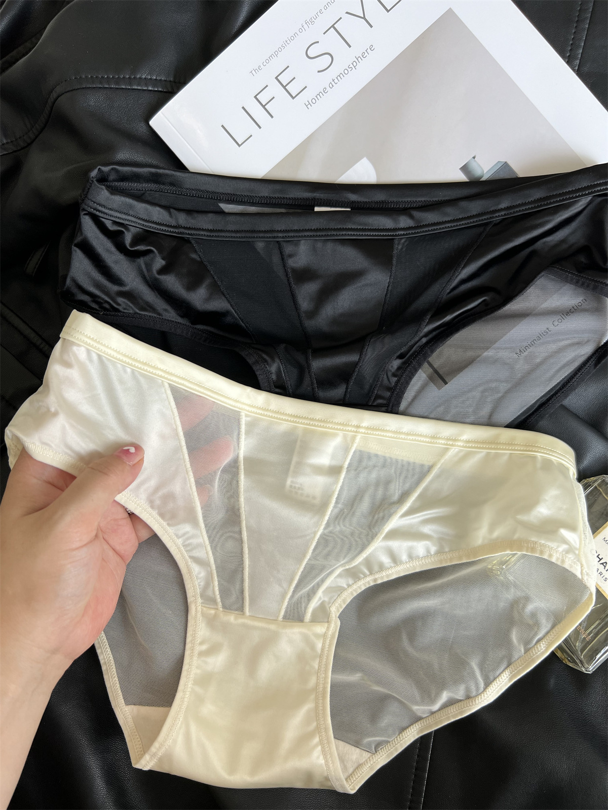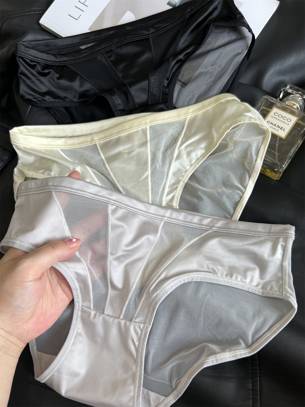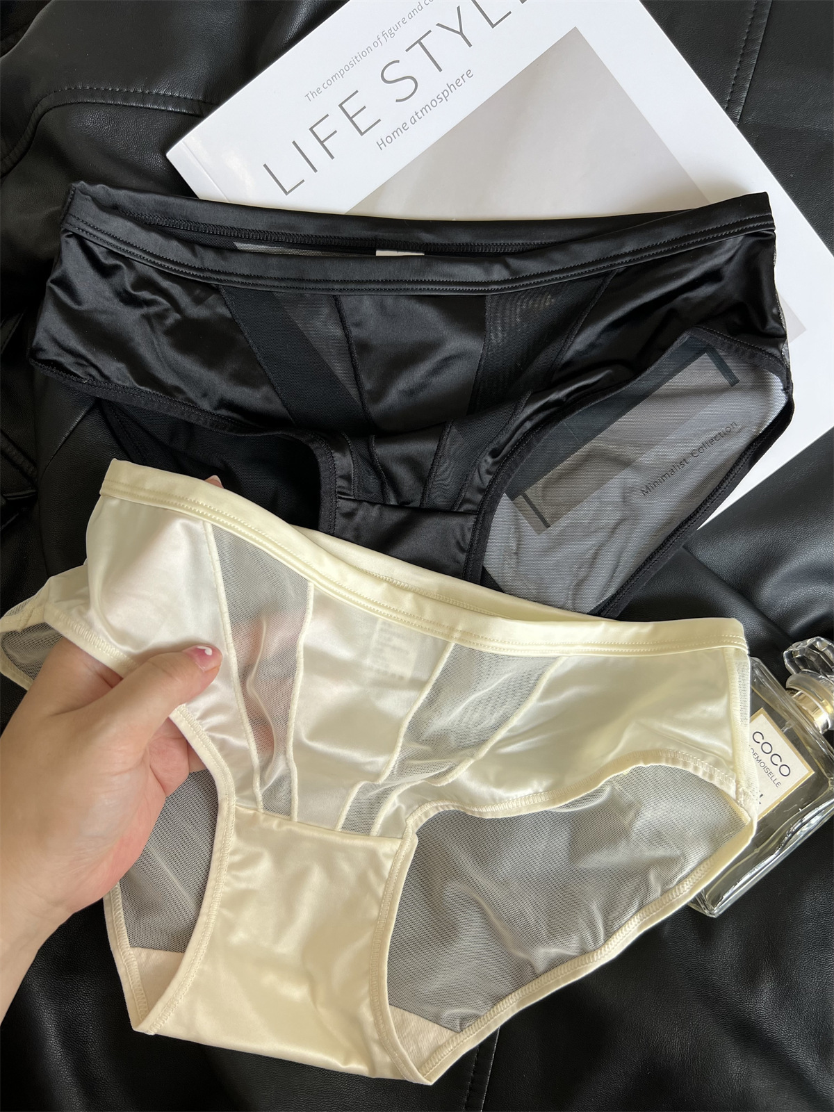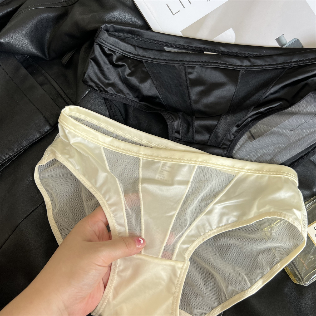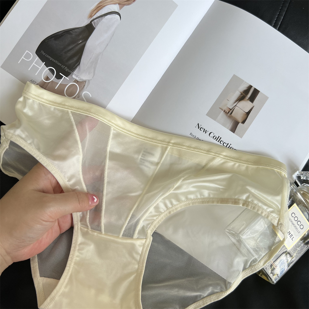 高级法式缎面~奶杏冰丝无痕蕾丝纯色中低腰三角内裤青年女士轻薄
