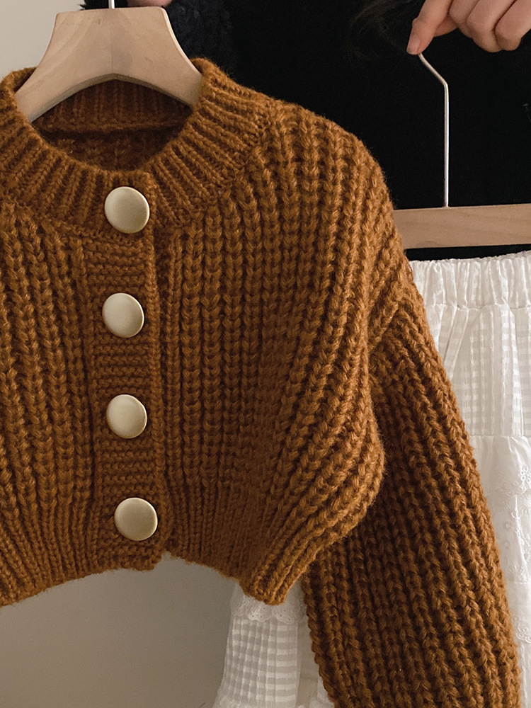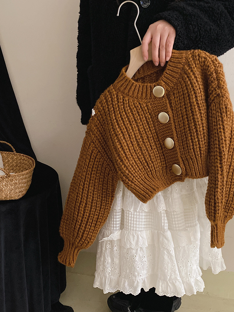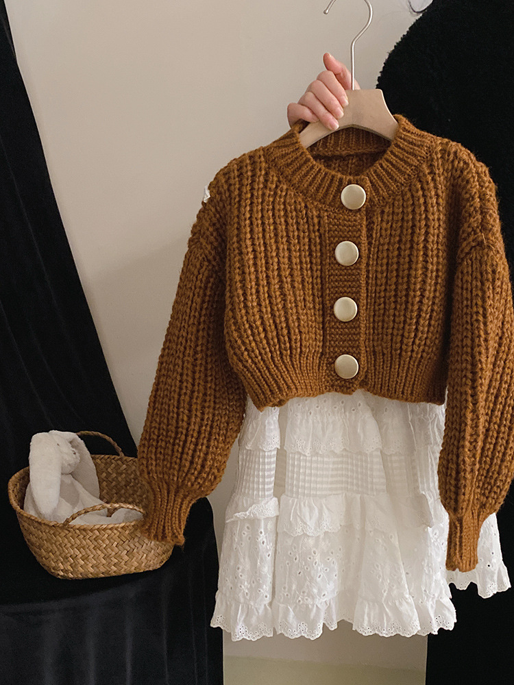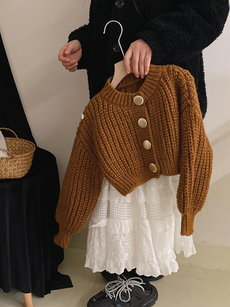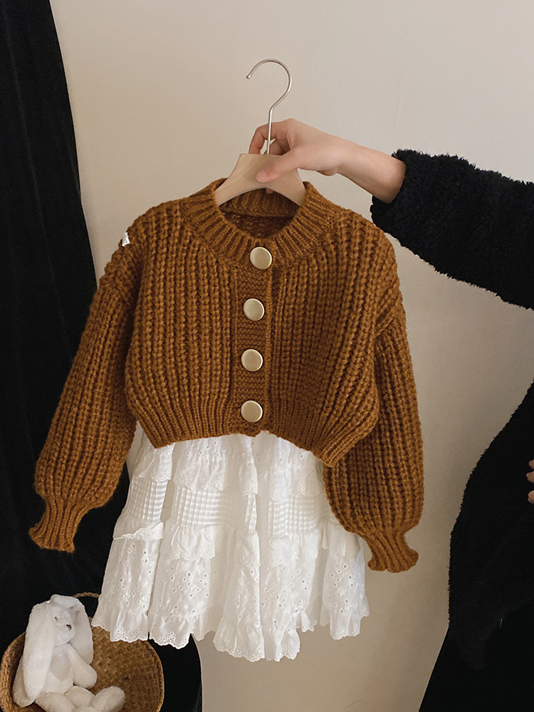 2024春秋女童气质针织毛衣金属纽扣开衫外套女孩甜美蕾丝半身裙潮