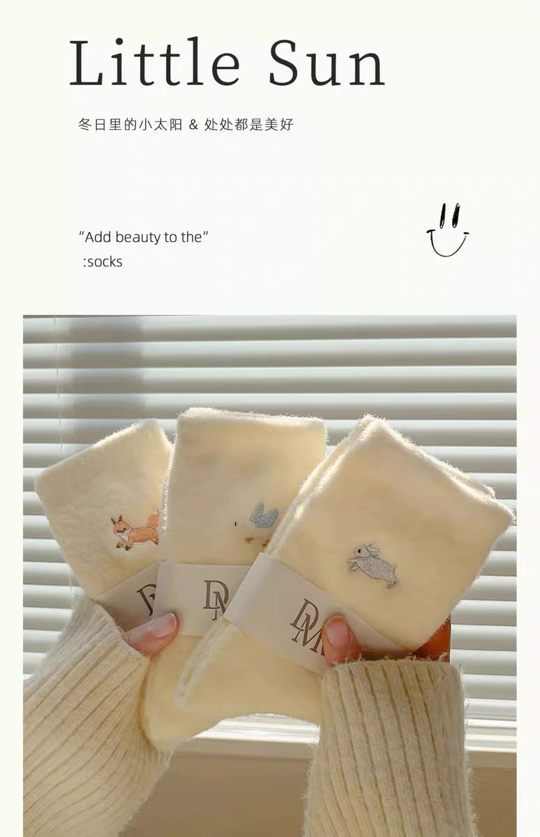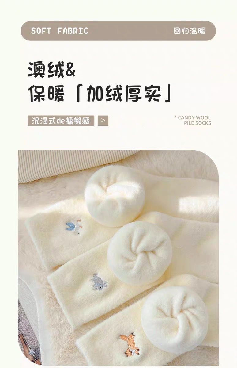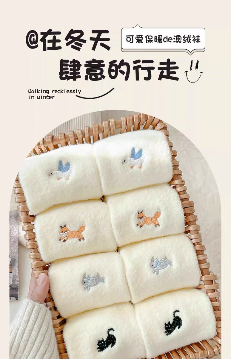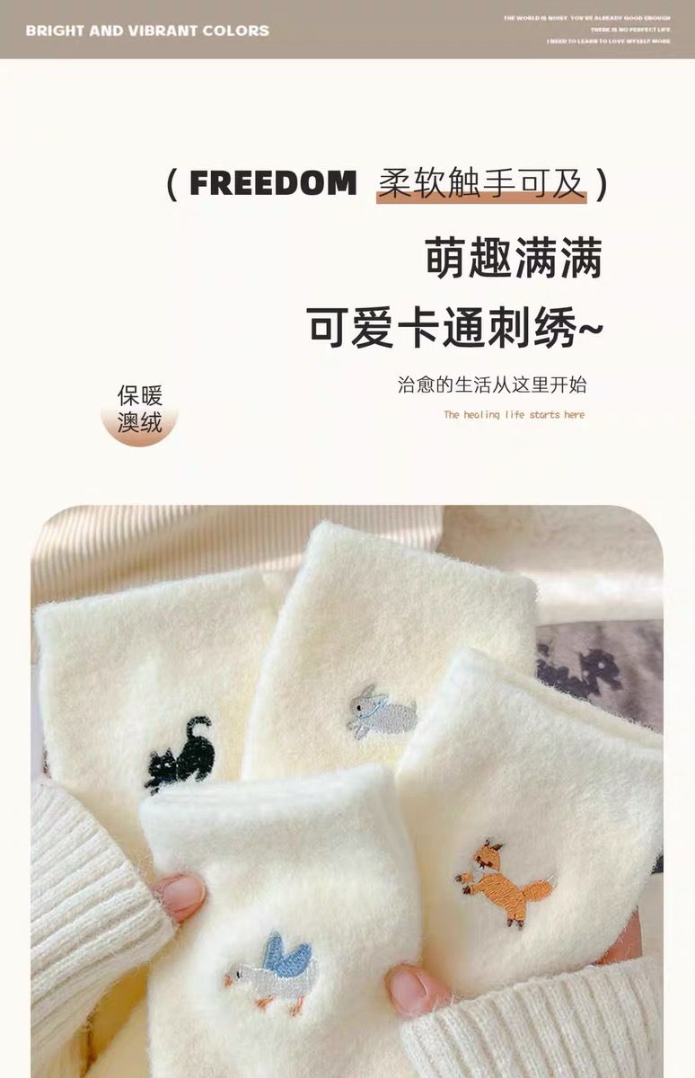 秋冬保暖蓄热加绒厚刺绣澳绒女生中筒袜卡通少女可爱月子袜睡眠袜