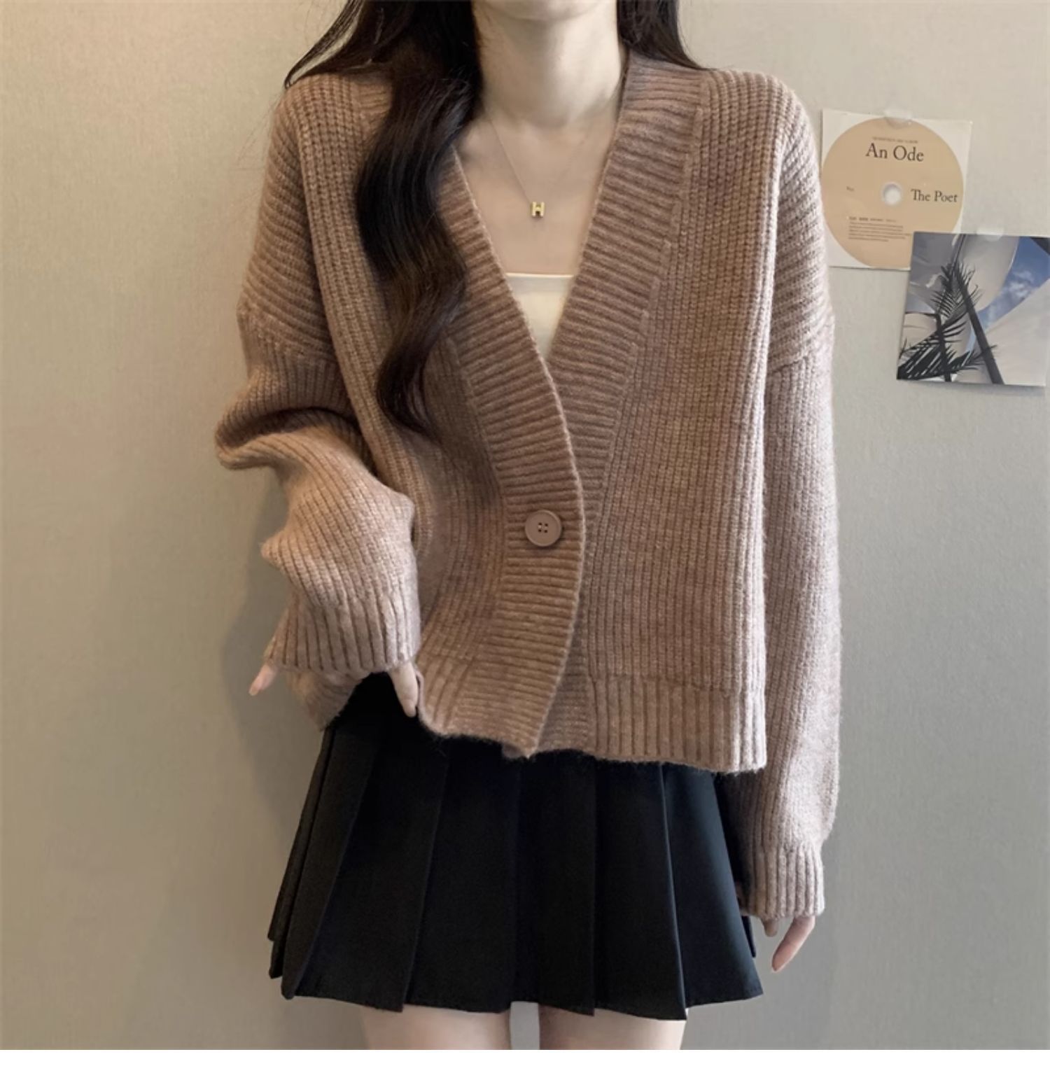 2024早秋色新款v领短款毛衣外套女内搭设计感小个子针织开衫女