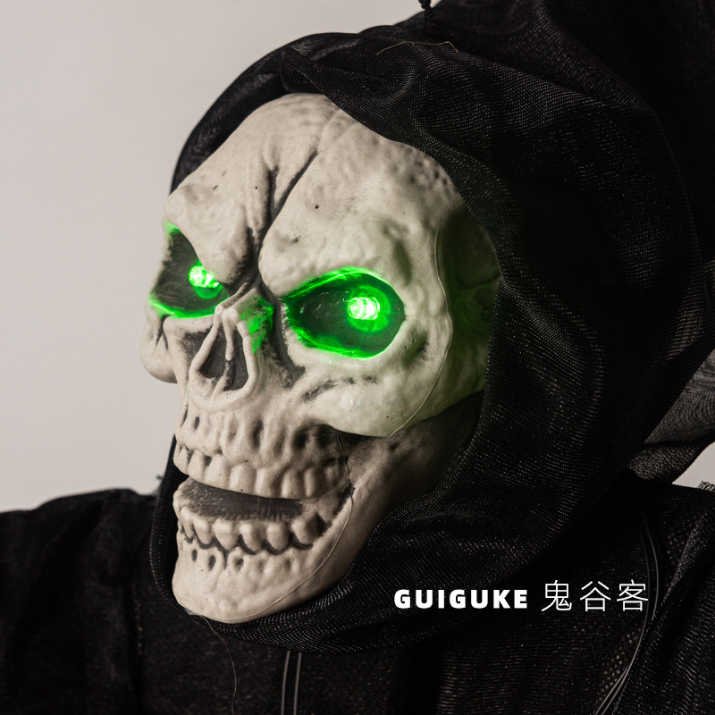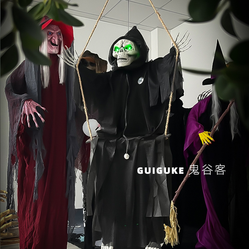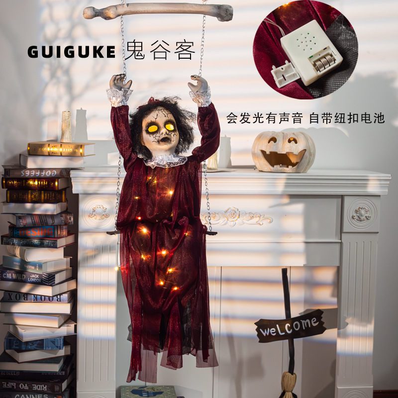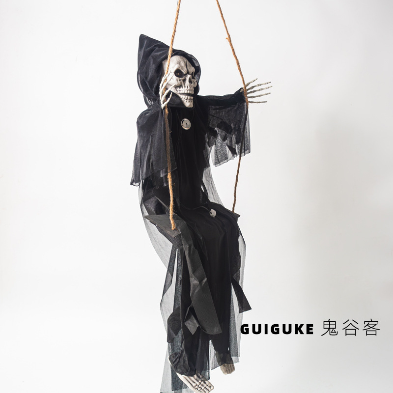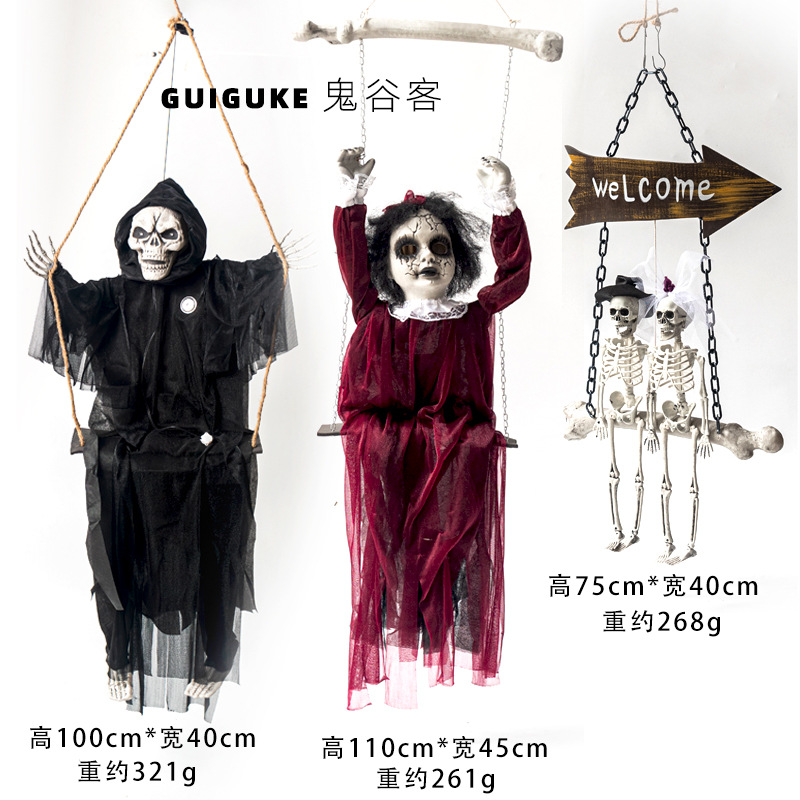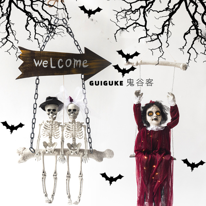 跨境新款万圣节吊秋千锁链挂鬼声控发光骷髅鬼屋恐怖装饰挂件道具