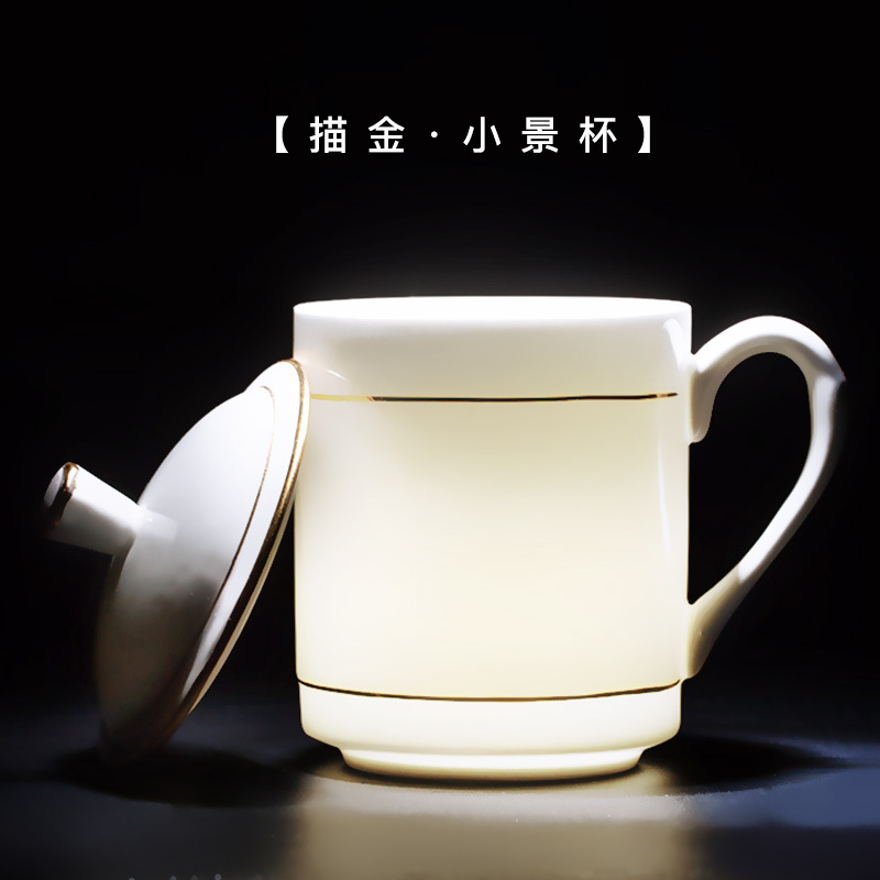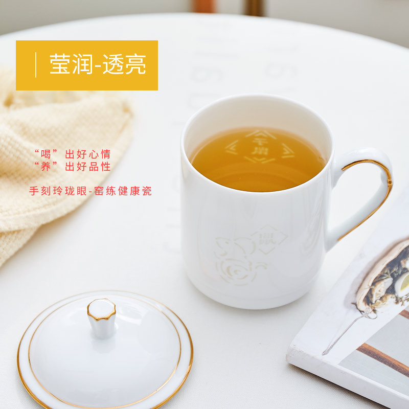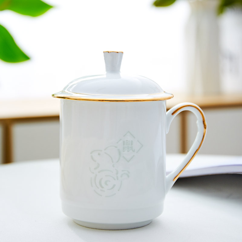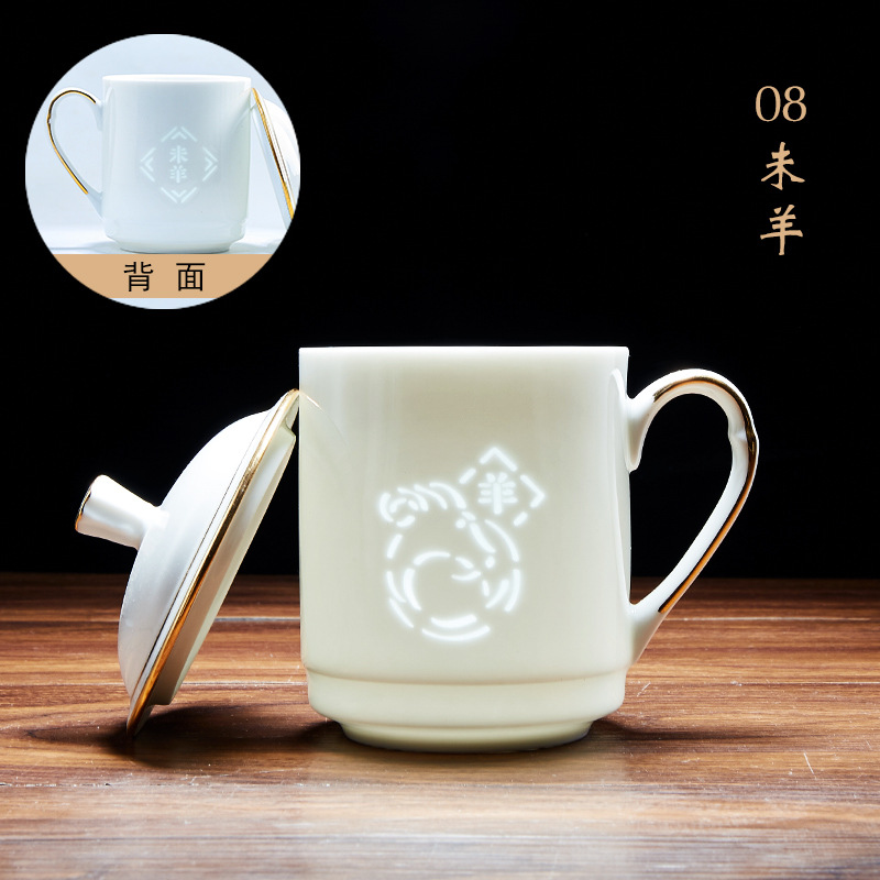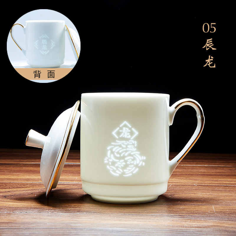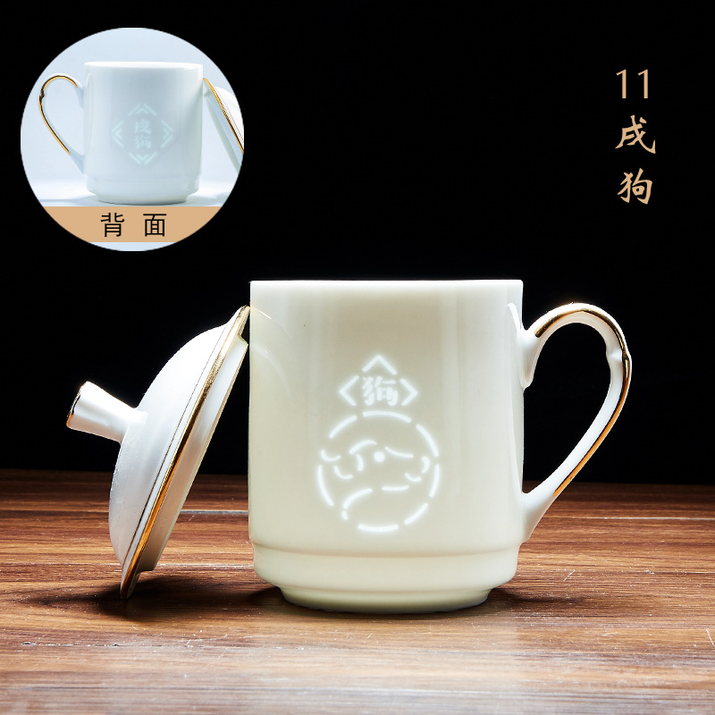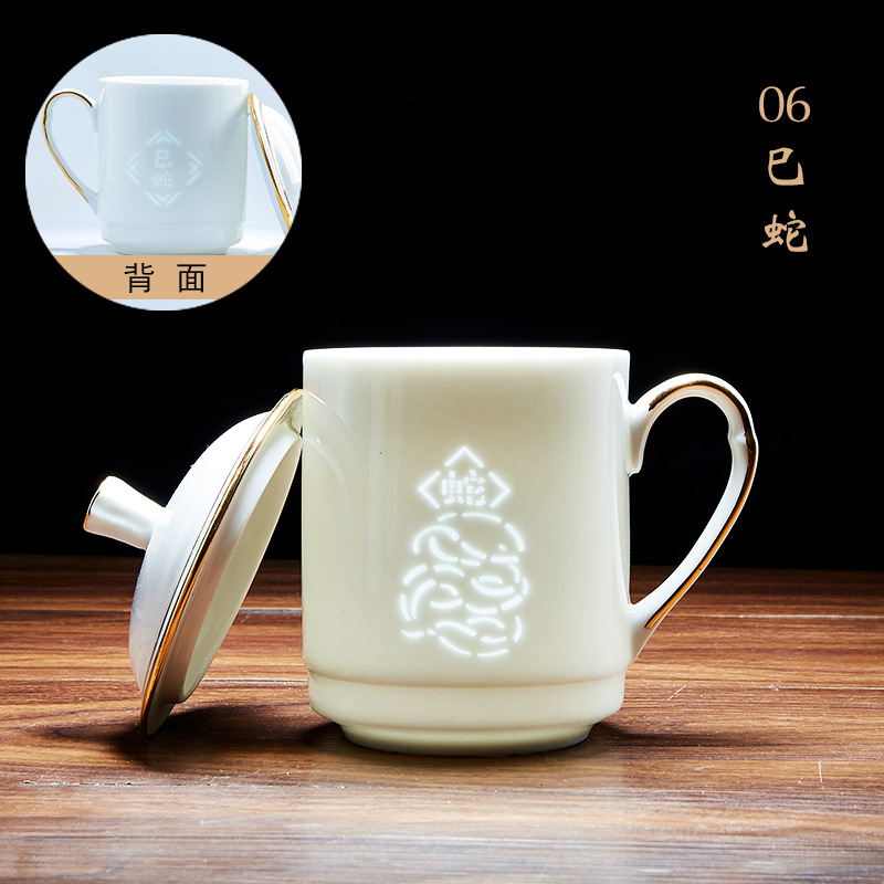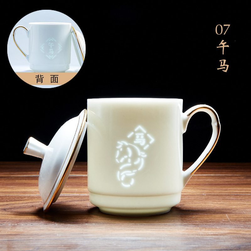景德镇茶杯陶瓷马克杯家用带盖水杯十二生肖描金玲珑瓷杯子大容量
