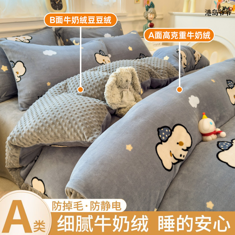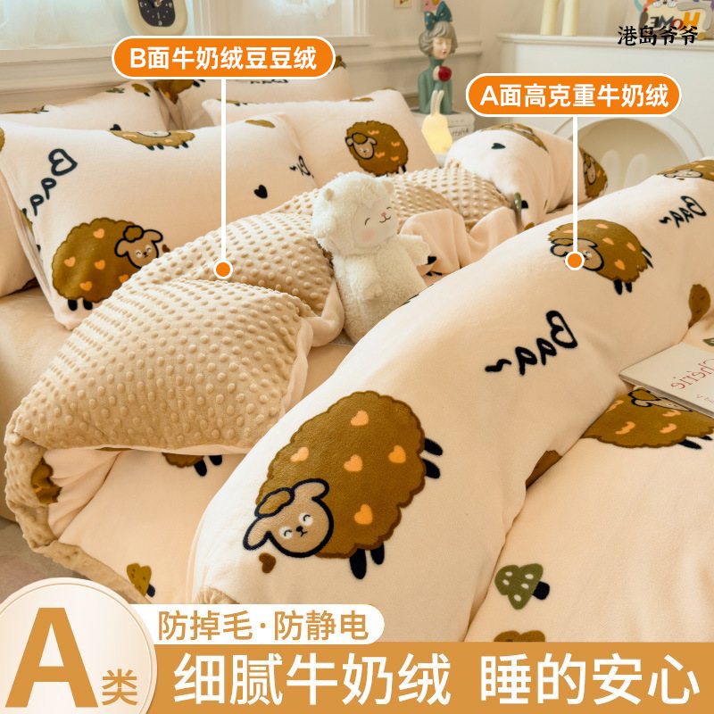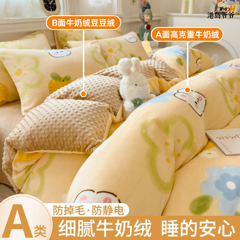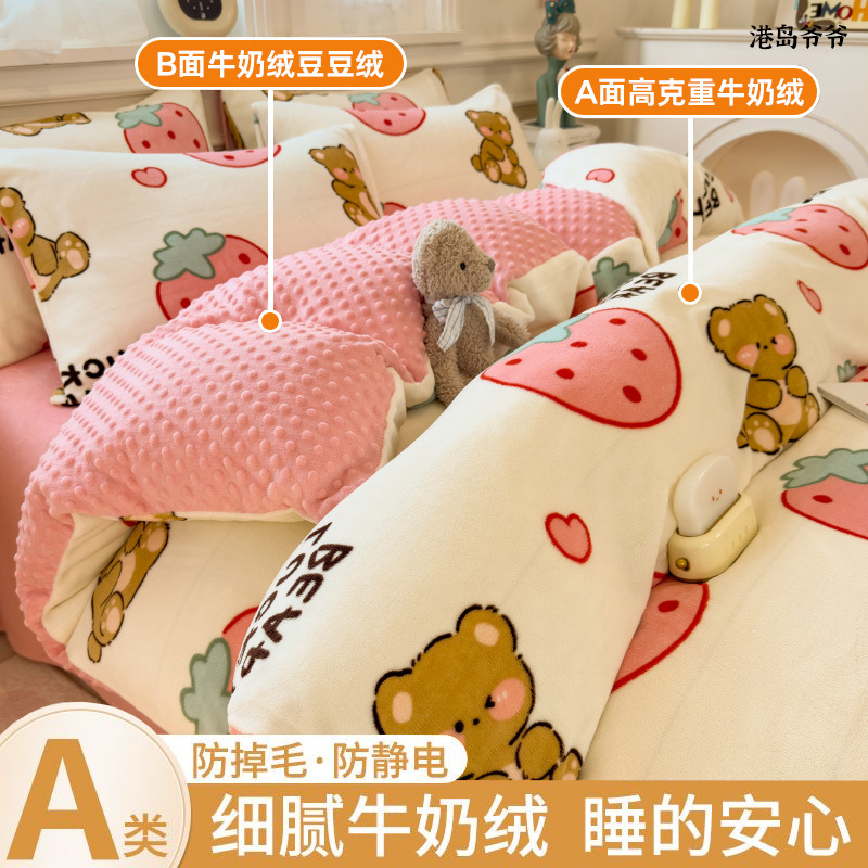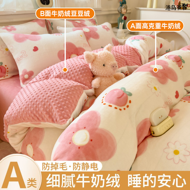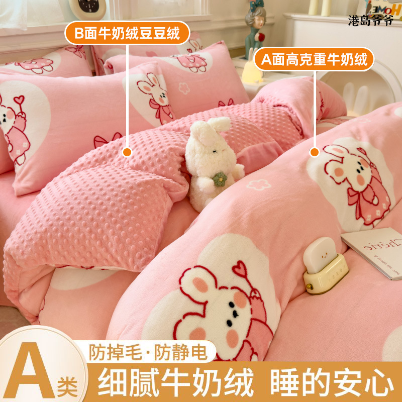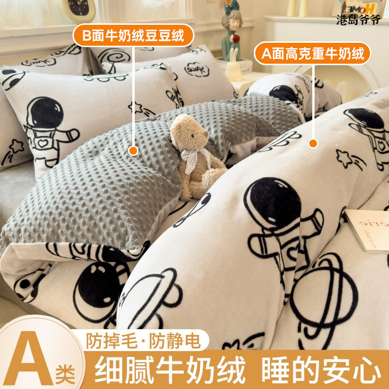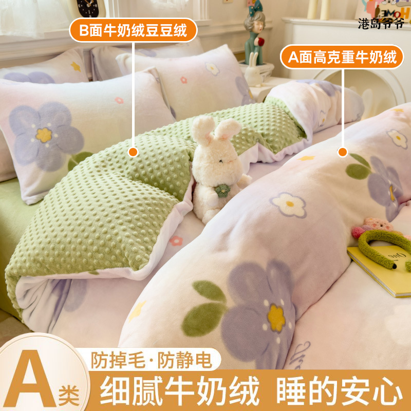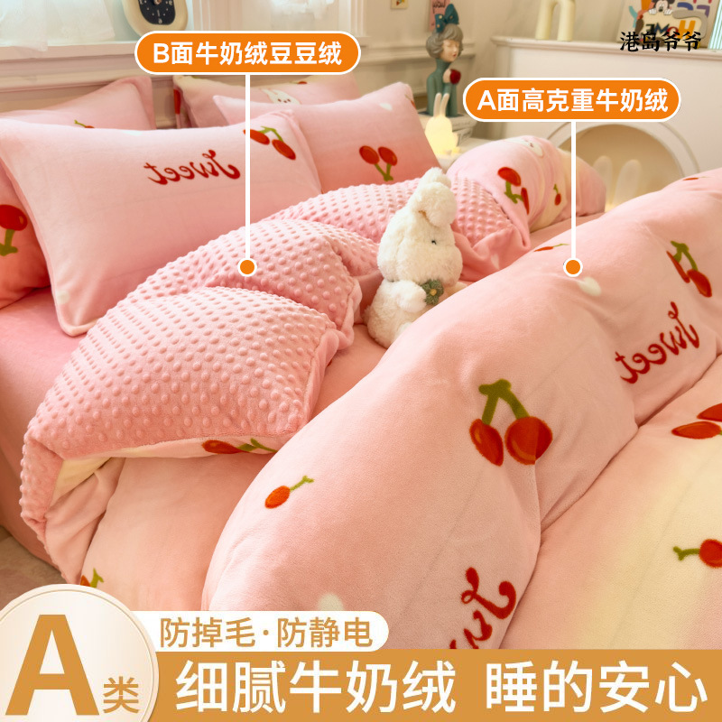 A类母婴级牛奶绒四件套双面加厚珊瑚绒床笠加绒被套床单三件套 罩
