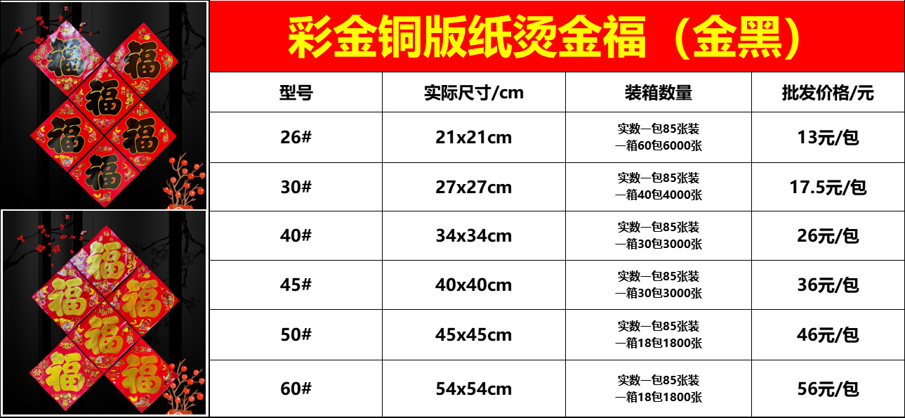 彩金铜版纸烫金福字,价格尺寸详情请看第一张照片图!按包拿货(不散拿),铜版纸浮雕烫金工艺……26# 30# 40# 45# 六图50# 60# 三图六个尺寸…黑色金色尺寸可选款式图案随机发,实际尺寸和尺寸表误差1公分左右属于正常……特别提醒,实际每包85张装