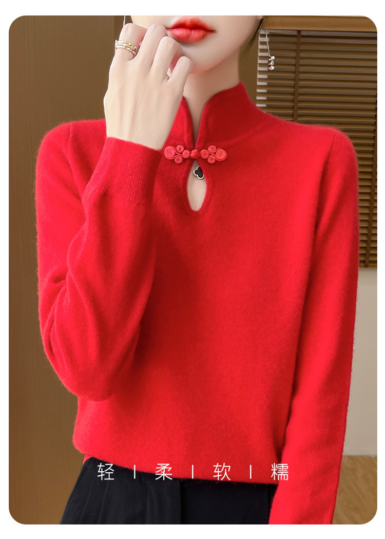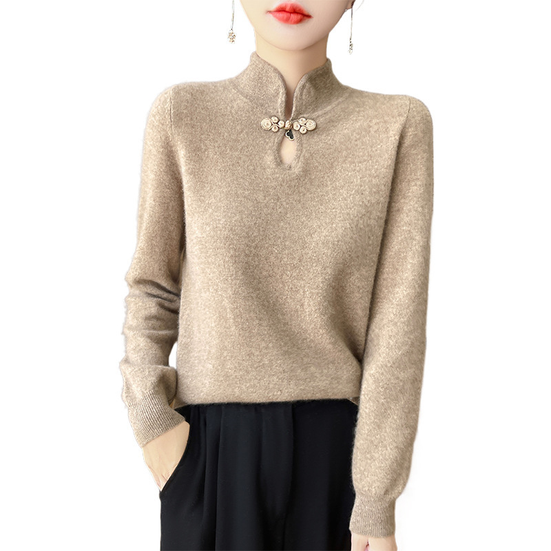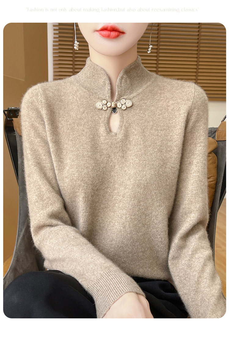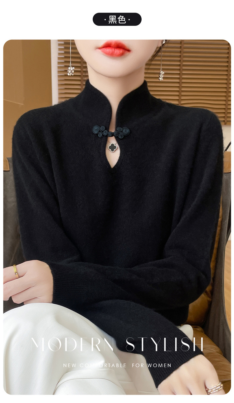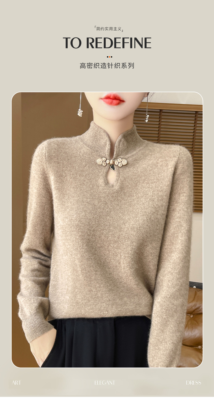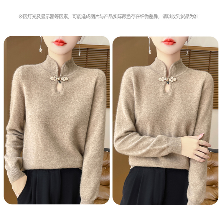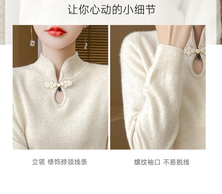 2024秋冬新款羊毛混纺新中式国风立领毛衣女宽松打底衫针织衫上衣