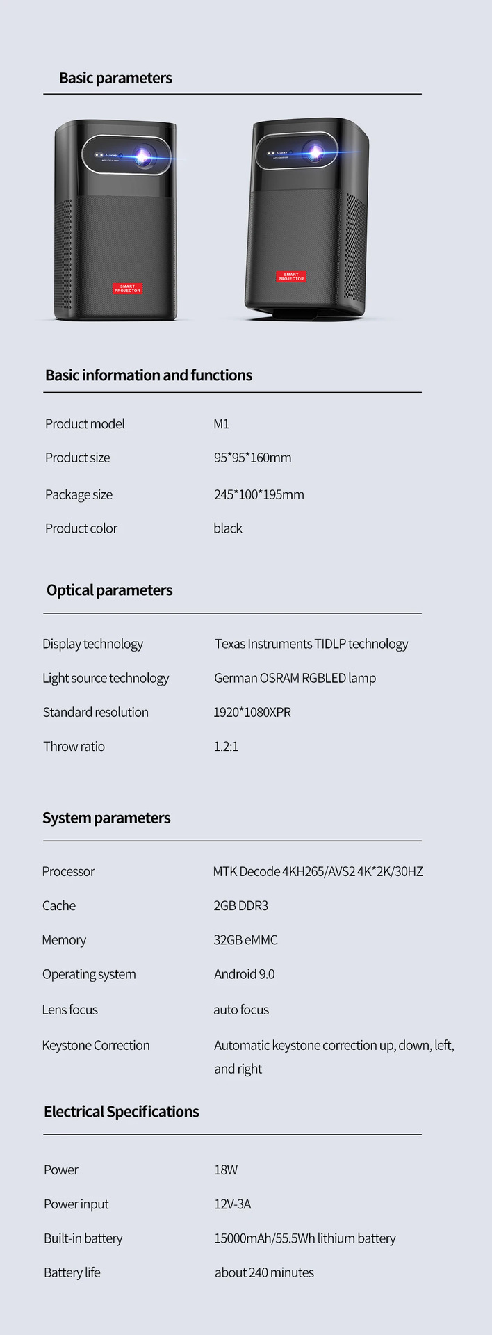 M1 1080P DLP 内置电池,自动对焦,跃动T型矫正,自带户外包包,户外,家用都可以,英文版本还有分GTV 版本,自带谷歌原装系统,客户选择版本可以联系客服。GTV 版本成本贵200元,请知悉!支持定制OEM。