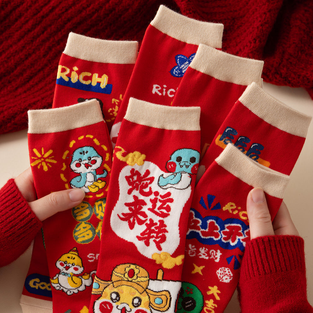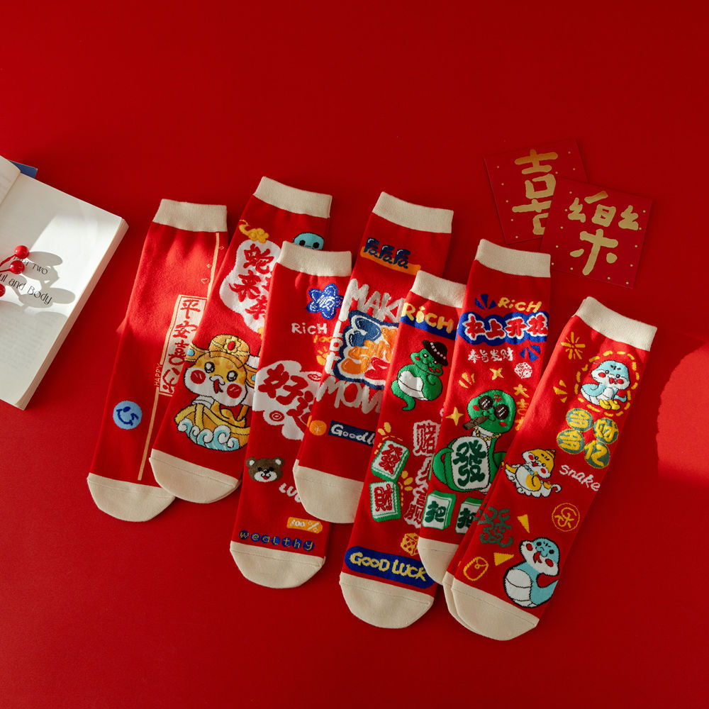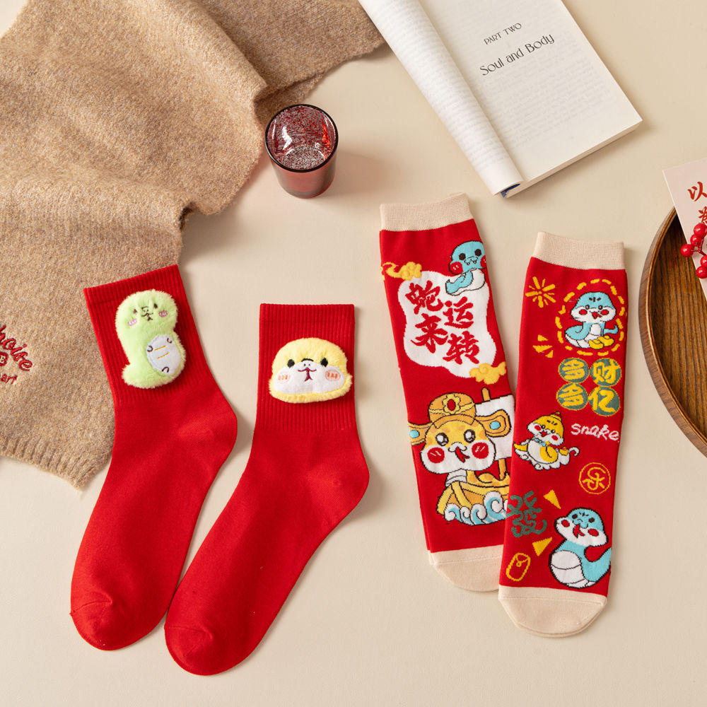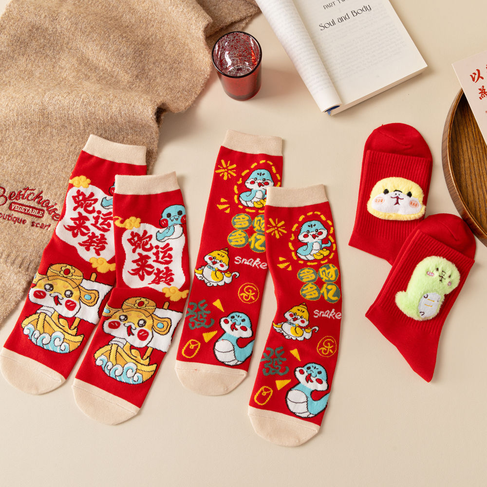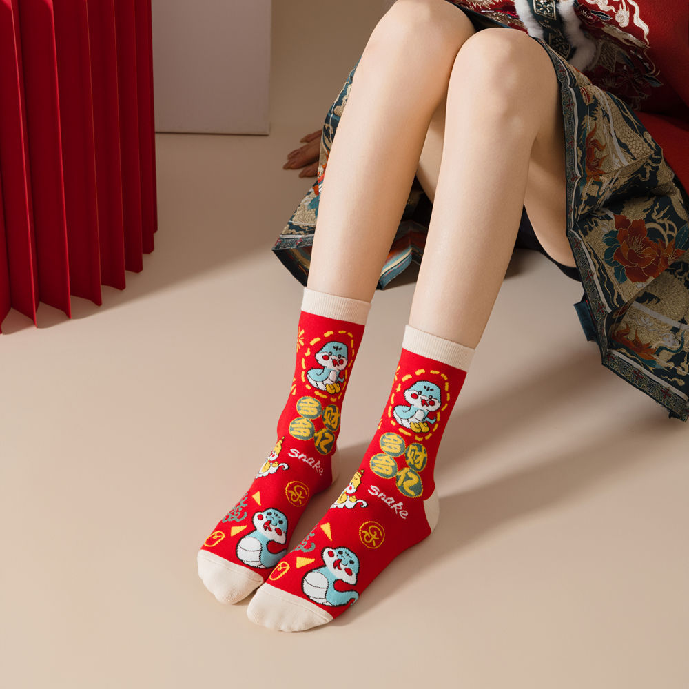 2025卡通本命年蛇年红色袜子新年袜女士秋冬中筒袜大红袜子批发
