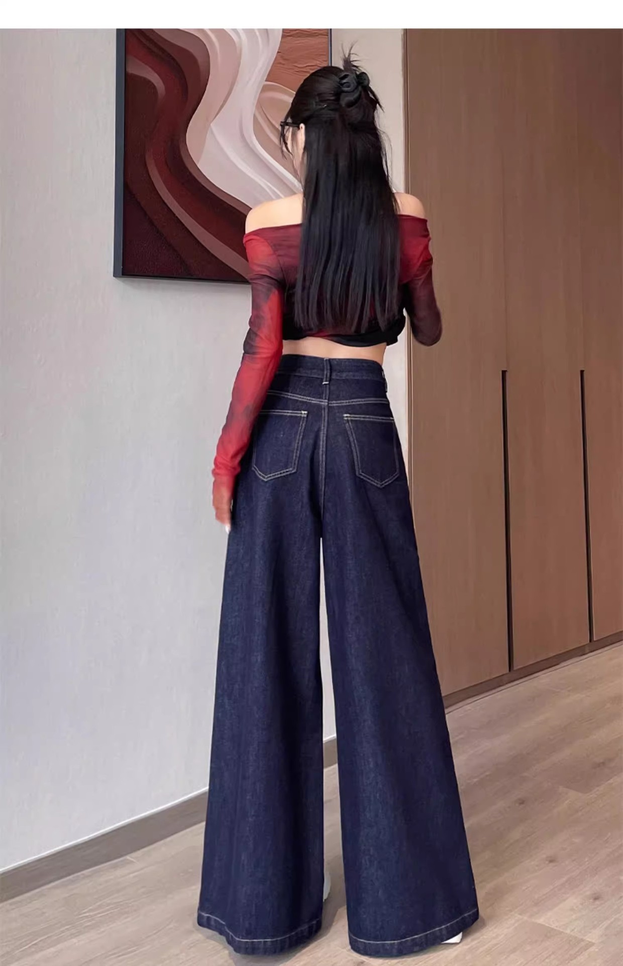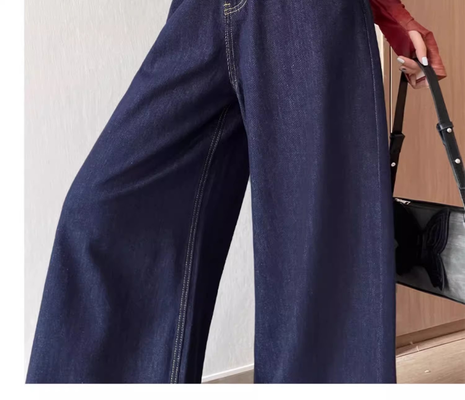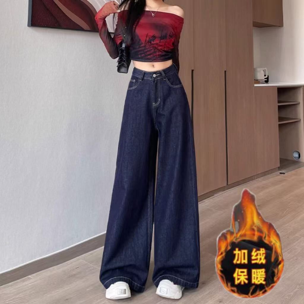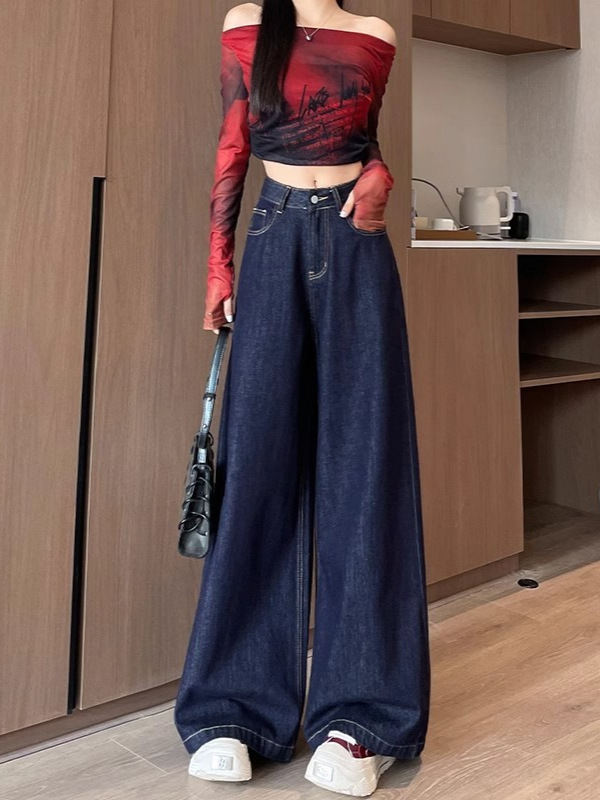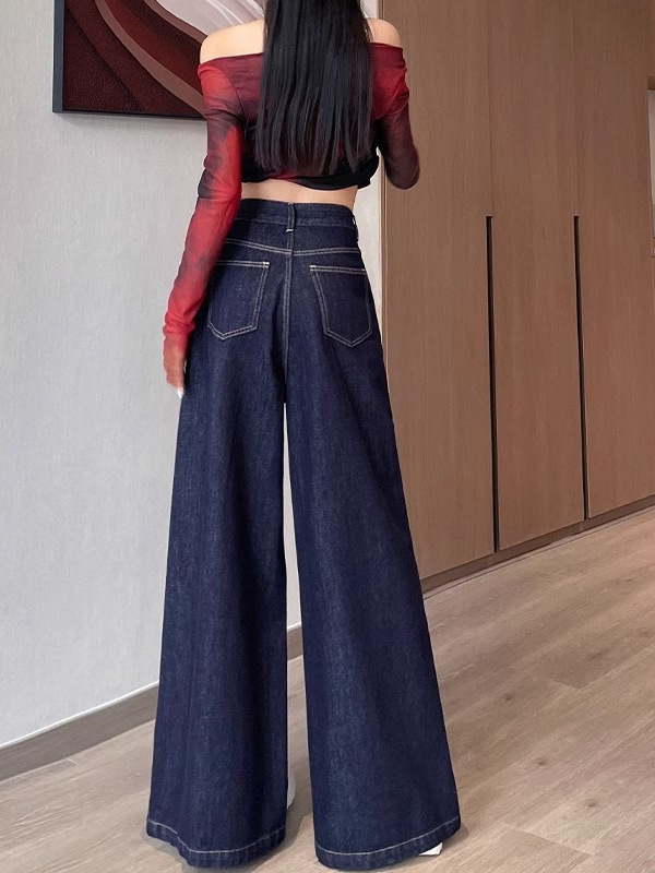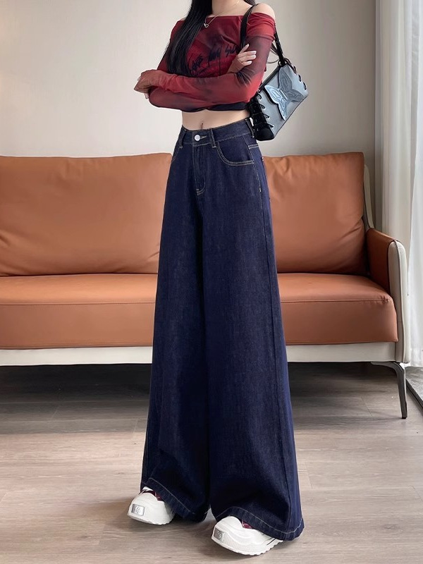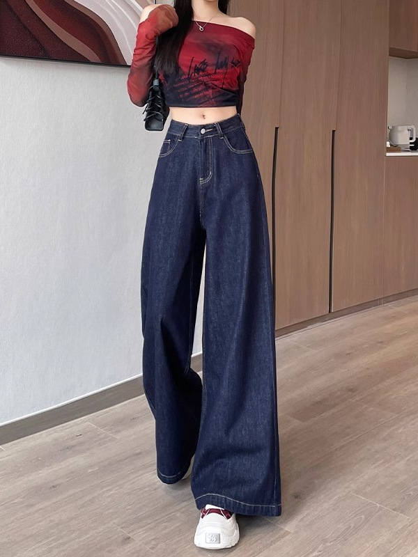 深蓝色高腰牛仔裤女秋季新款宽松遮肉显瘦复古百搭垂感阔腿裤子潮