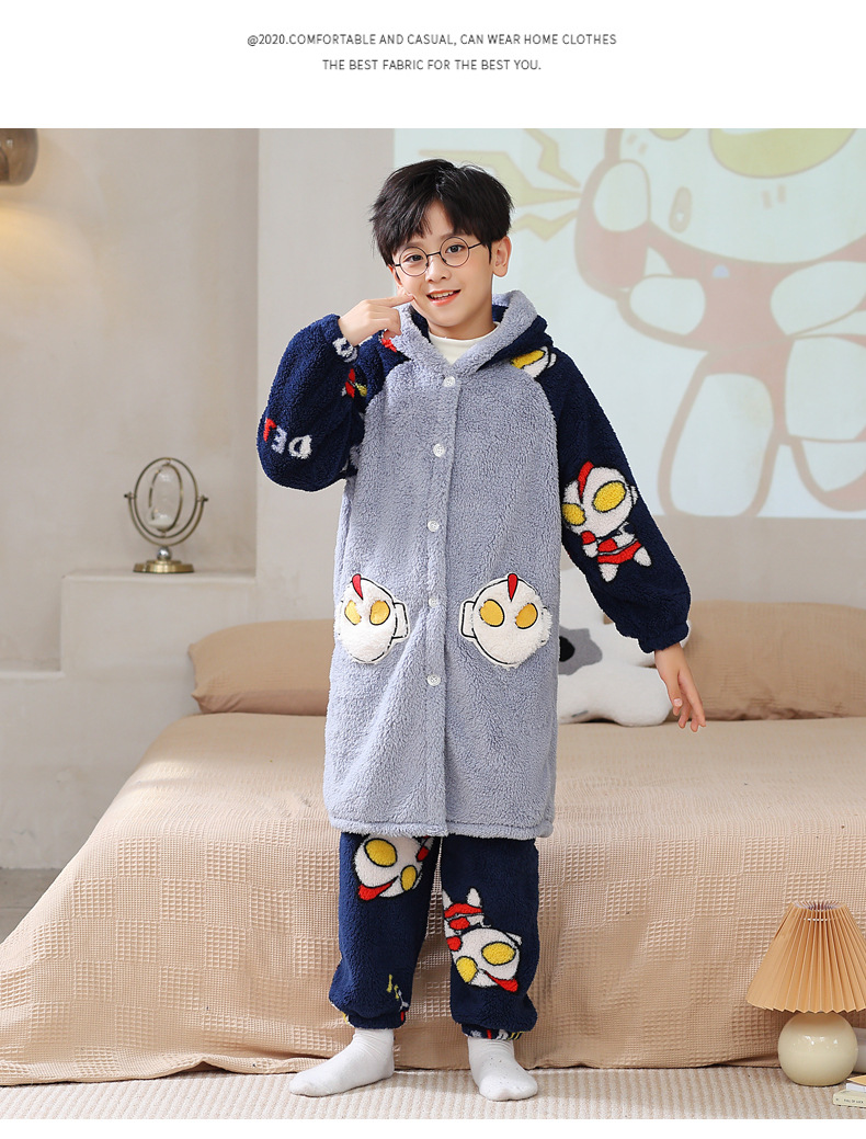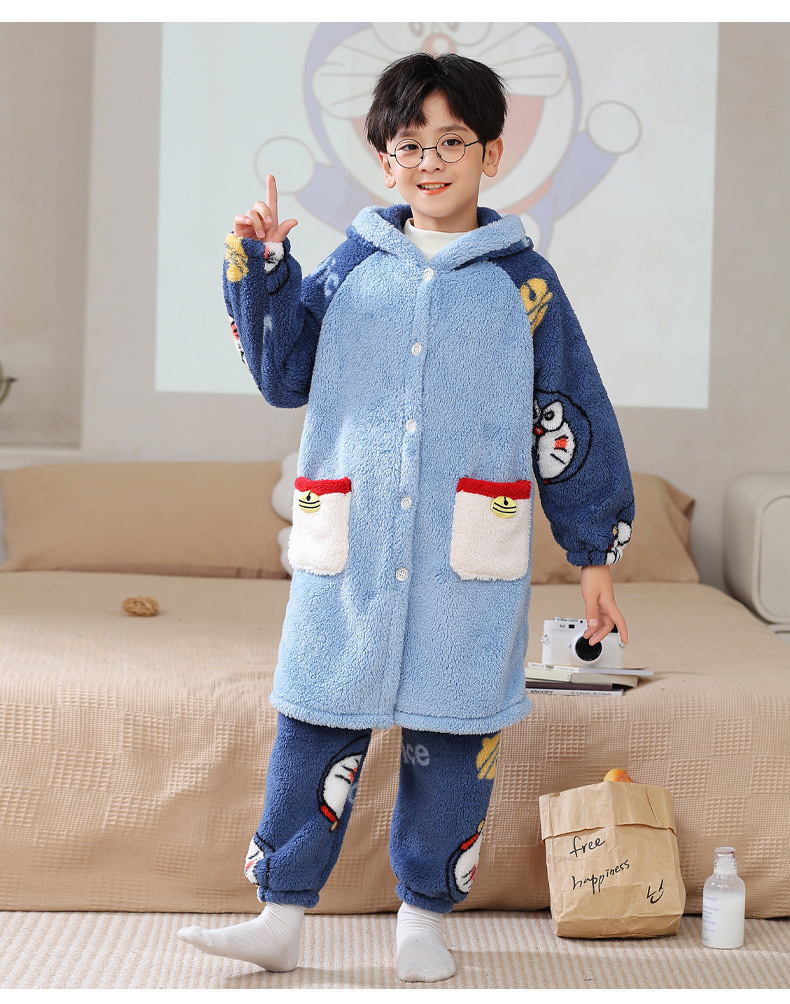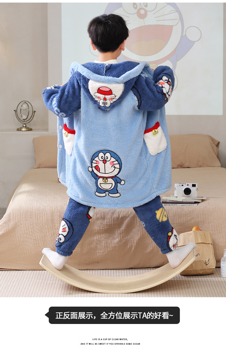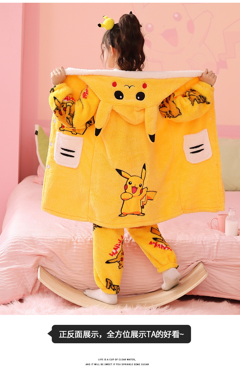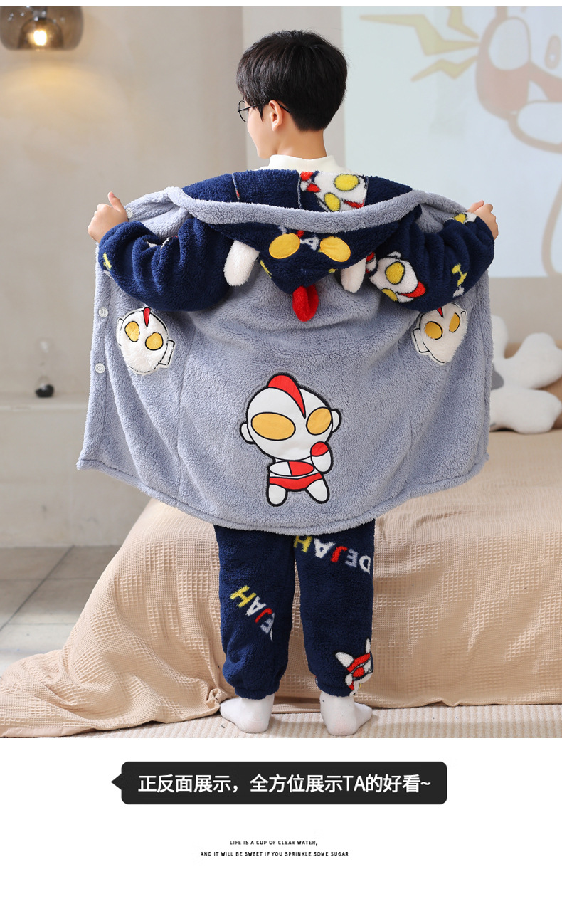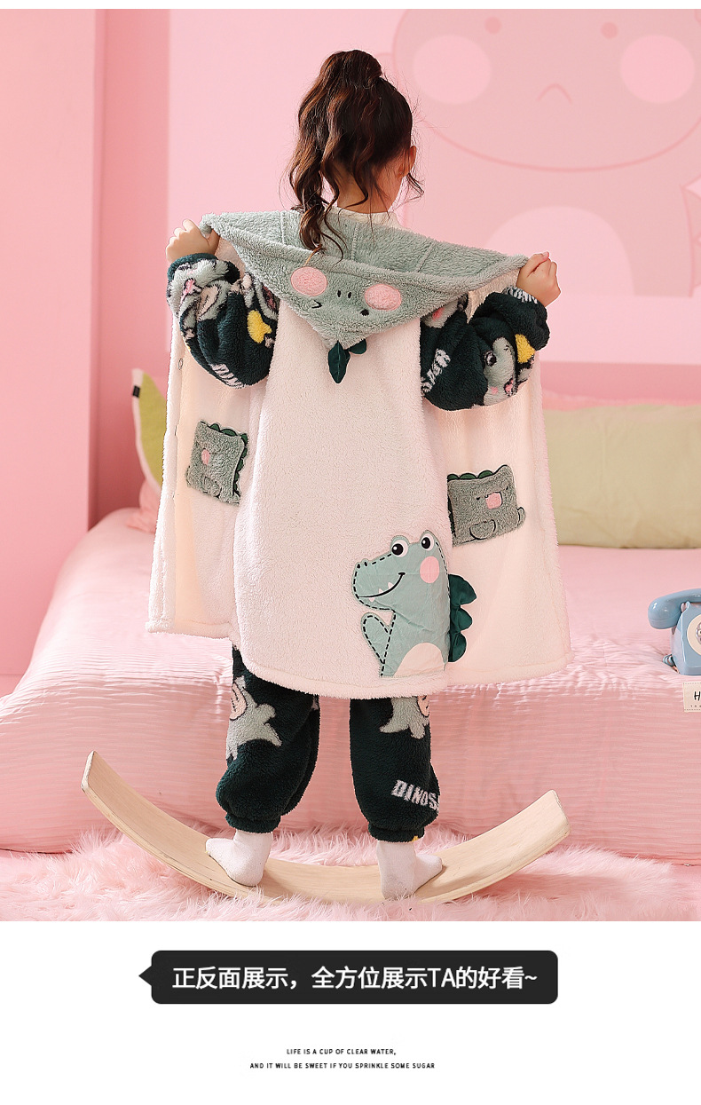 珊瑚绒儿童睡袍秋冬季中大童加厚长款法兰绒卡通熊男女童睡衣套装