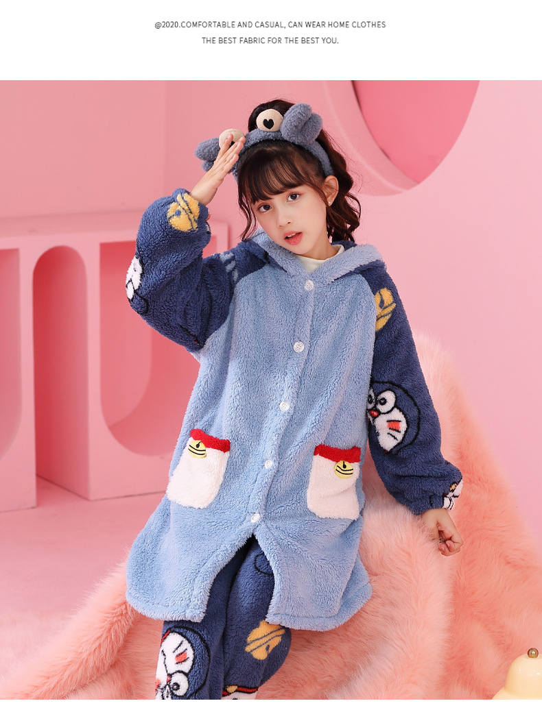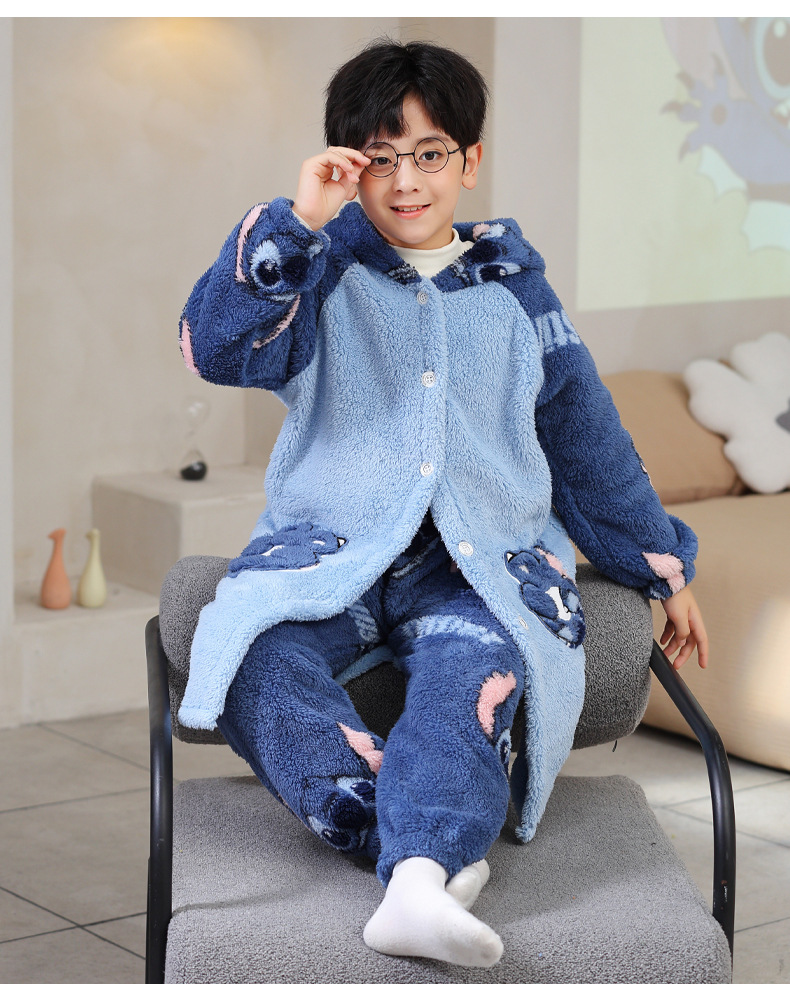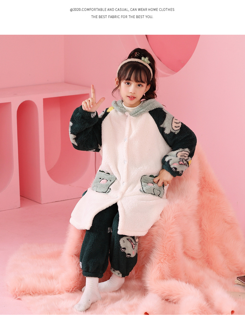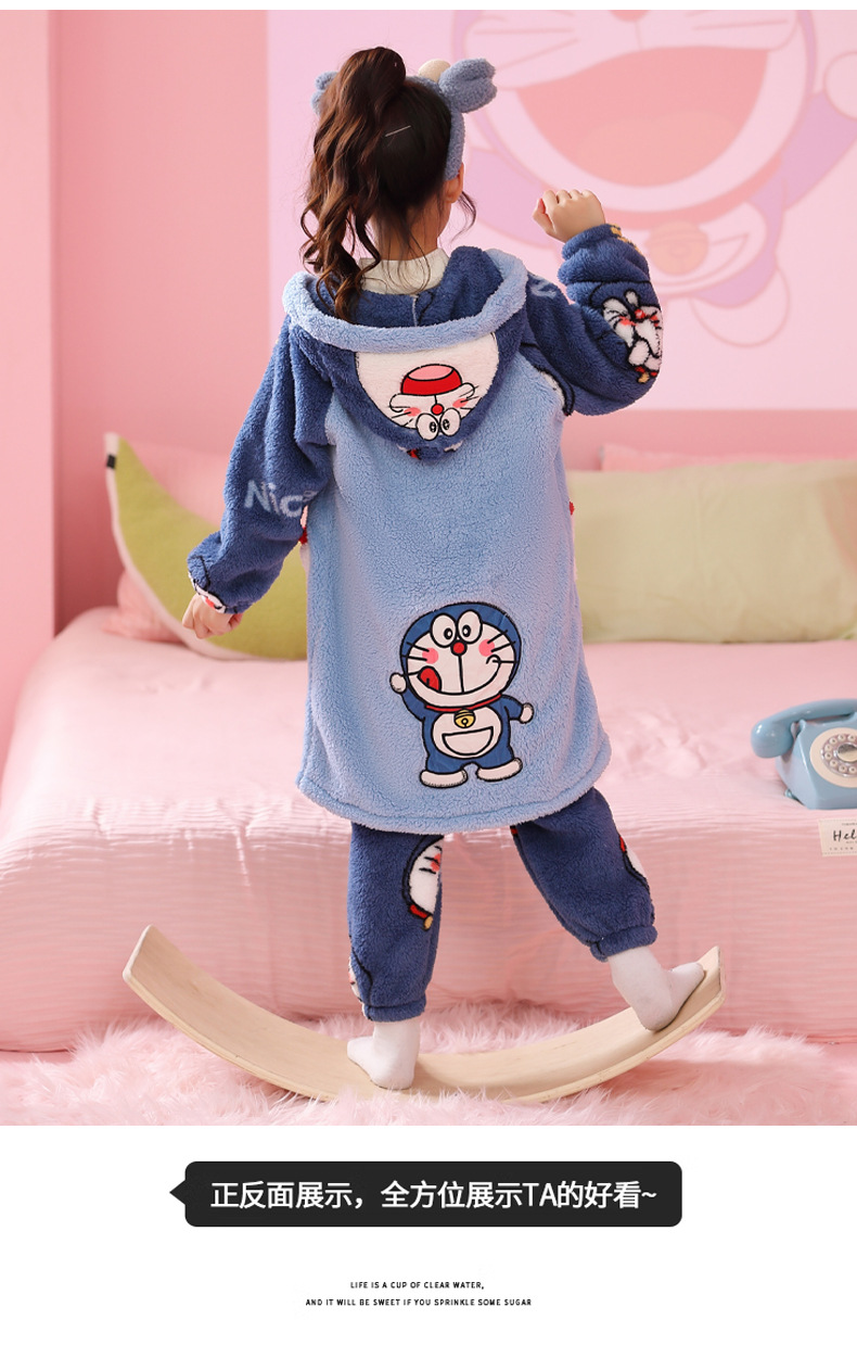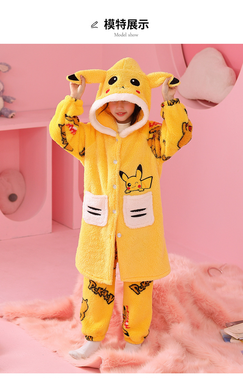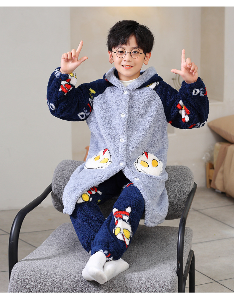 珊瑚绒儿童睡袍秋冬季中大童加厚长款法兰绒卡通熊男女童睡衣套装