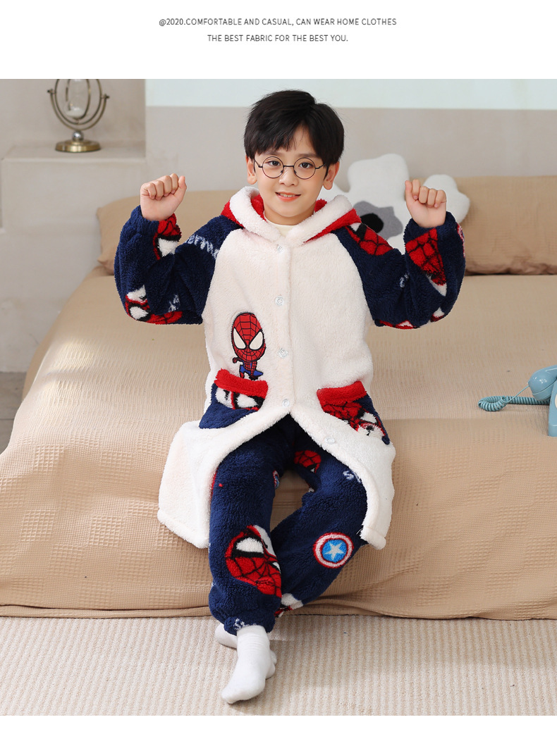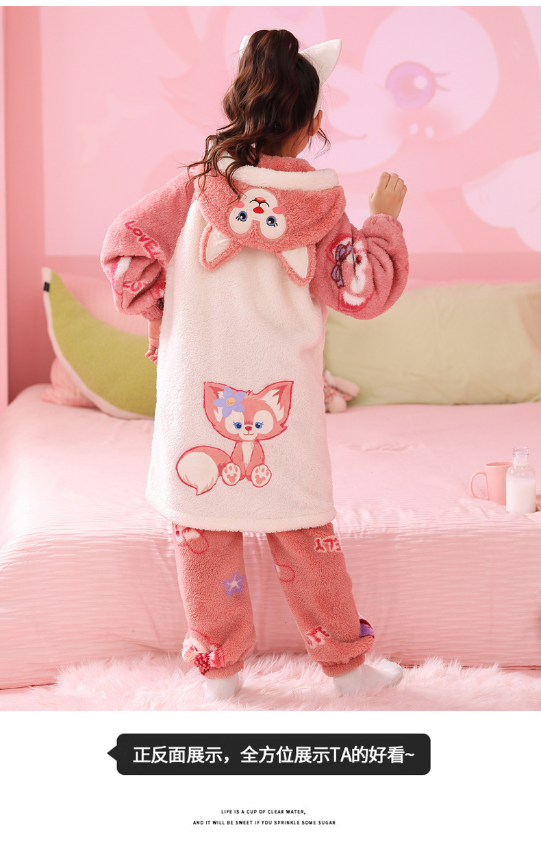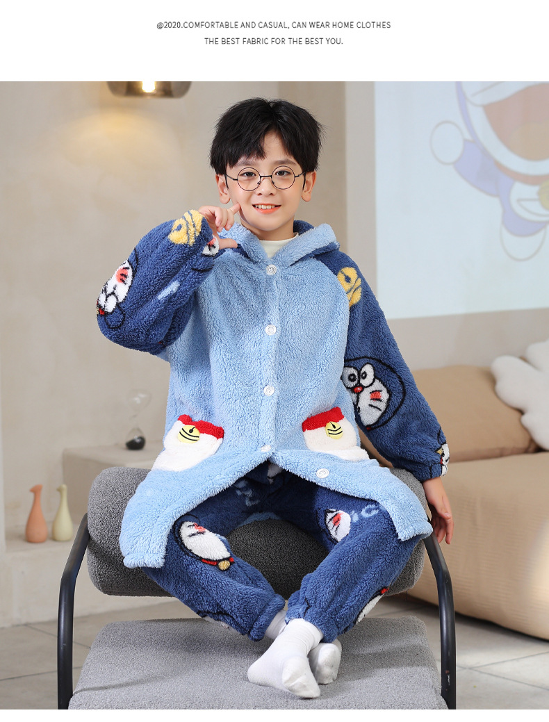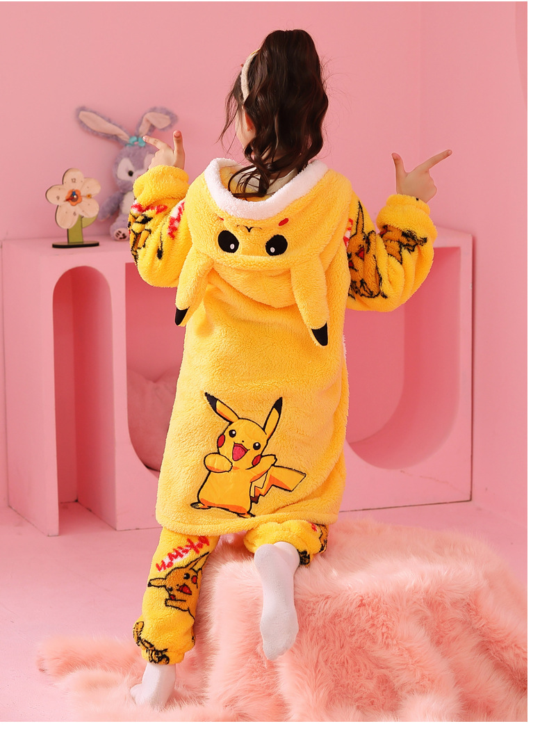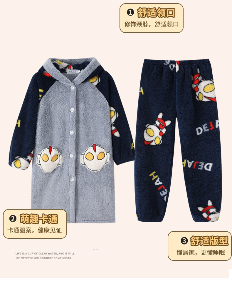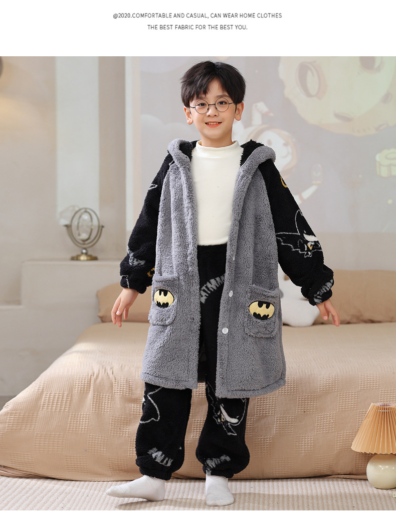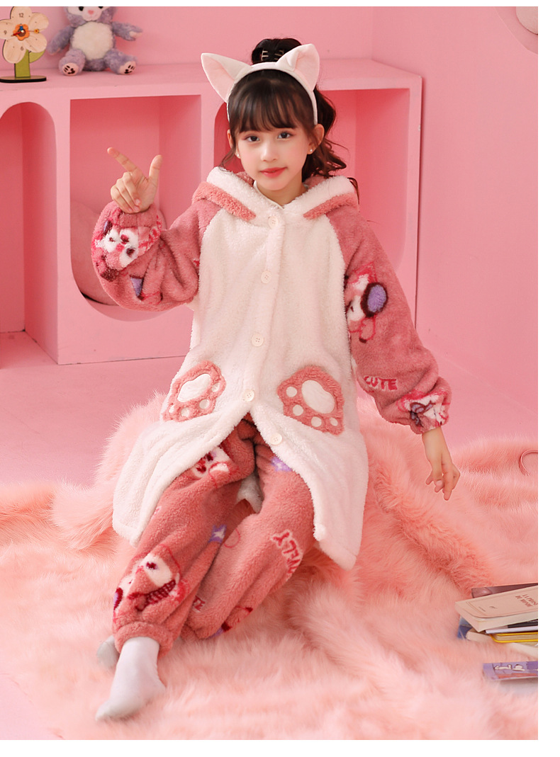 珊瑚绒儿童睡袍秋冬季中大童加厚长款法兰绒卡通熊男女童睡衣套装