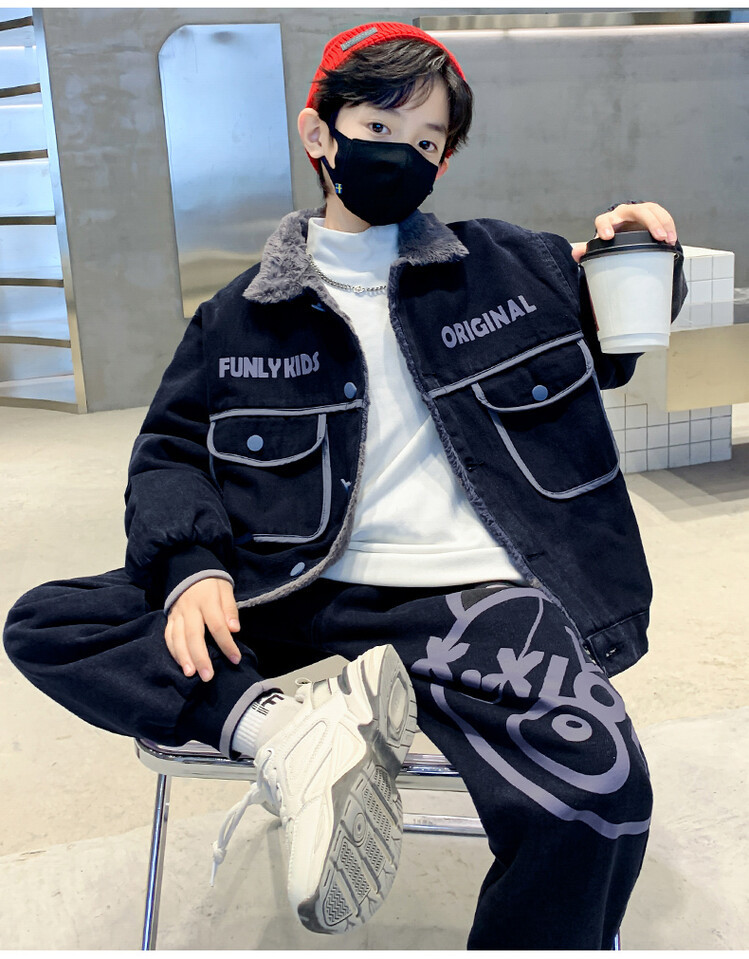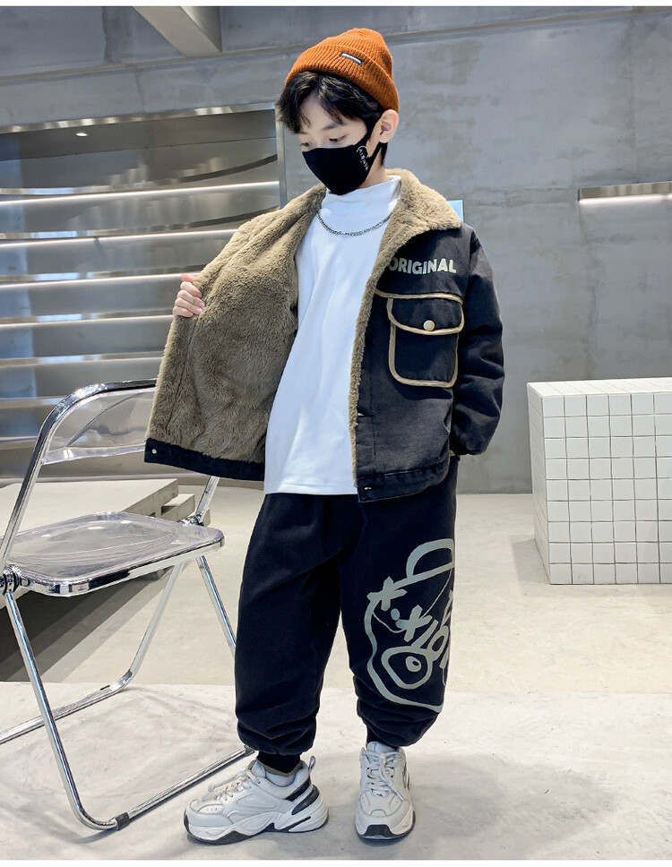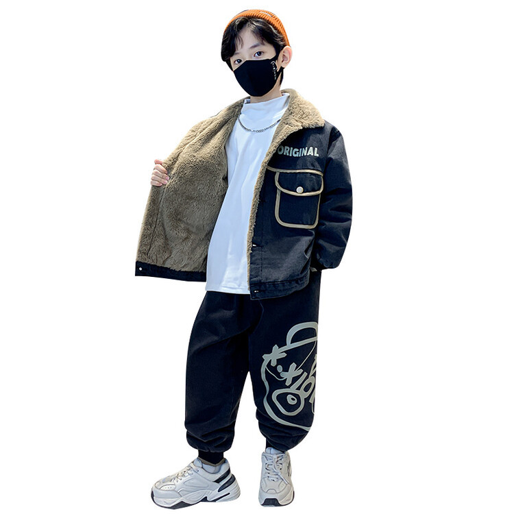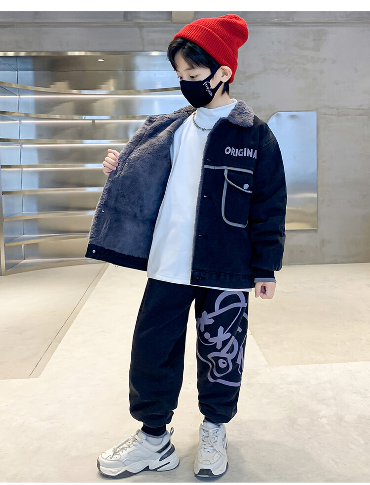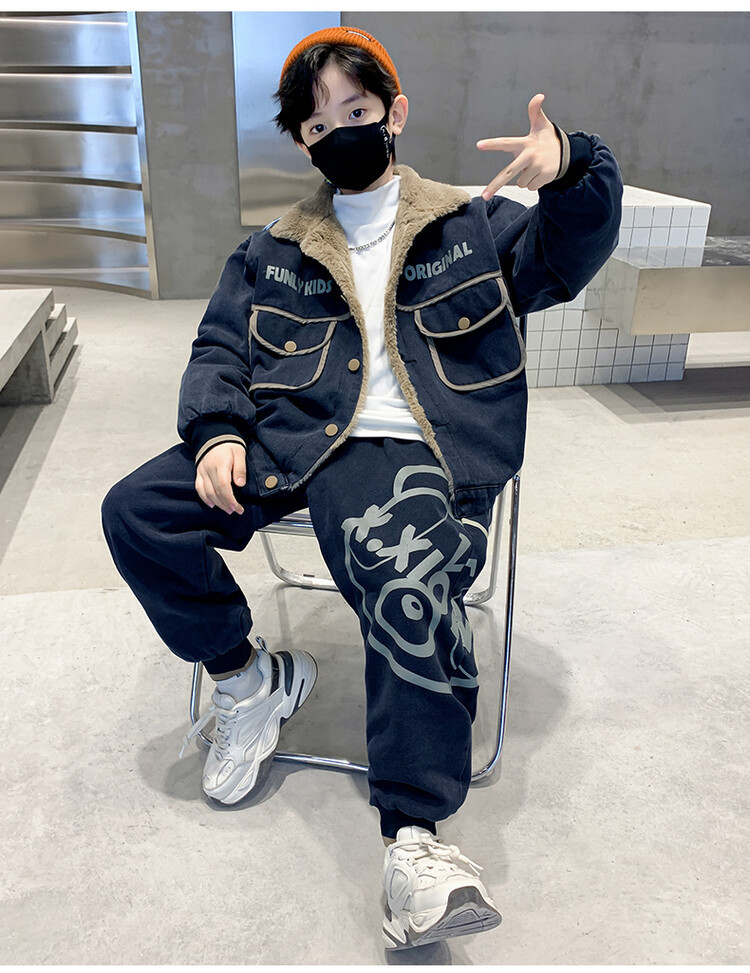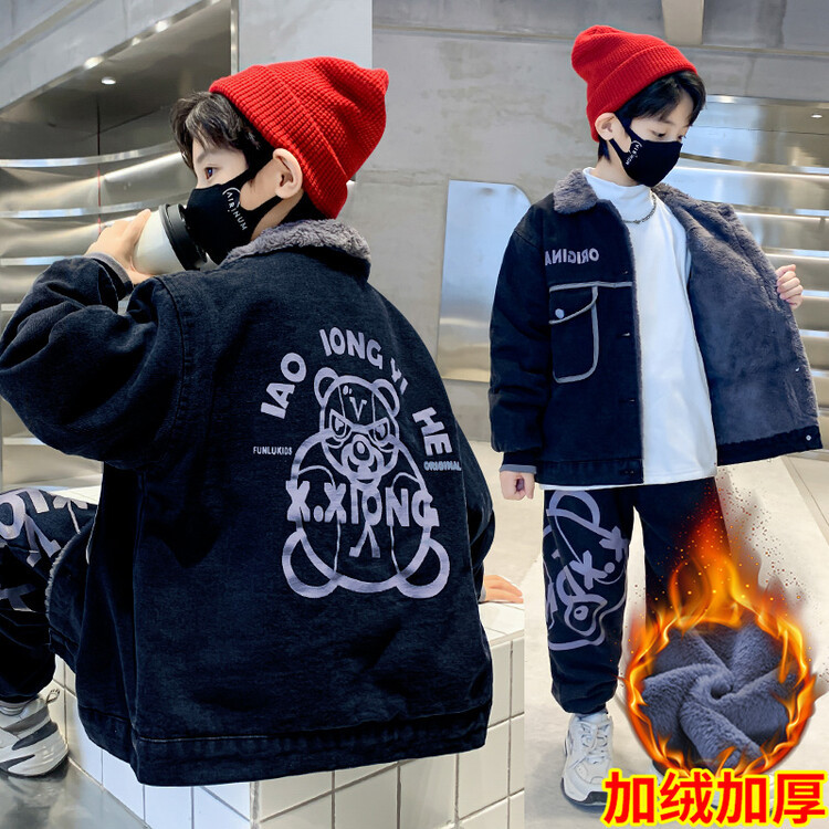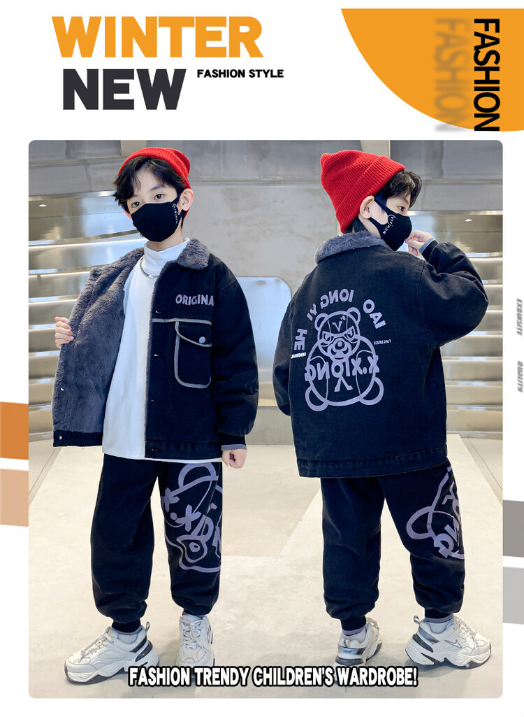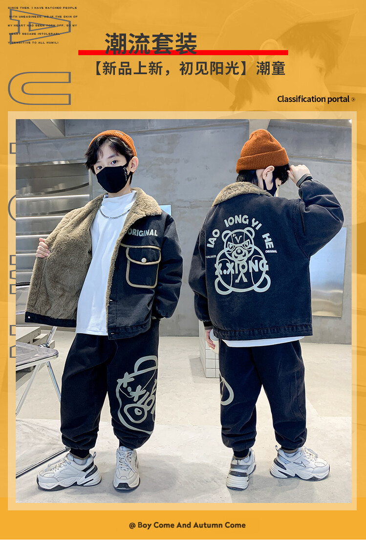 儿童装男童冬装套装加绒2024新款酷帅气男孩秋冬大童牛仔加厚冬季