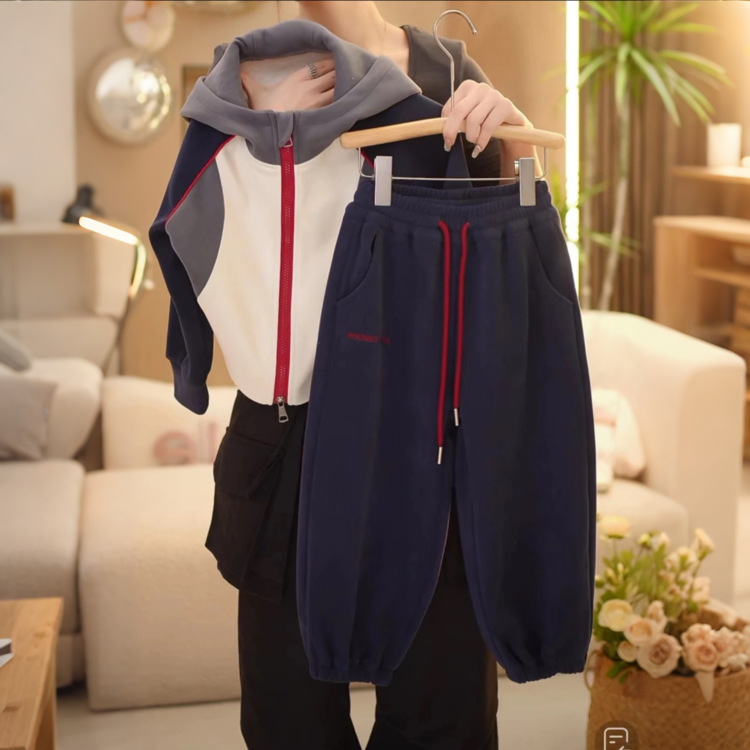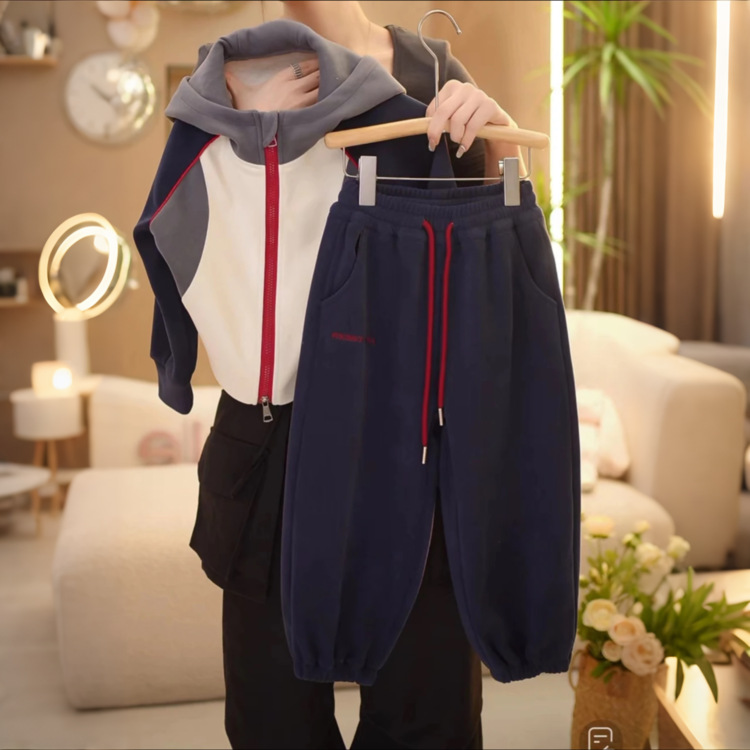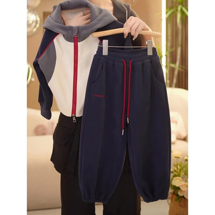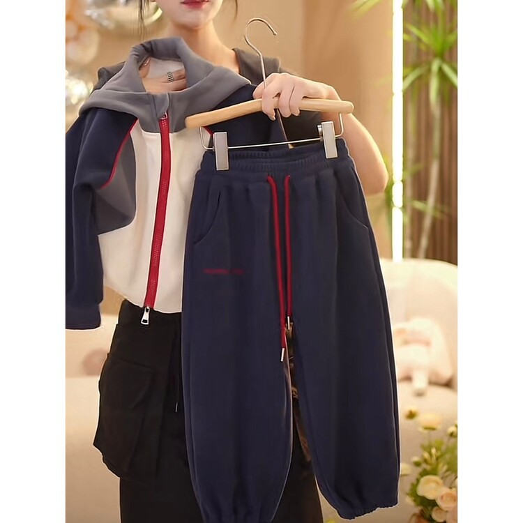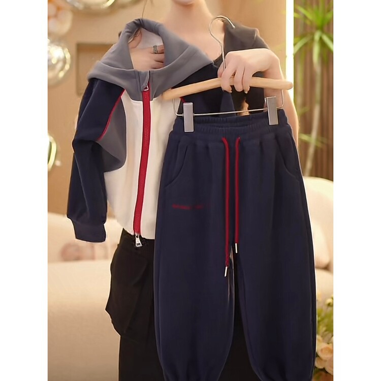 【高品质】2024秋季新款时尚韩版休闲宽松拼色连帽休闲外套套装
