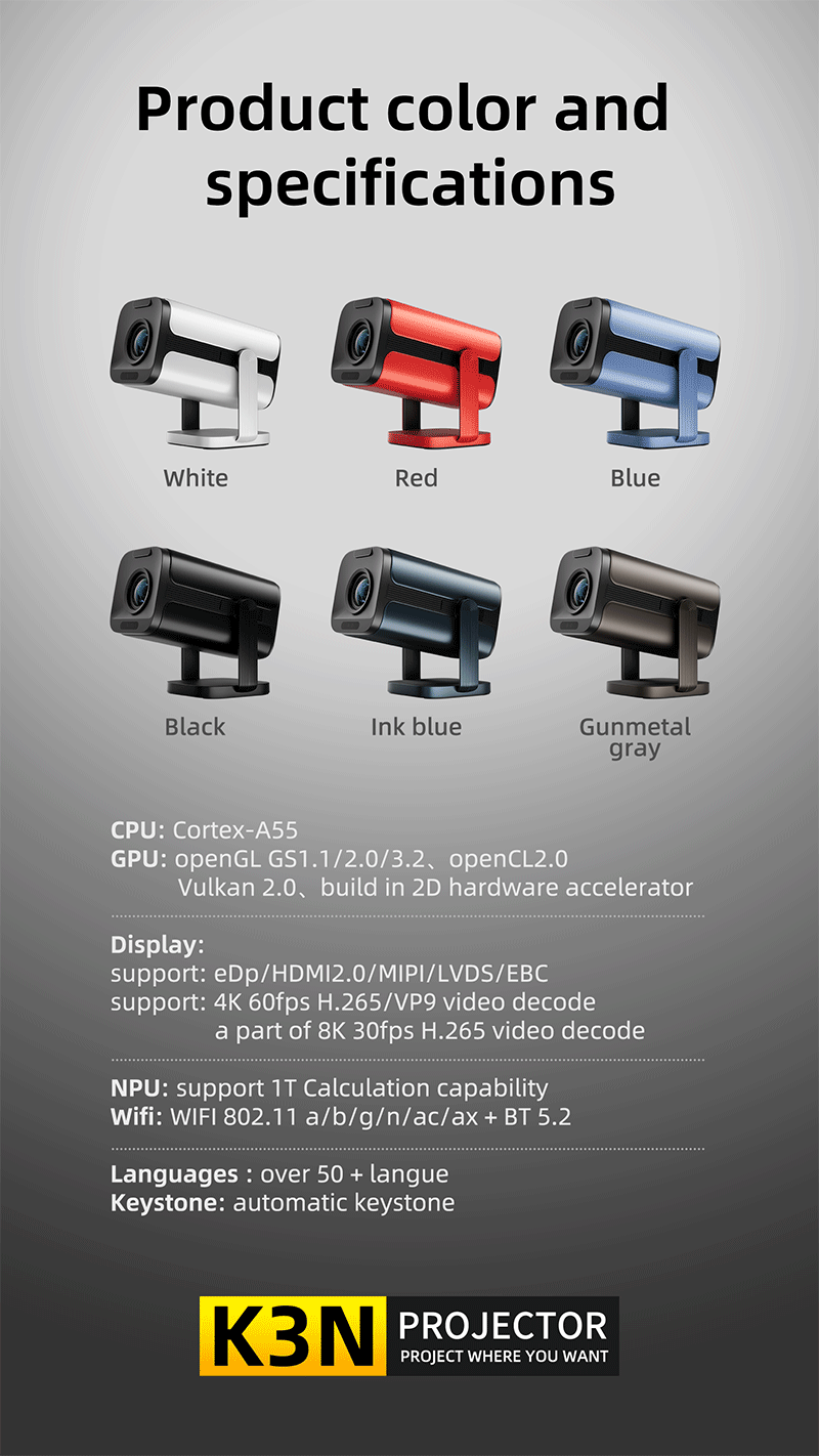 跨境新款K3N投影仪家庭影院高流明4K家用云台高清投影机卧室用投