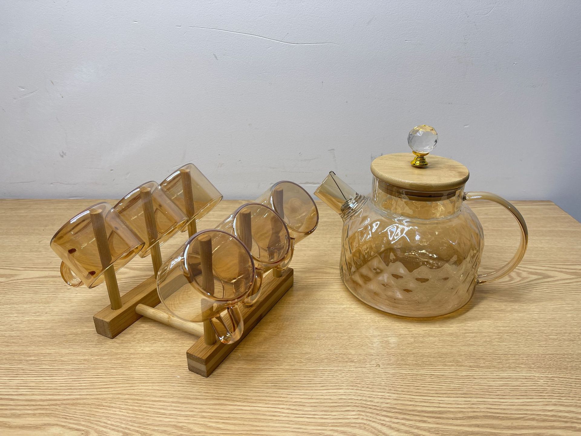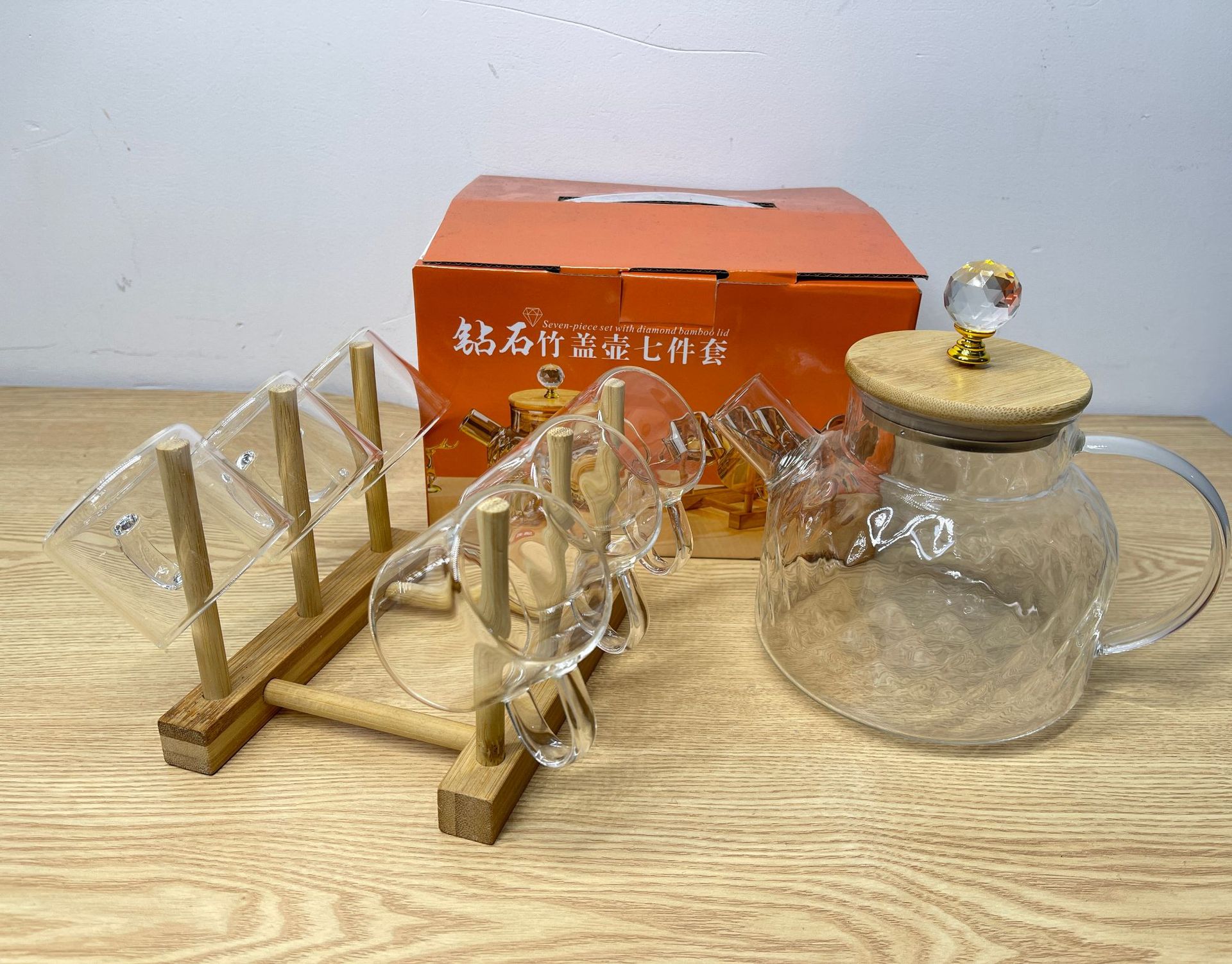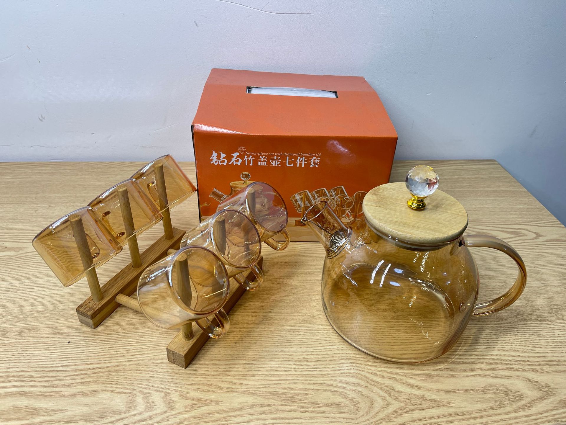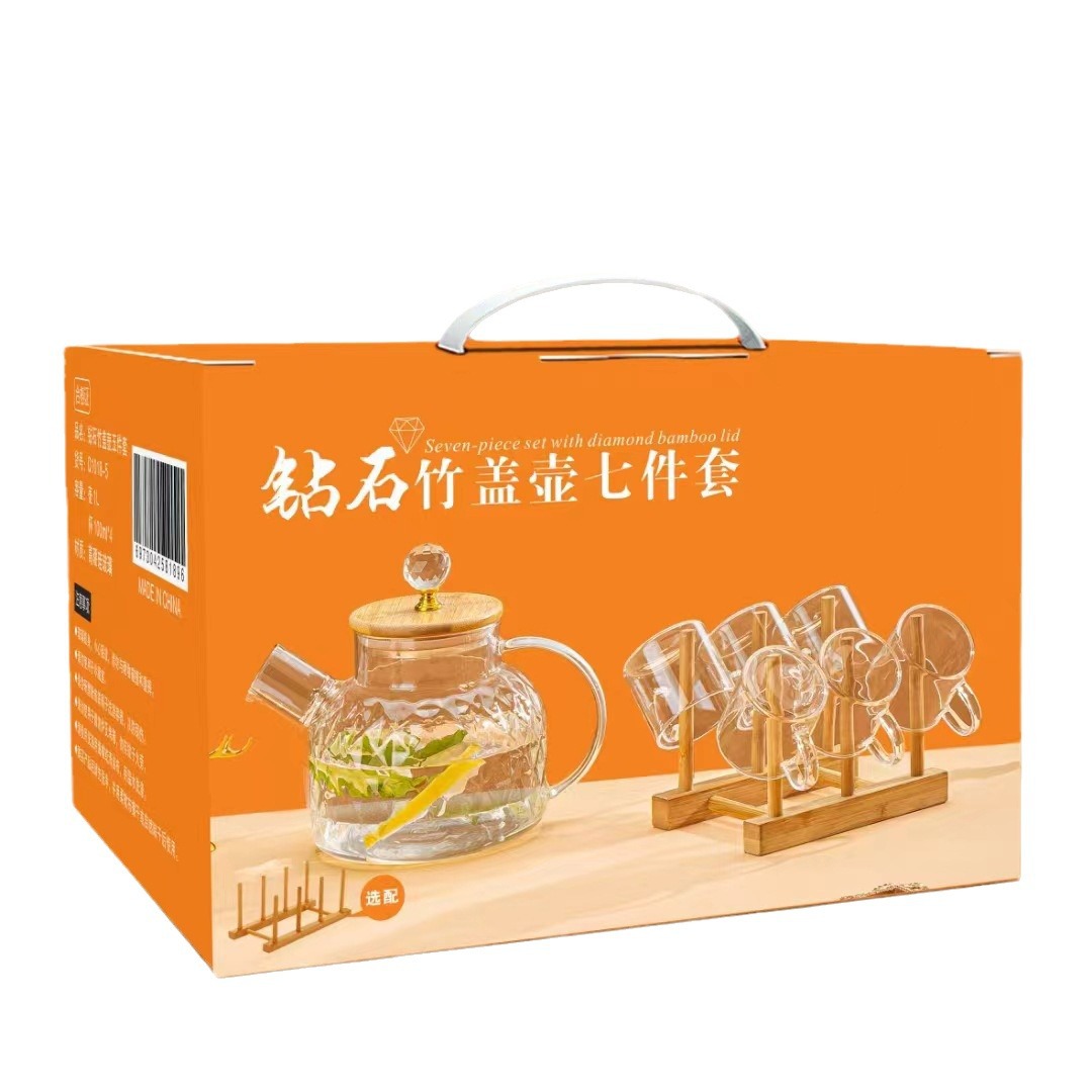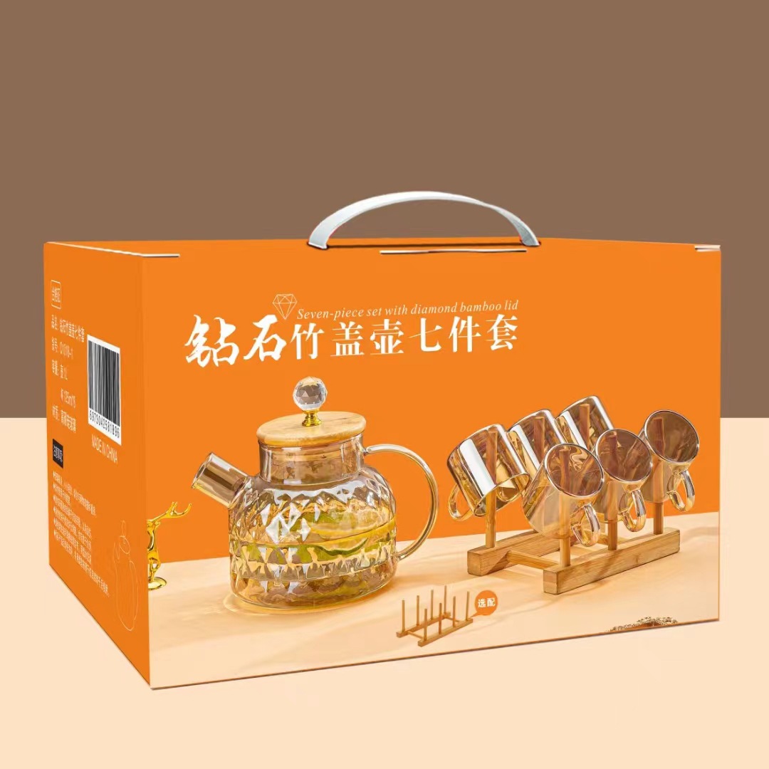 高硼硅耐热玻璃钻石竹盖水具七件套琥珀色透明色