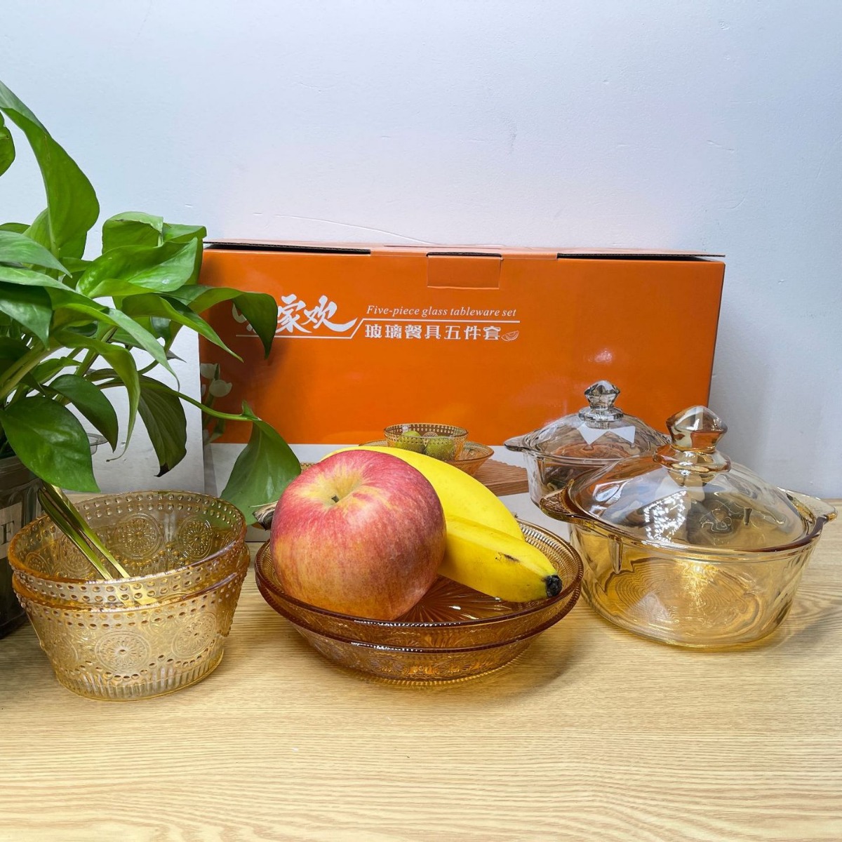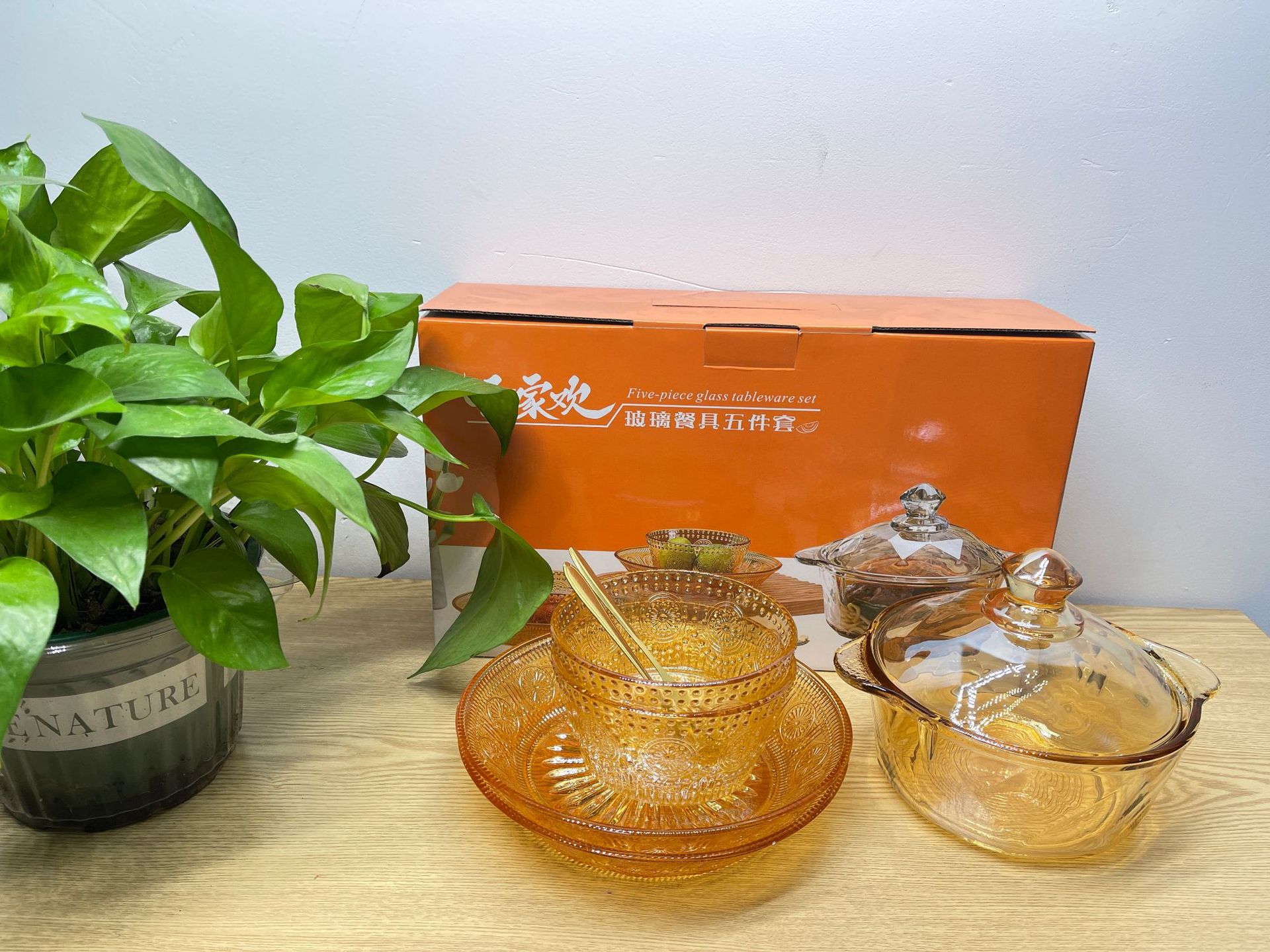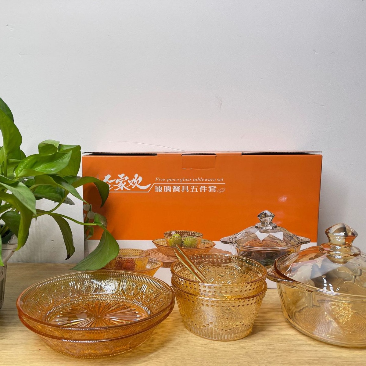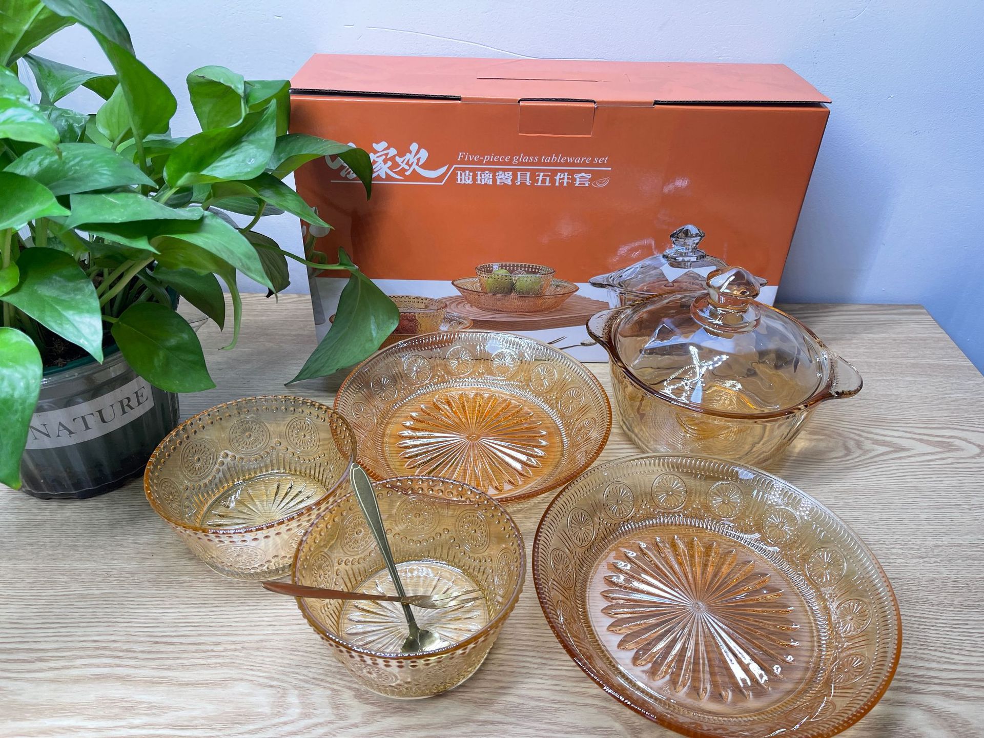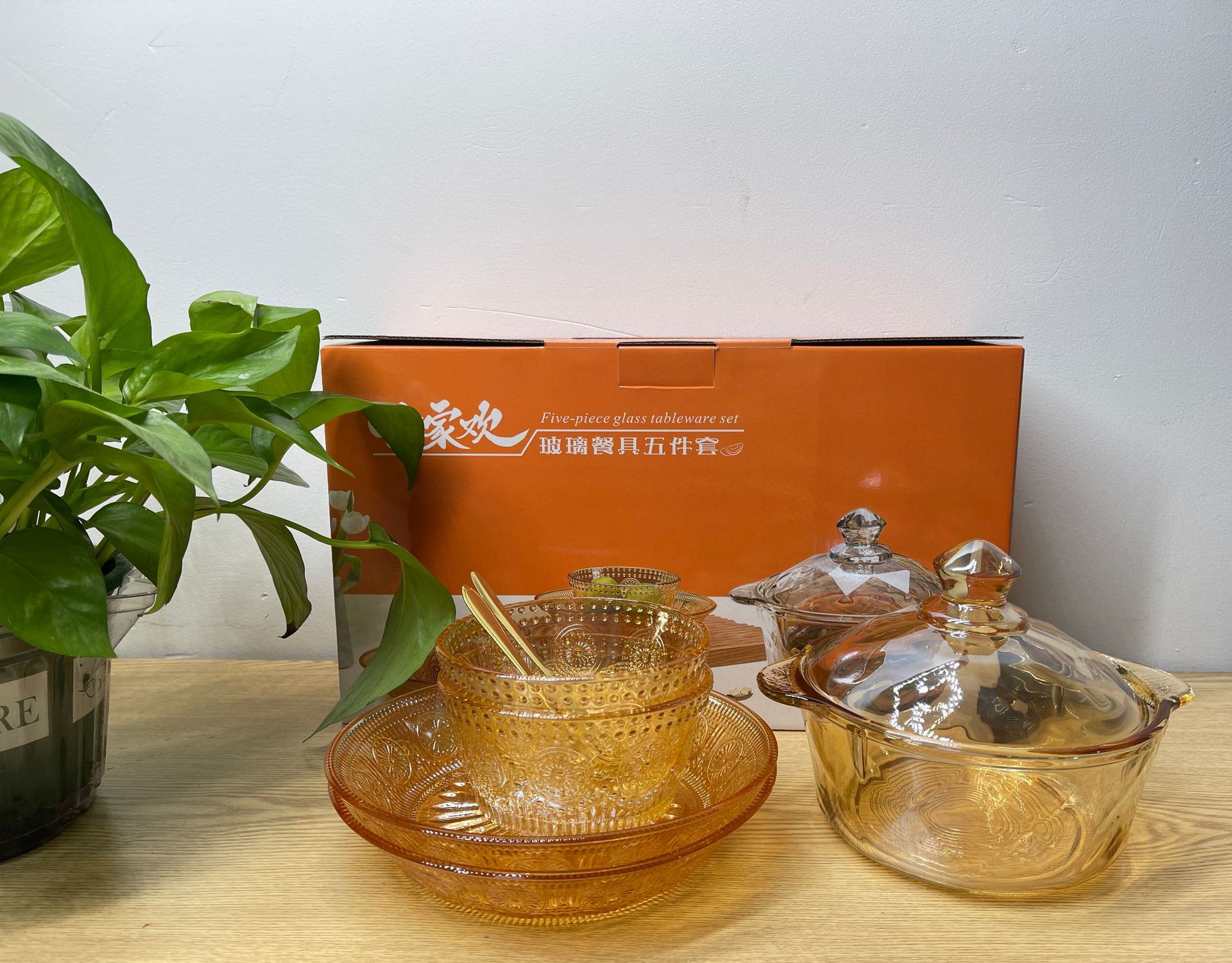 琥珀色玻璃钻石煲配浮雕太阳花碗盘套装酒店用品