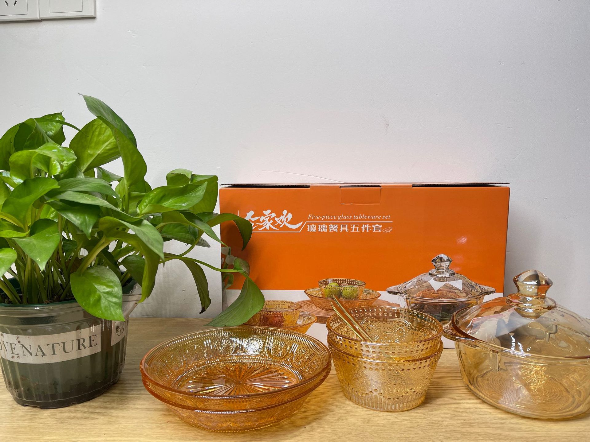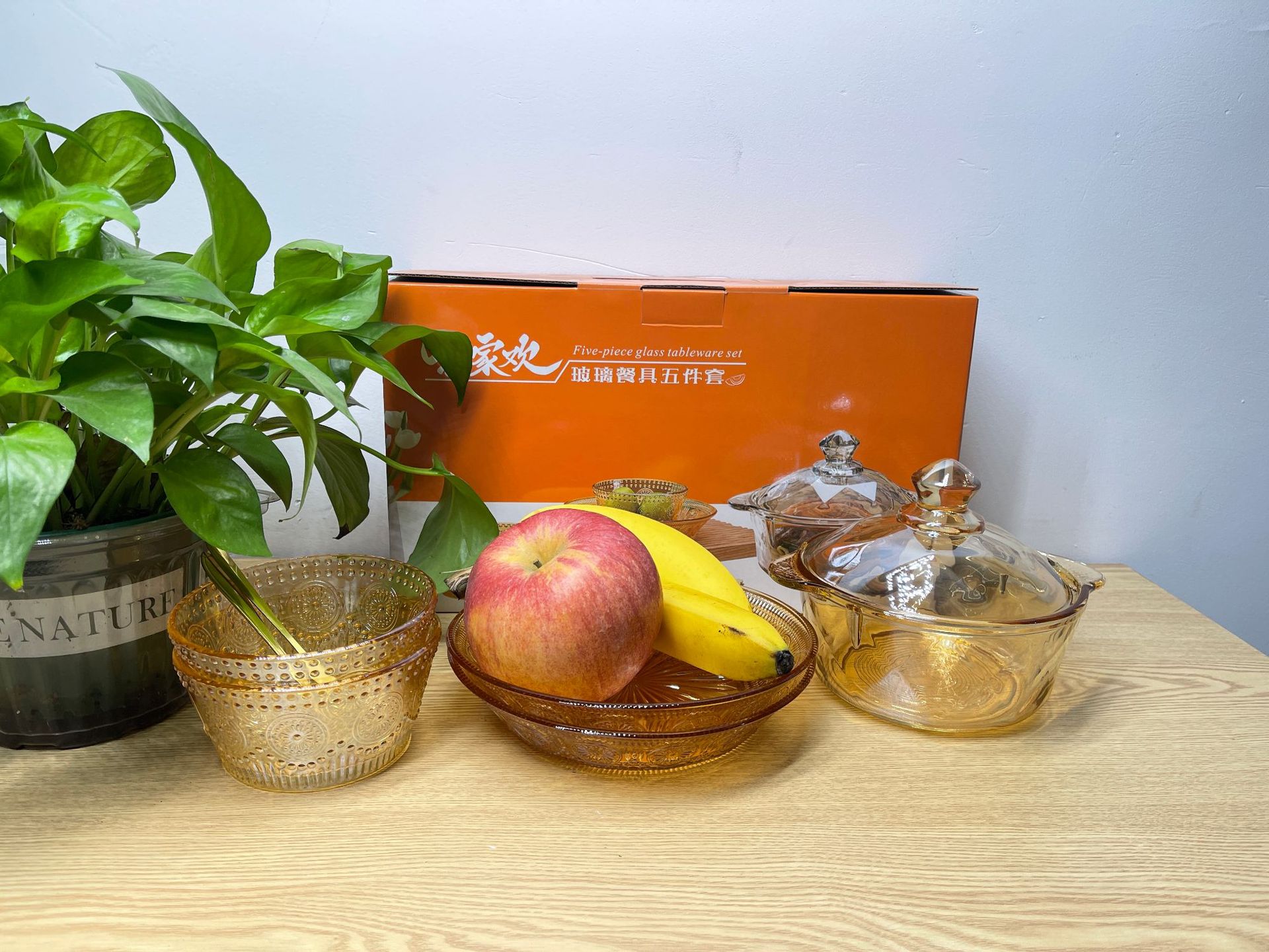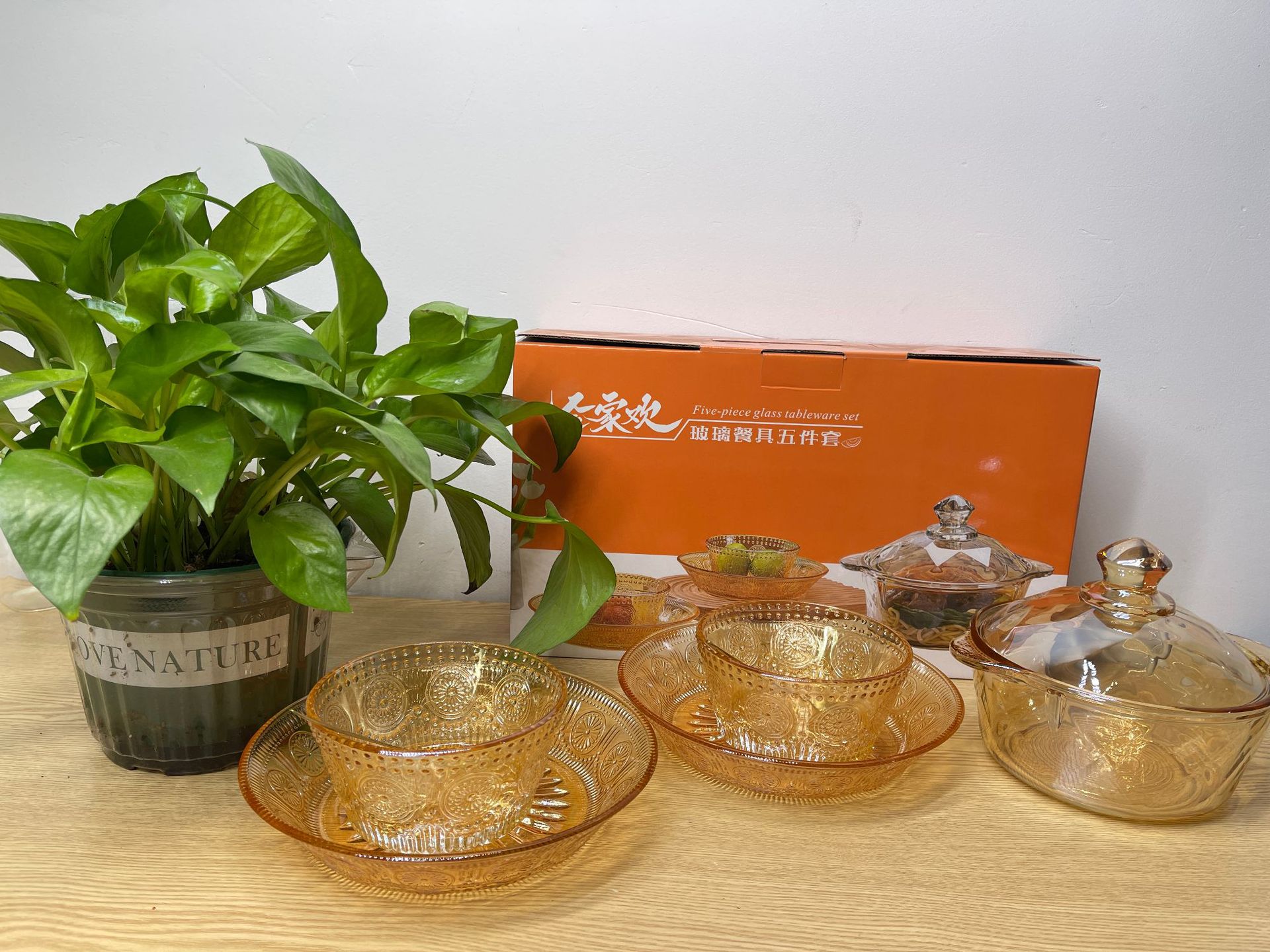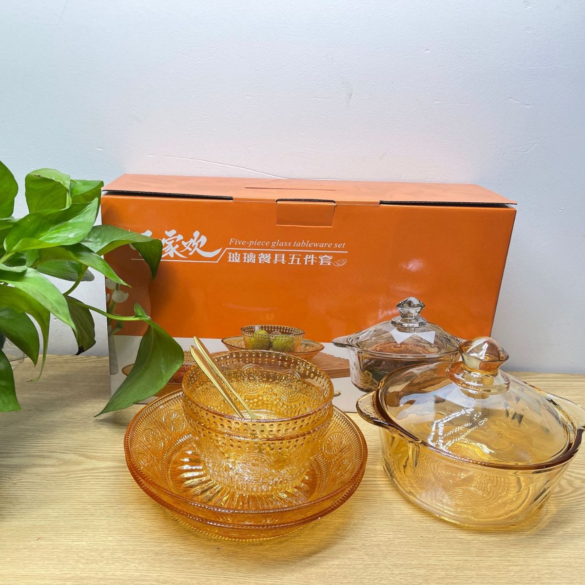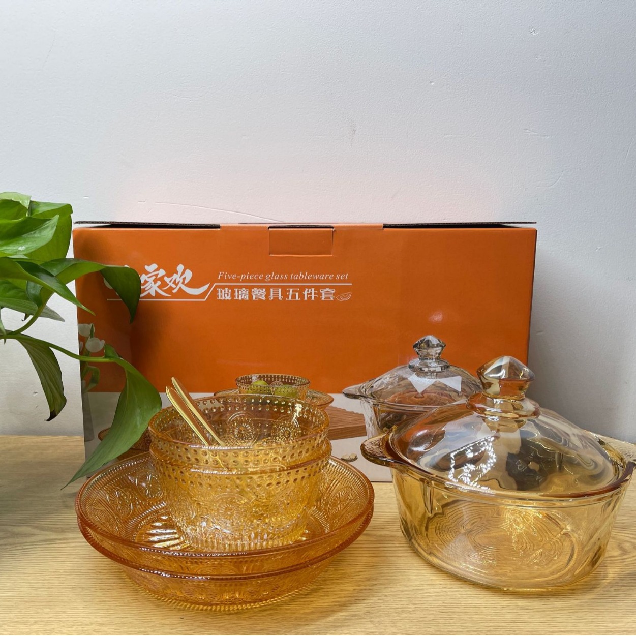 琥珀色玻璃钻石煲配浮雕太阳花碗盘套装酒店用品