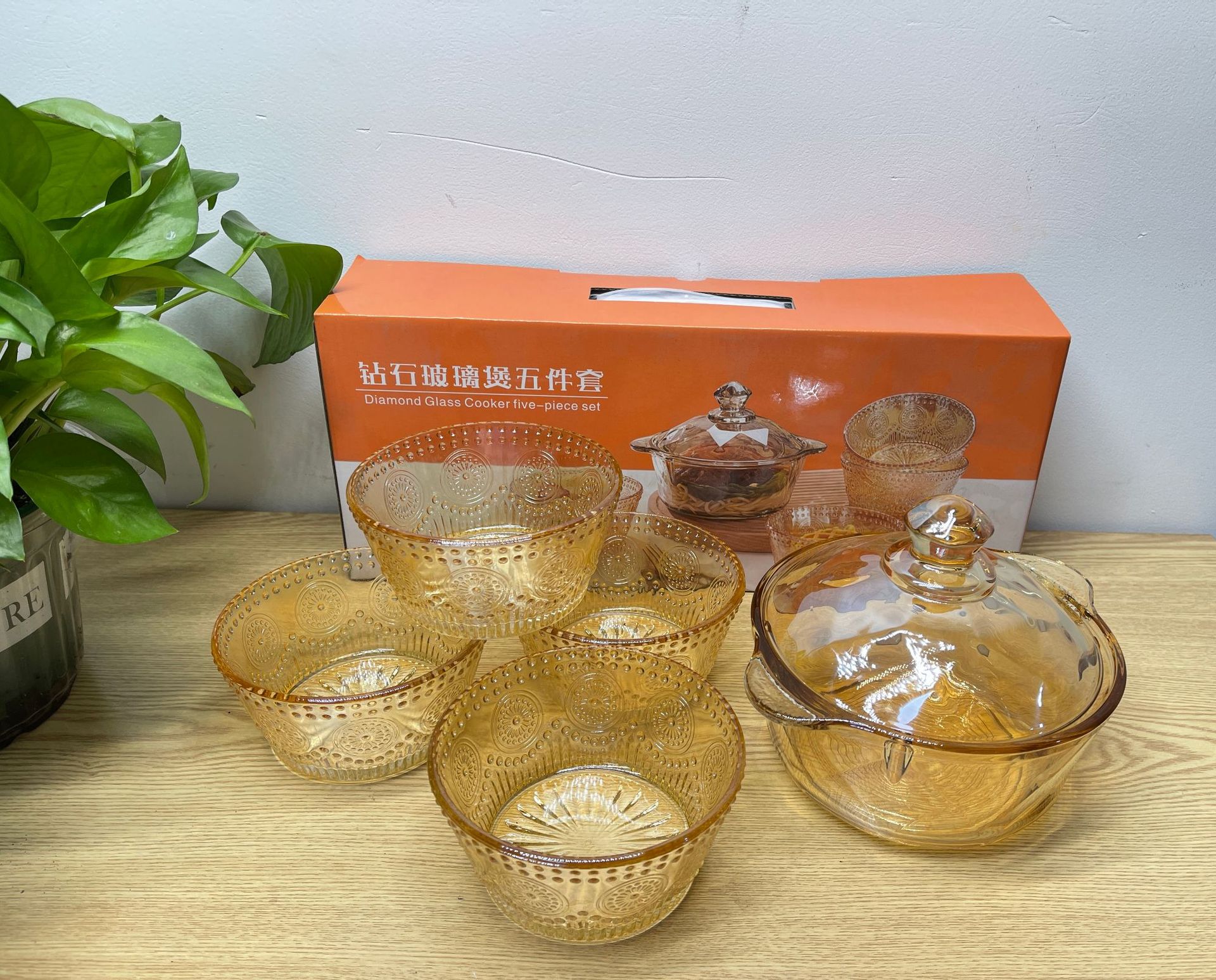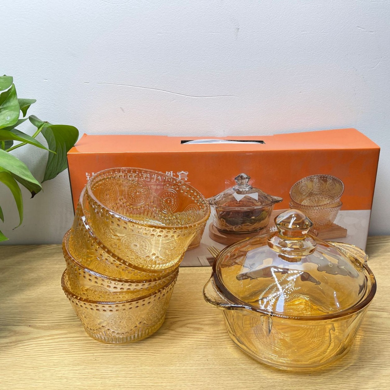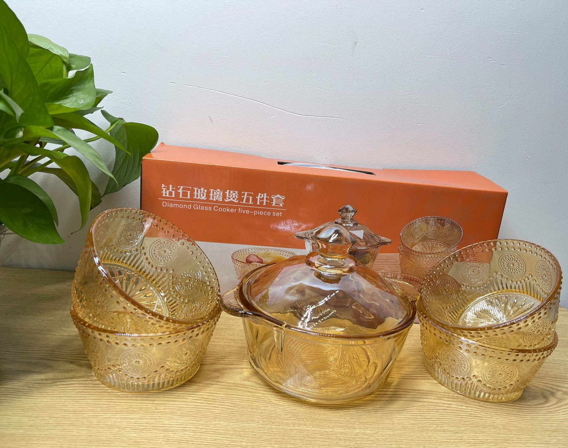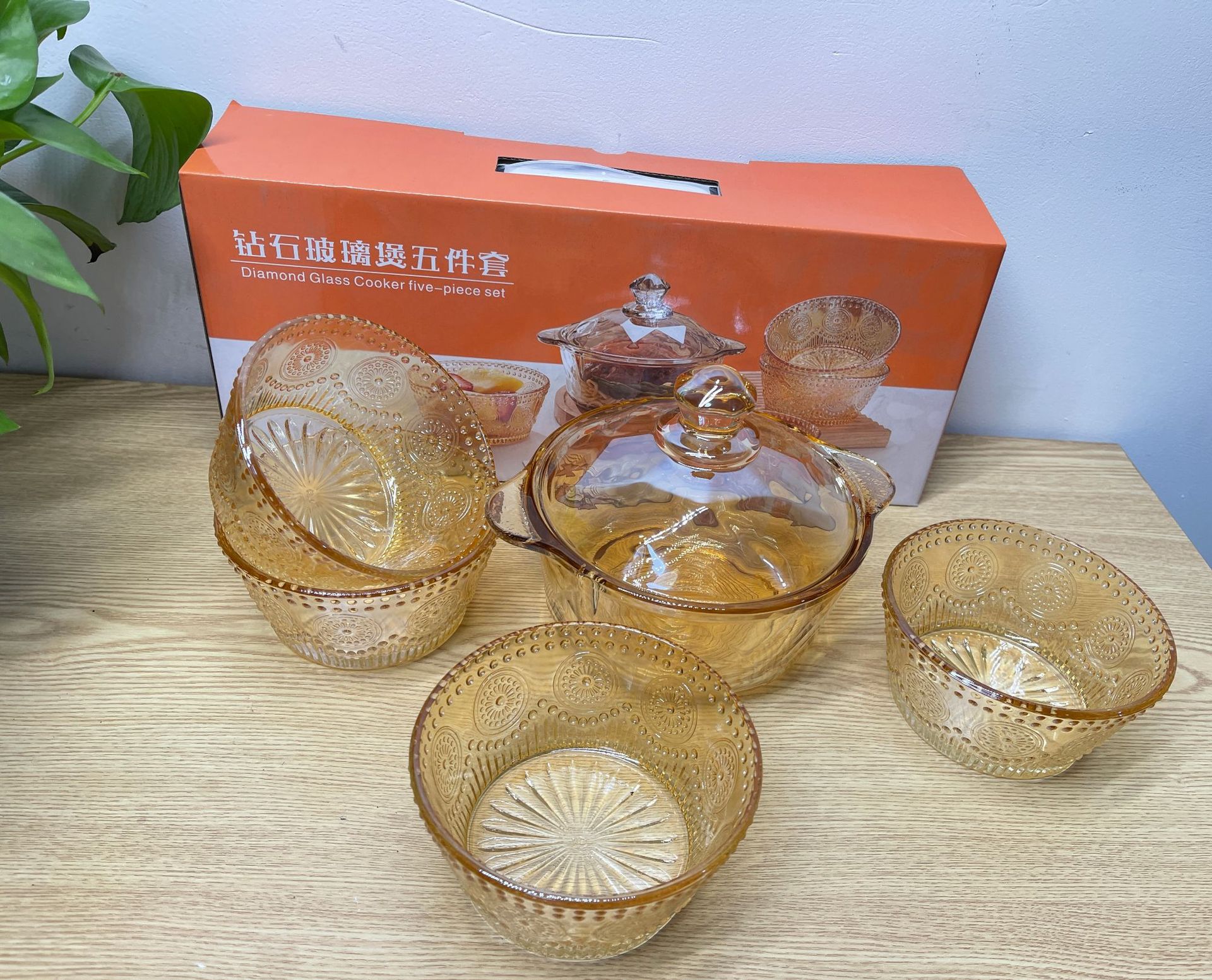 琥珀色玻璃钻石煲碗配浮雕太阳花碗套装