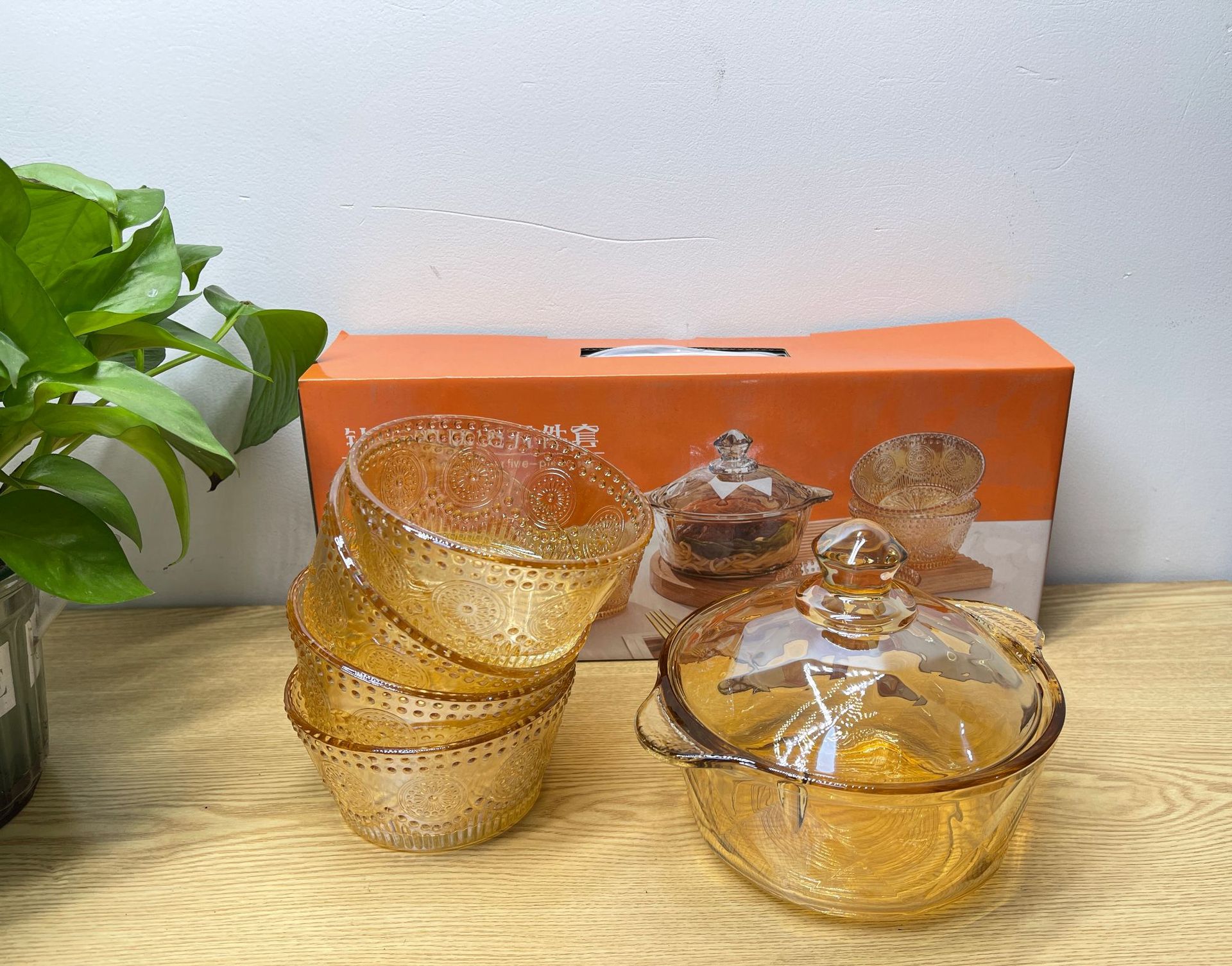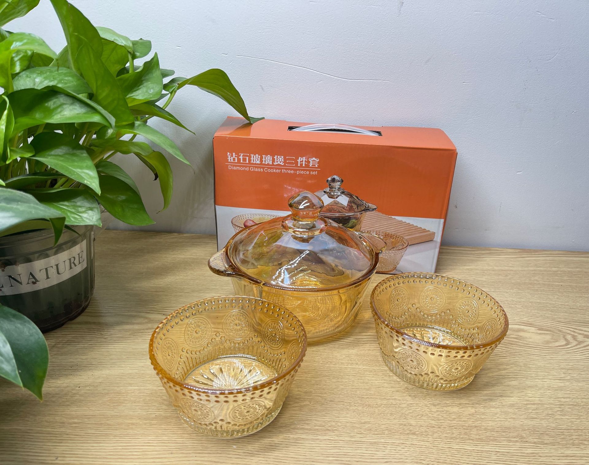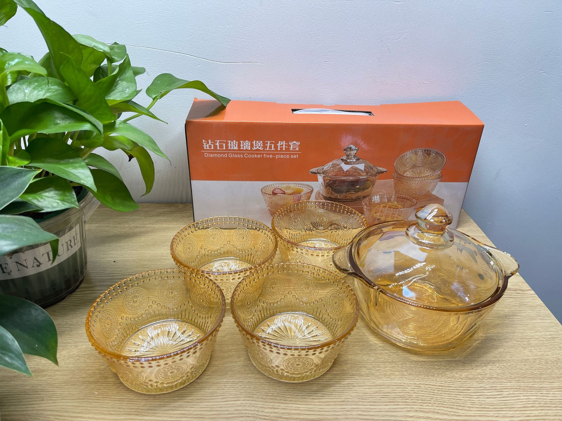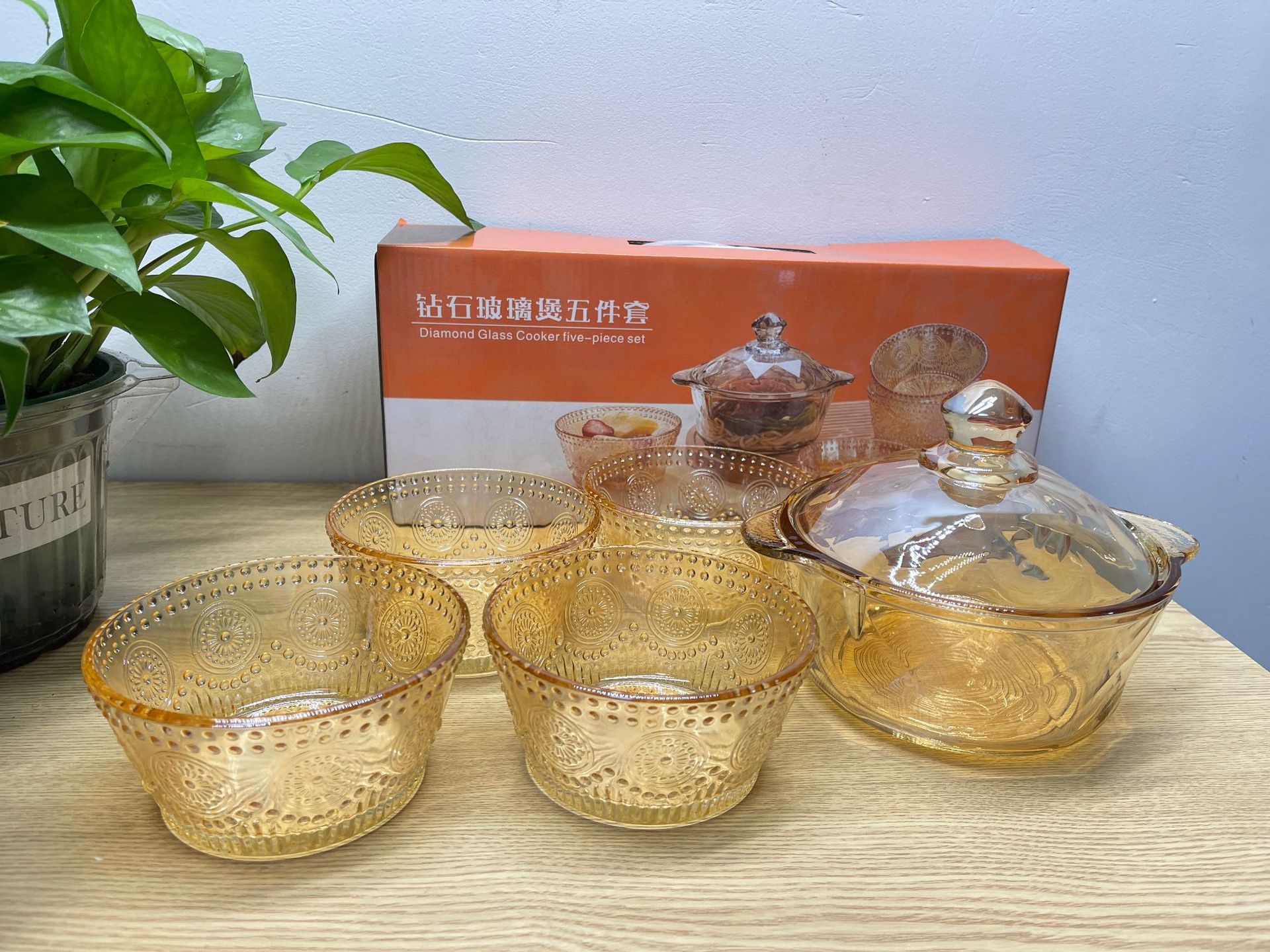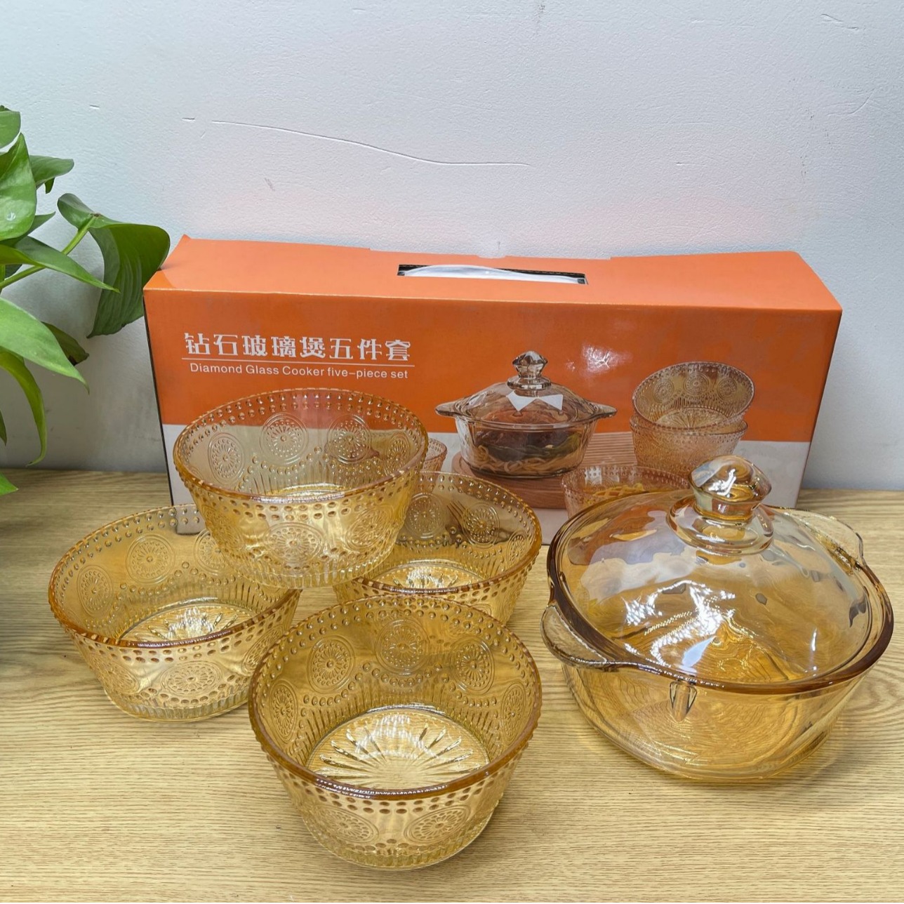琥珀色玻璃钻石煲碗配浮雕太阳花碗套装